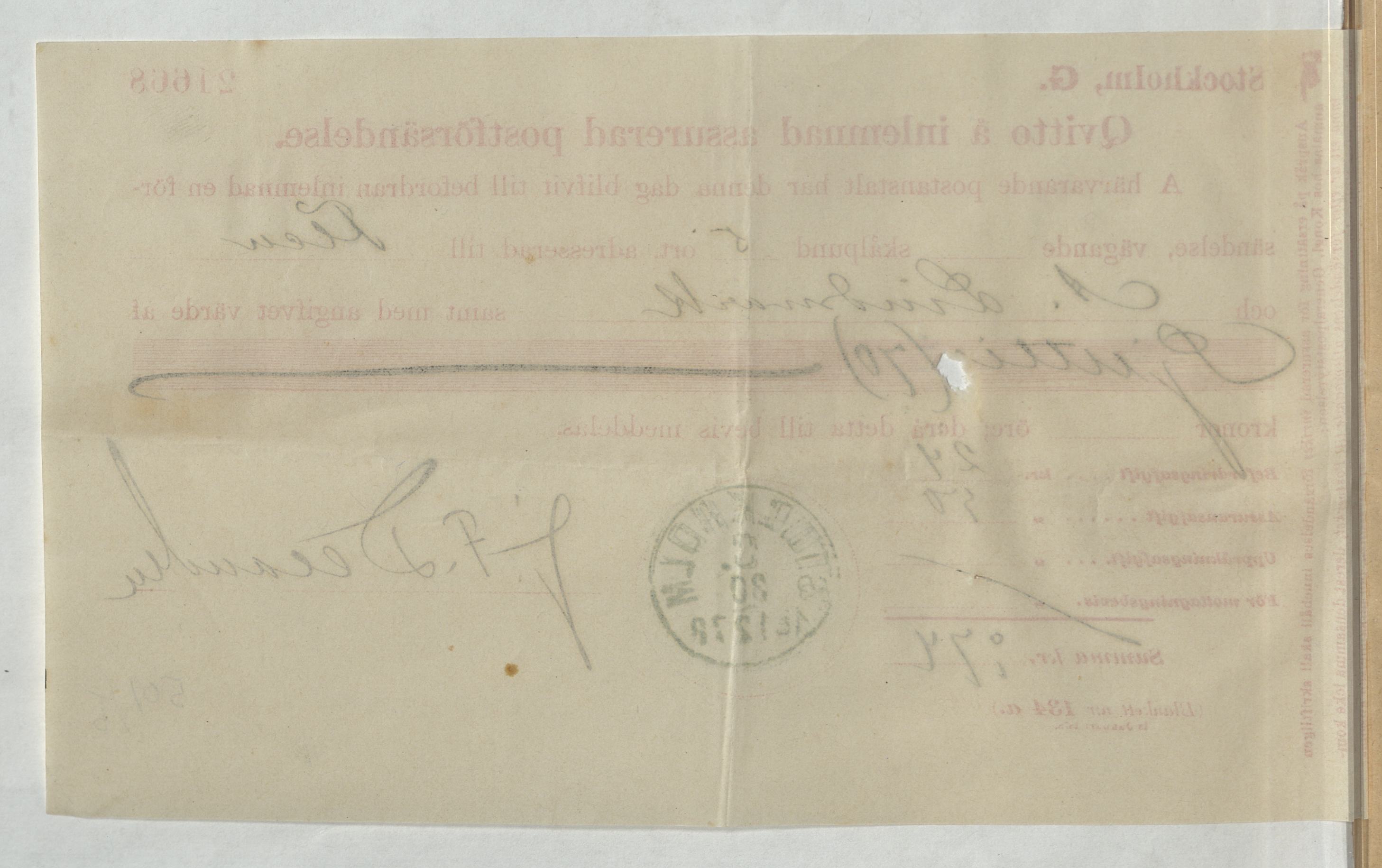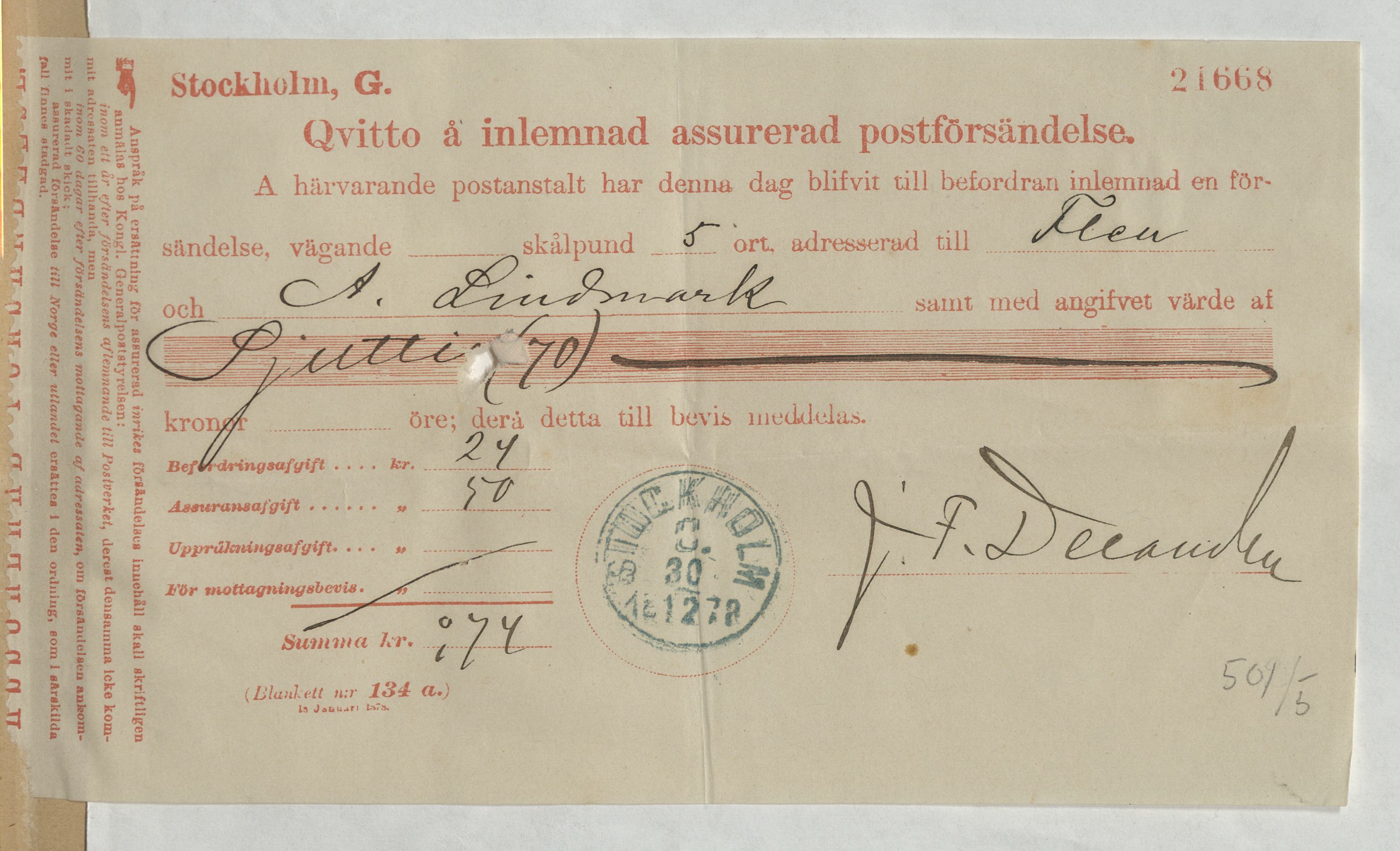 Kvitto för inlämnad assurerad postförsändelse från A. F. Lindmark, Skomakare