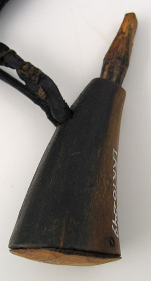 Kruthorn av gulsvart, svagt svängt och koniskt horn. Rund bottenplatta täljd i trä, fäst med två stift. I ryggen borrat hål med genomdragen läderrem, fästad i krutygets mässingsögla. Upptill i pipen träplugg.