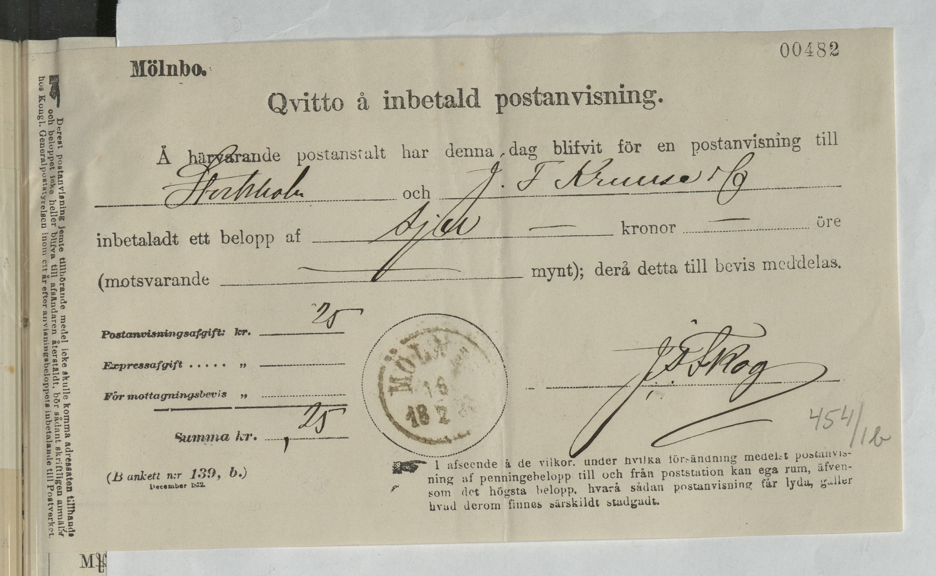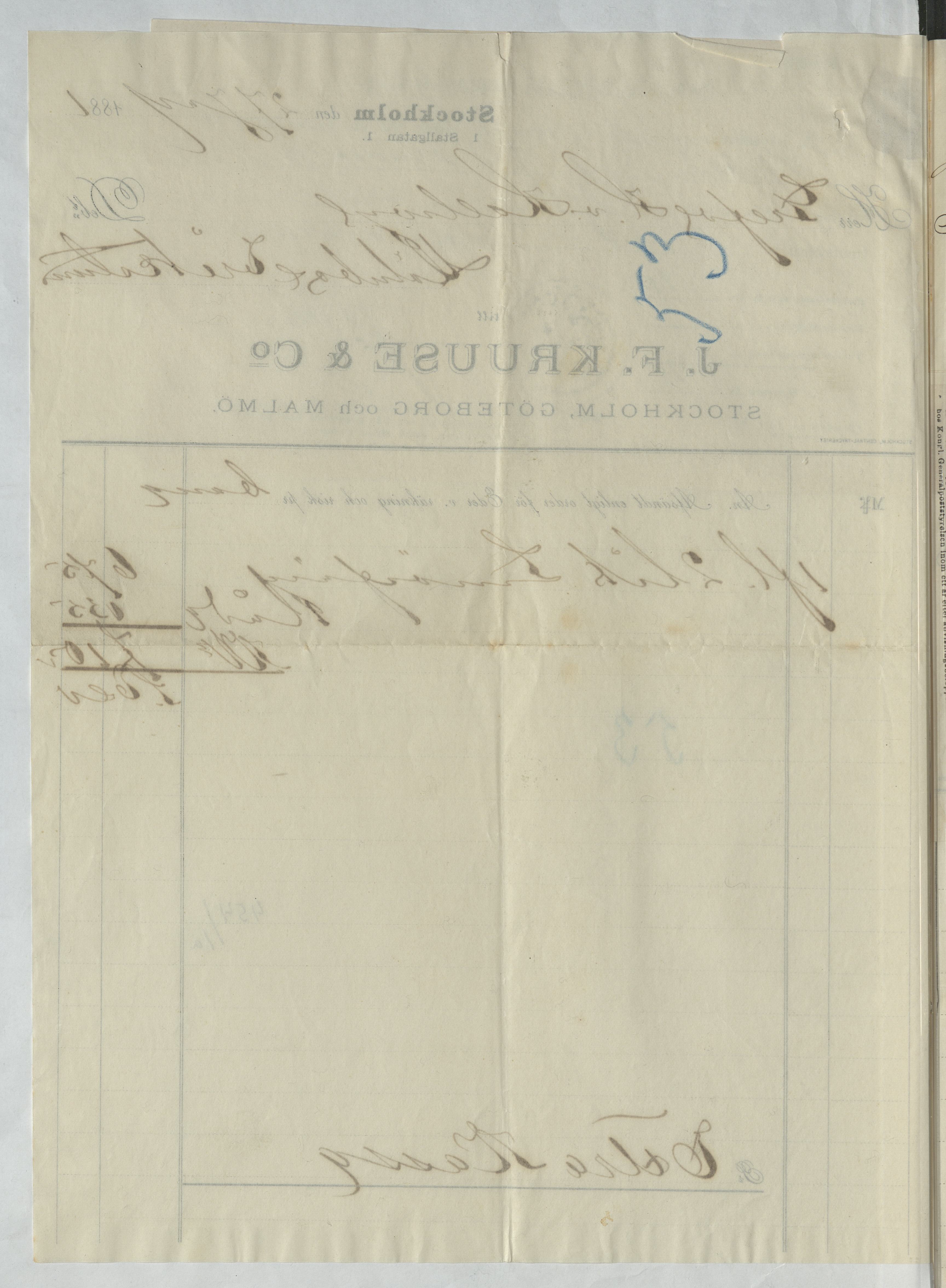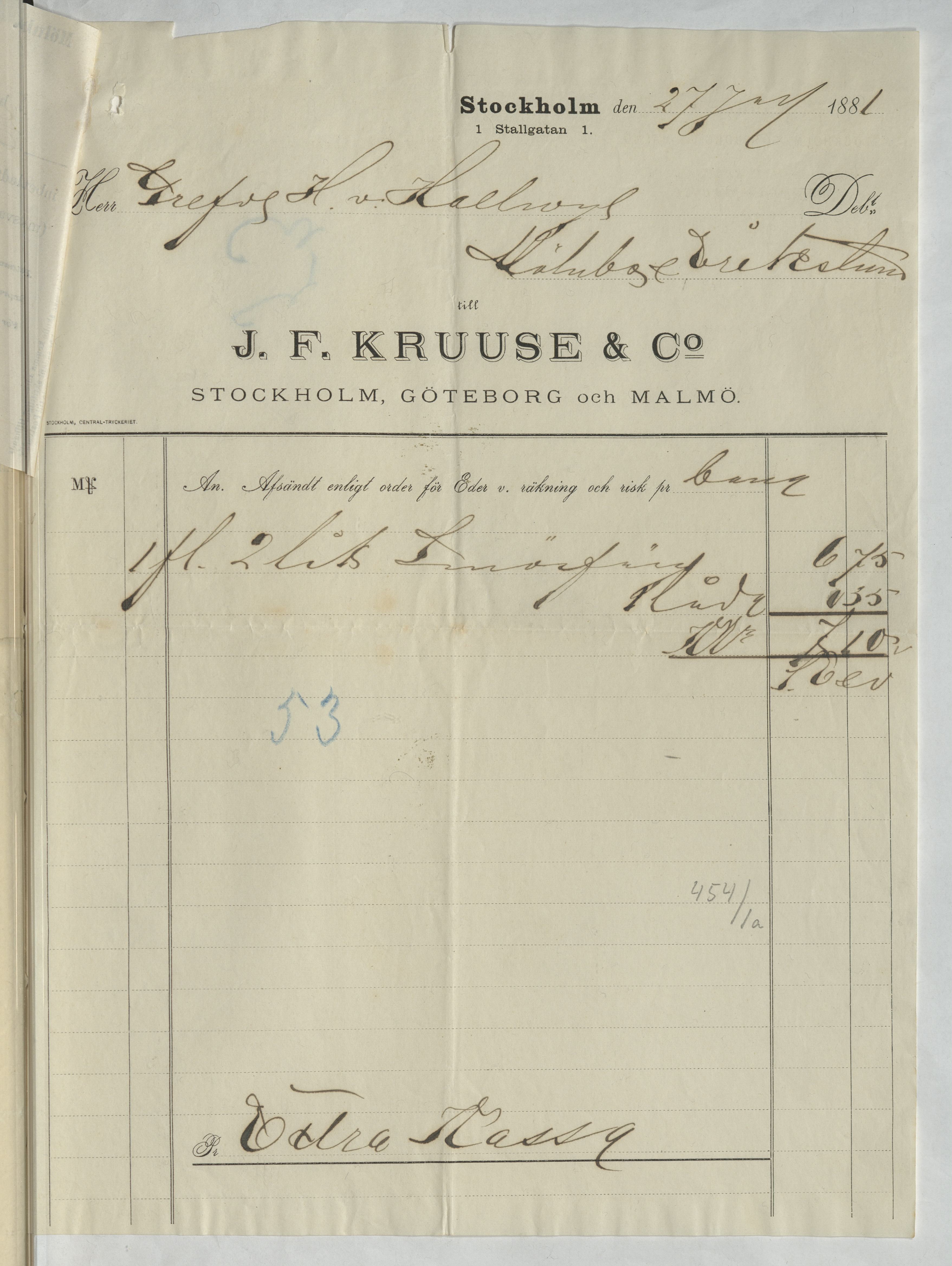 Kvitto från J. F. Kruuse & Co. Stockholm, 1881.