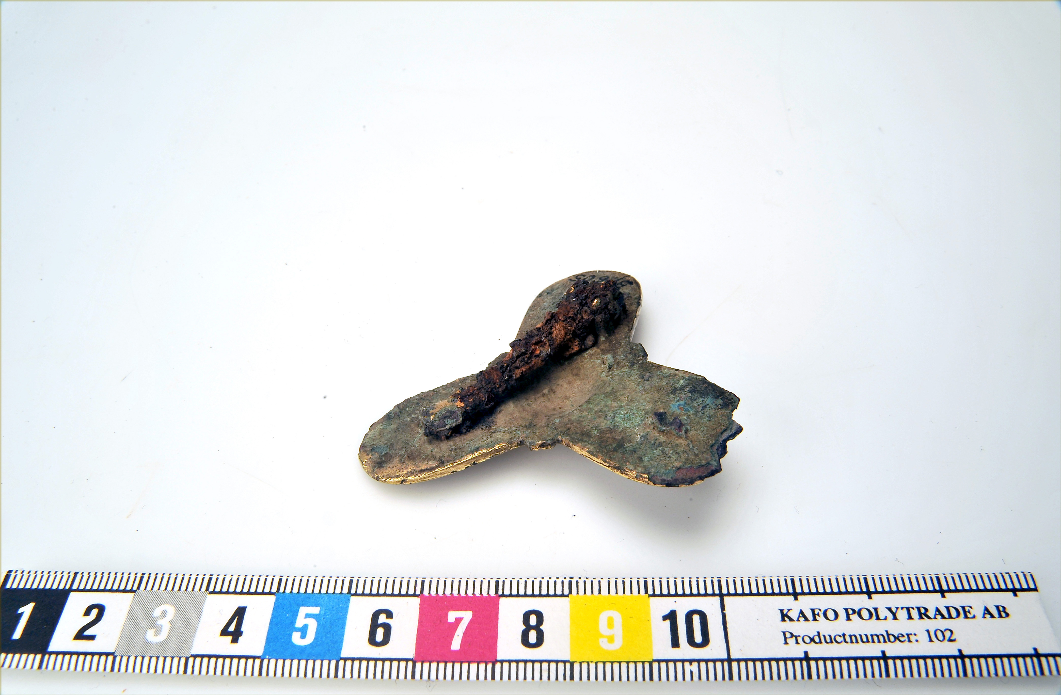 Spännet har järnnål med vidsittande textilrester.