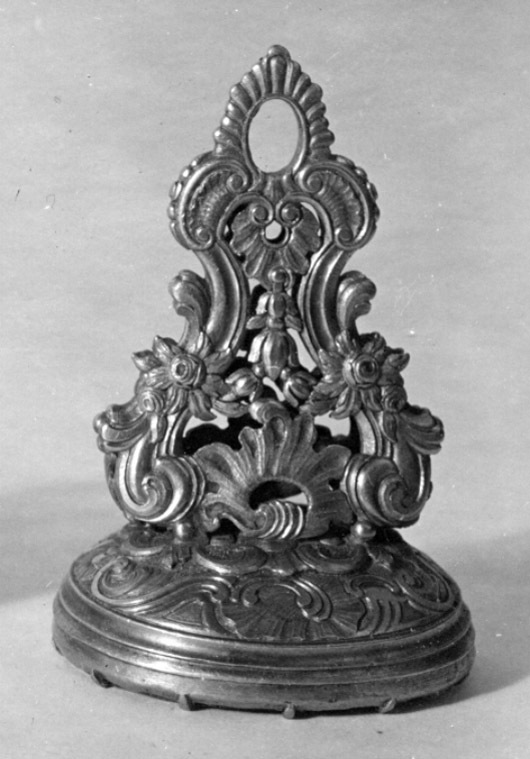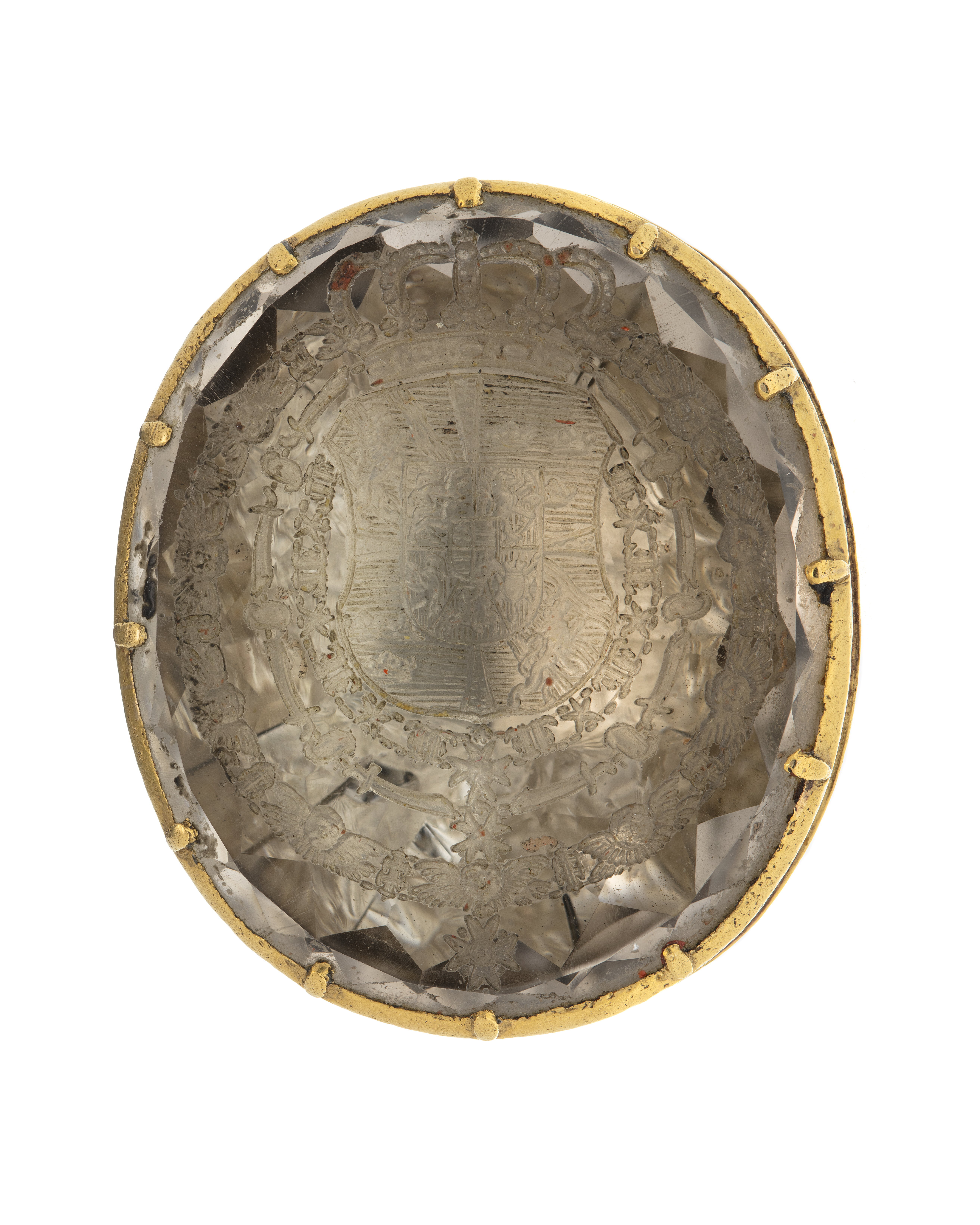 Oval bergkristall med kupig, fasettslipad baksida och fasettslipad, fasadkant. Graverat svenskt riksvapen under huset Holstein-Gottorp, krönt av kunglig krona. Runt skölden Nordstjärne-, Svärds- och Serafimerordenskedjor. Avdeckt fattning av guld, baksidan täckt av guldplåt med rokokodekor i lågrelief. Genombrutet skaft av guld, med S-formiga sidor, bladrankor, upptill oval ring omgiven av strålkrans.