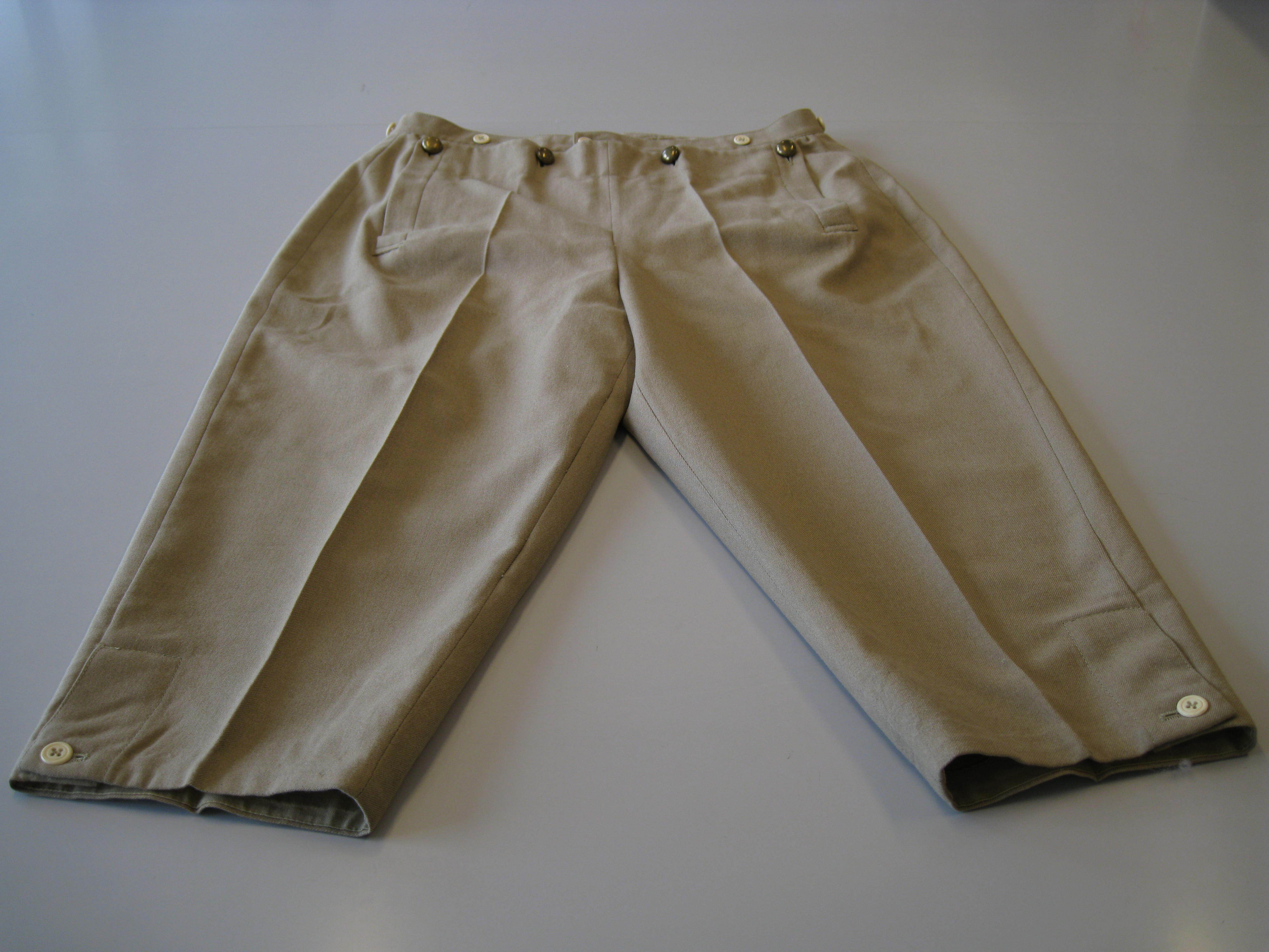 Byxor i beige ylle. Två innanpåfickor fram. Framtill 4 knappar i mässing (?). 7 vita knappar i midjan och 2 nertill.