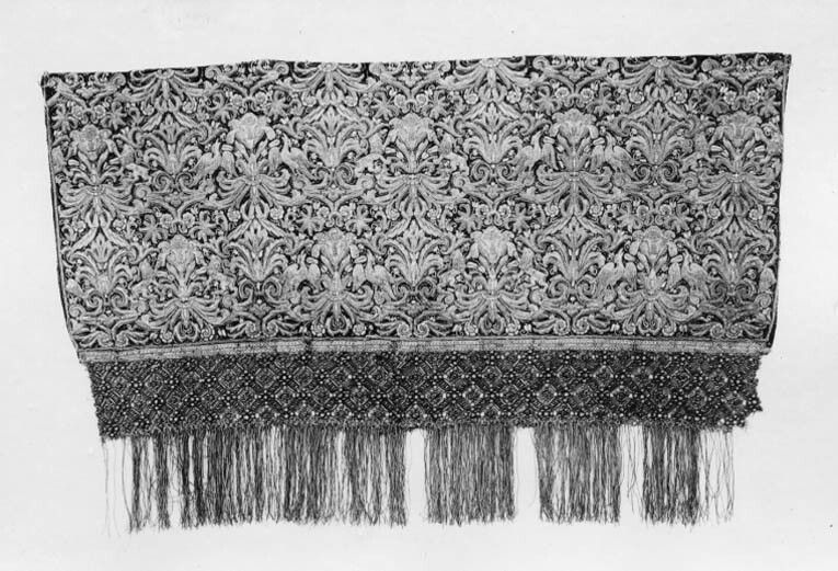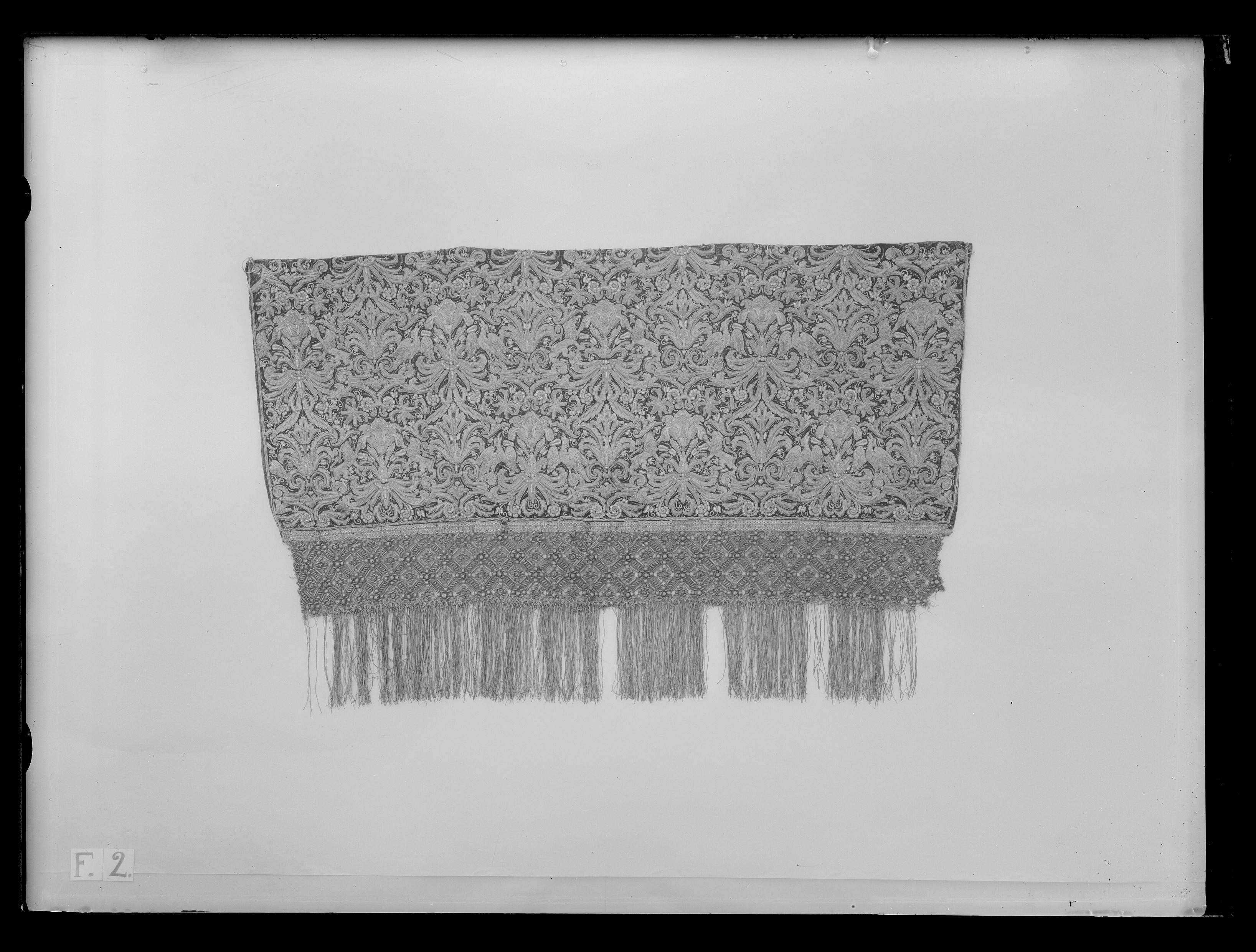 Bottentyg av röd sammet. Yttäckande broderi i läggsöm och appplikationsrelief av guld, silver och silke i gult och beige. Mönster av två omväxlande akantusmotiv, varannan akantus varannan gång symmetriskt omgiven av två örnar och varannan gång av två lejon med utsträckta tungor. Akantusmotivens höjd 200 mm cirka, djurens höjd 80mm cirka. Längs sidorna och nederkanten en tre mm bred snodd omgiven av två en mm breda snoddar. Nedanför broderiet ett knutet snörmakeriarbete, makramé, av guld och silver 150 mm brett varav 20 mm stad med två 2,5 mm breda silverlan och på mitten en två mm bred silverlan. Rombiskt mönster med breda kantiljer, lan och svarvade kulor av trä virade med silverlan. Nedanför snörmakeriarbetet en 170 mm bred frans av guld och silver. Foder av röd yllekypert. Fyra lädertampar med mässingsringar längs överkanten.