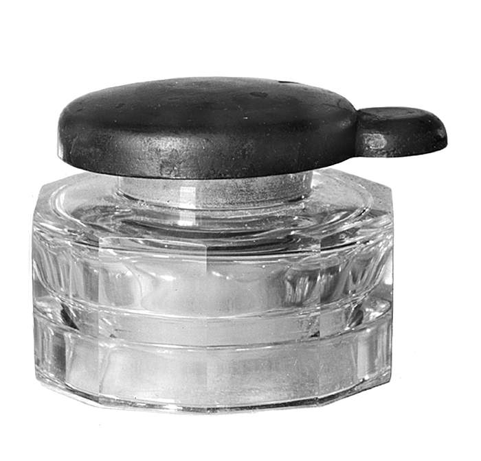 Runt, tiosidigt, med rätvinkligt indragen skuldra, kort vid hals med rakt utstående bred mynningskant samt djupt insänkt kupig botten. Lock (ej original) av svart ebonit, lågt, svagt kupigt, på kanten ett rundat utsprång. Tillhört inventarierna på firman Wilh. H. Kempes (innehavare Walther von Hallwyl och Johanna Kempe, f. Wallis) kontor, inrymt i Blasieholmstorg 11, 1884 - 30 September 1896, och Hamngatan 4, 1 Oktober 1896 - 1909; sedermera på Walther von Hallwyls privata kontor 1909 - 1921 samt slutligen på Wilhelmina von Hallwyls, f. Kempe, kontor där från sistnämnda år t. o. m. 1930.