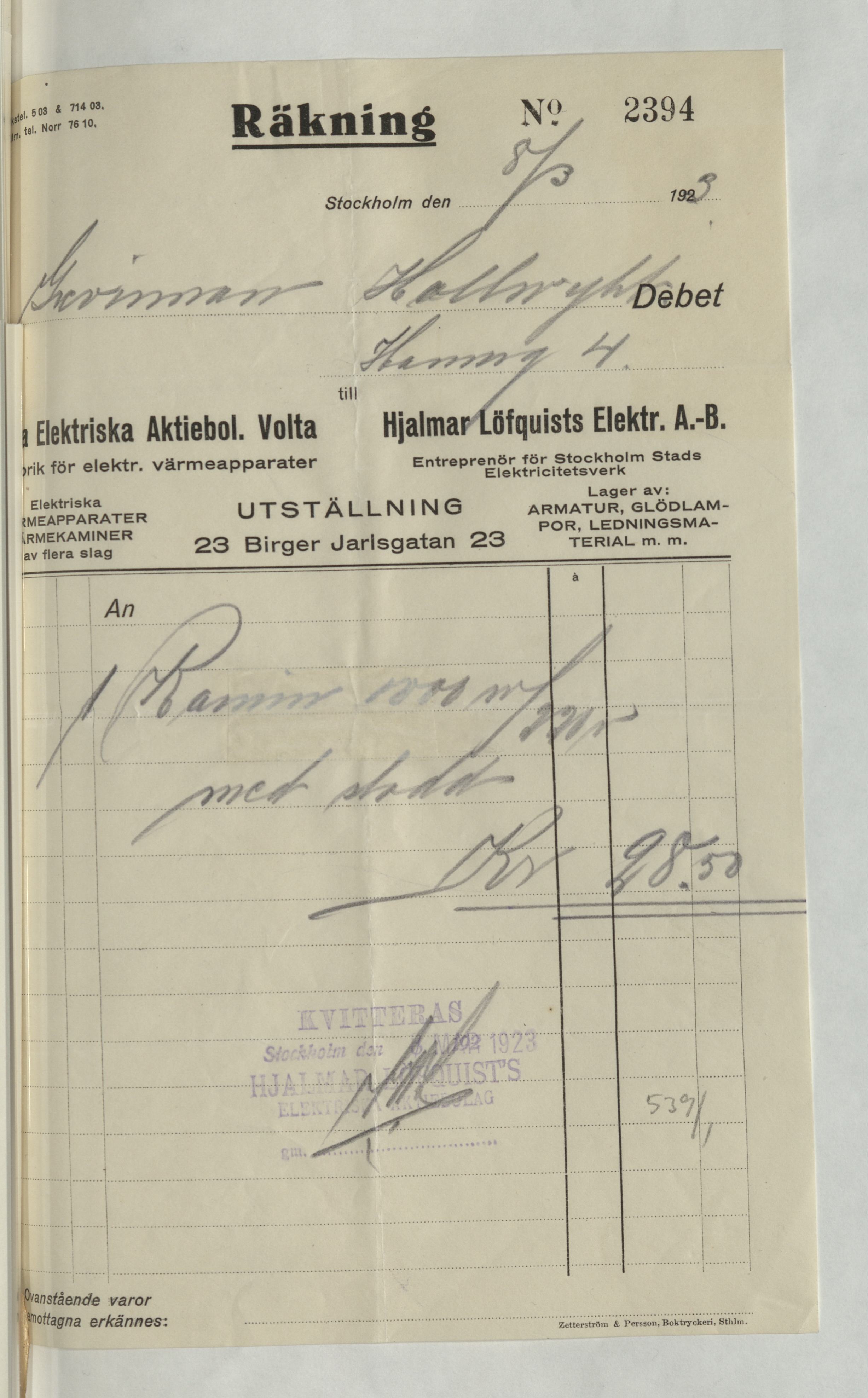 Kvitto från Hjalmar Löfquists Elektriska AB, Belysningsentreprenör, med en summa av 28:50Kr. Stockholm 8 mars 1923.