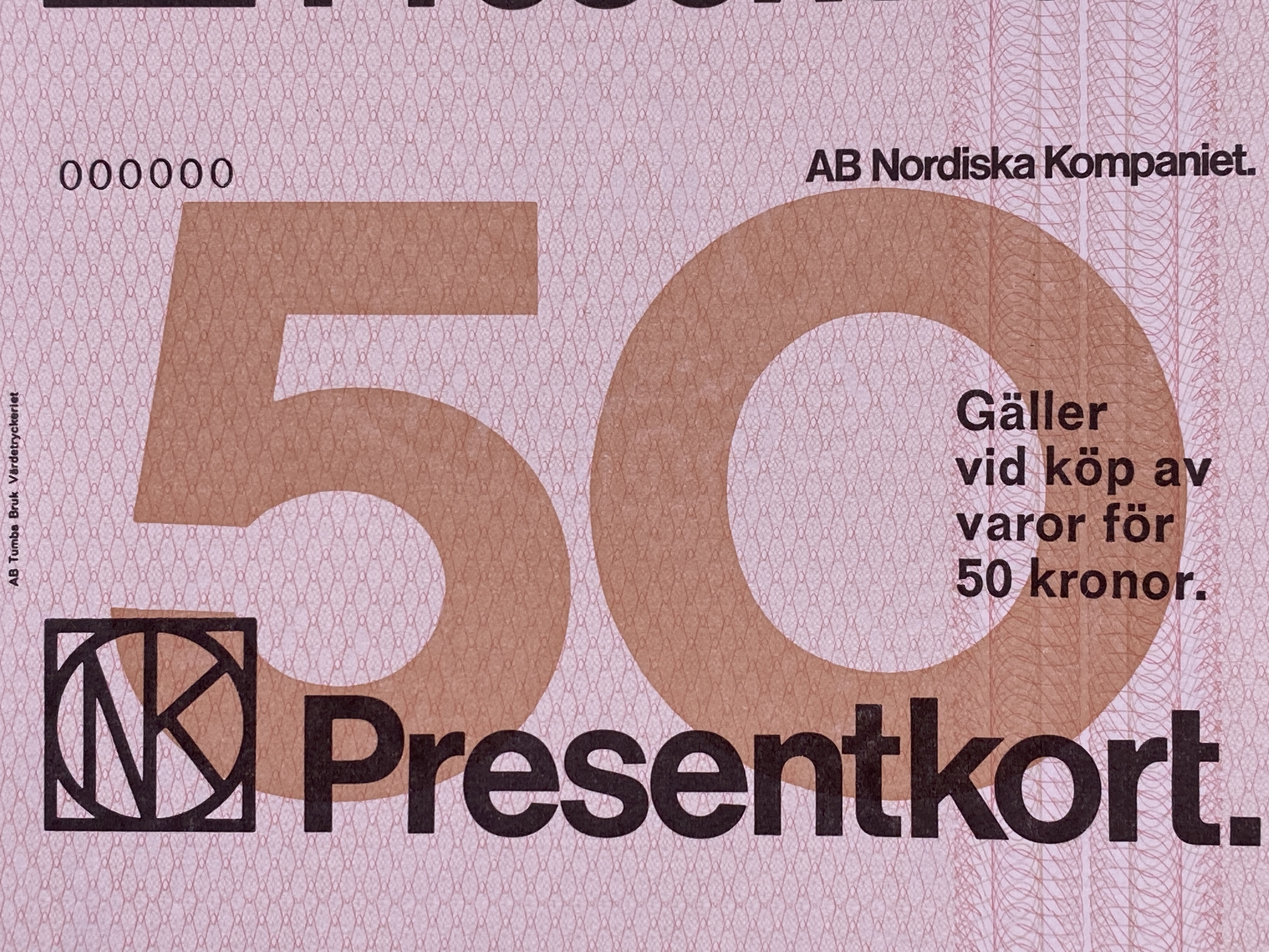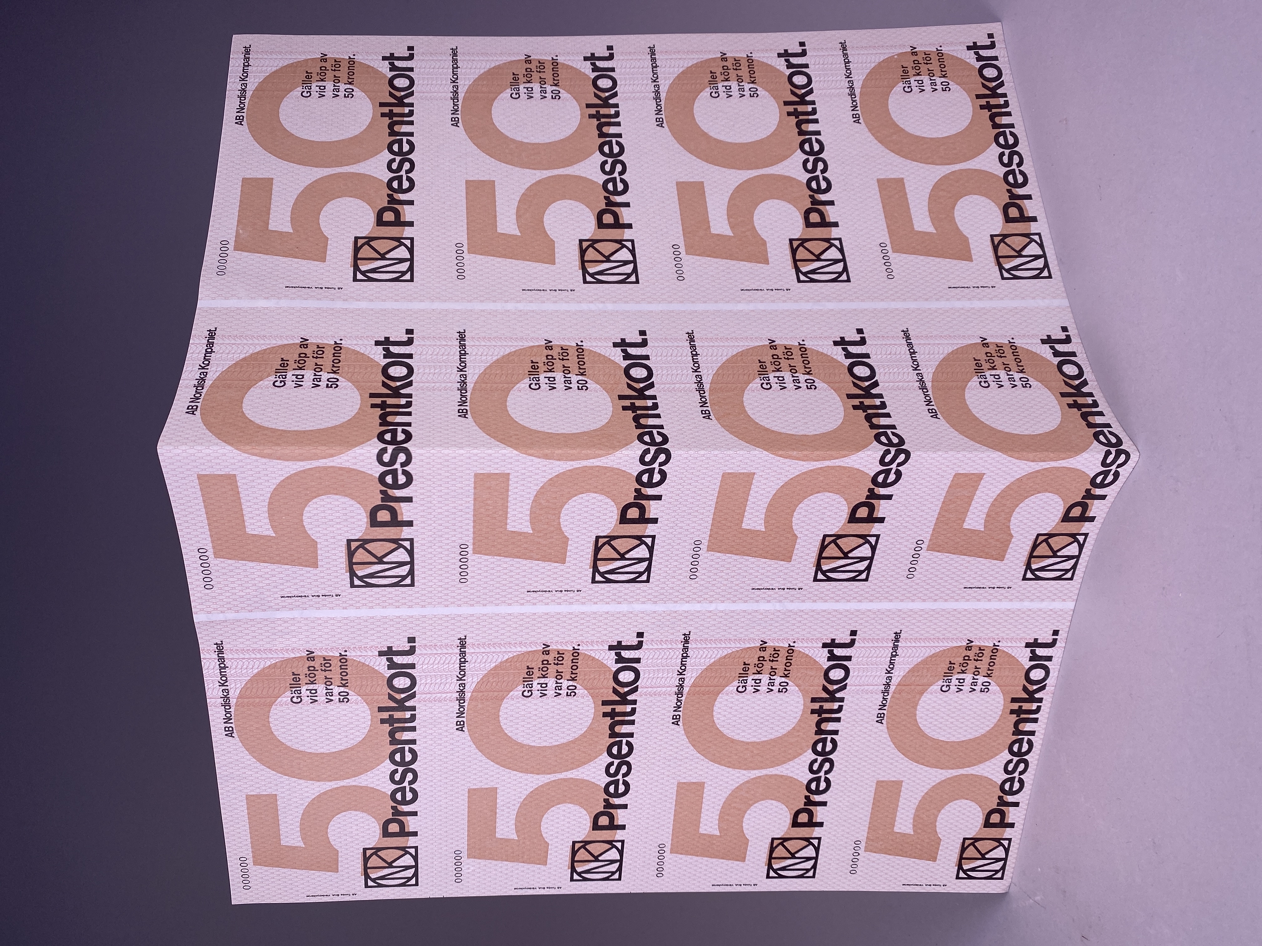 Provtryck av NKs presentkort med ett värde på 50 kronor. Svart text tryckt på beige/rosa bakgrund. Ej daterad ark. Har varit vikt.