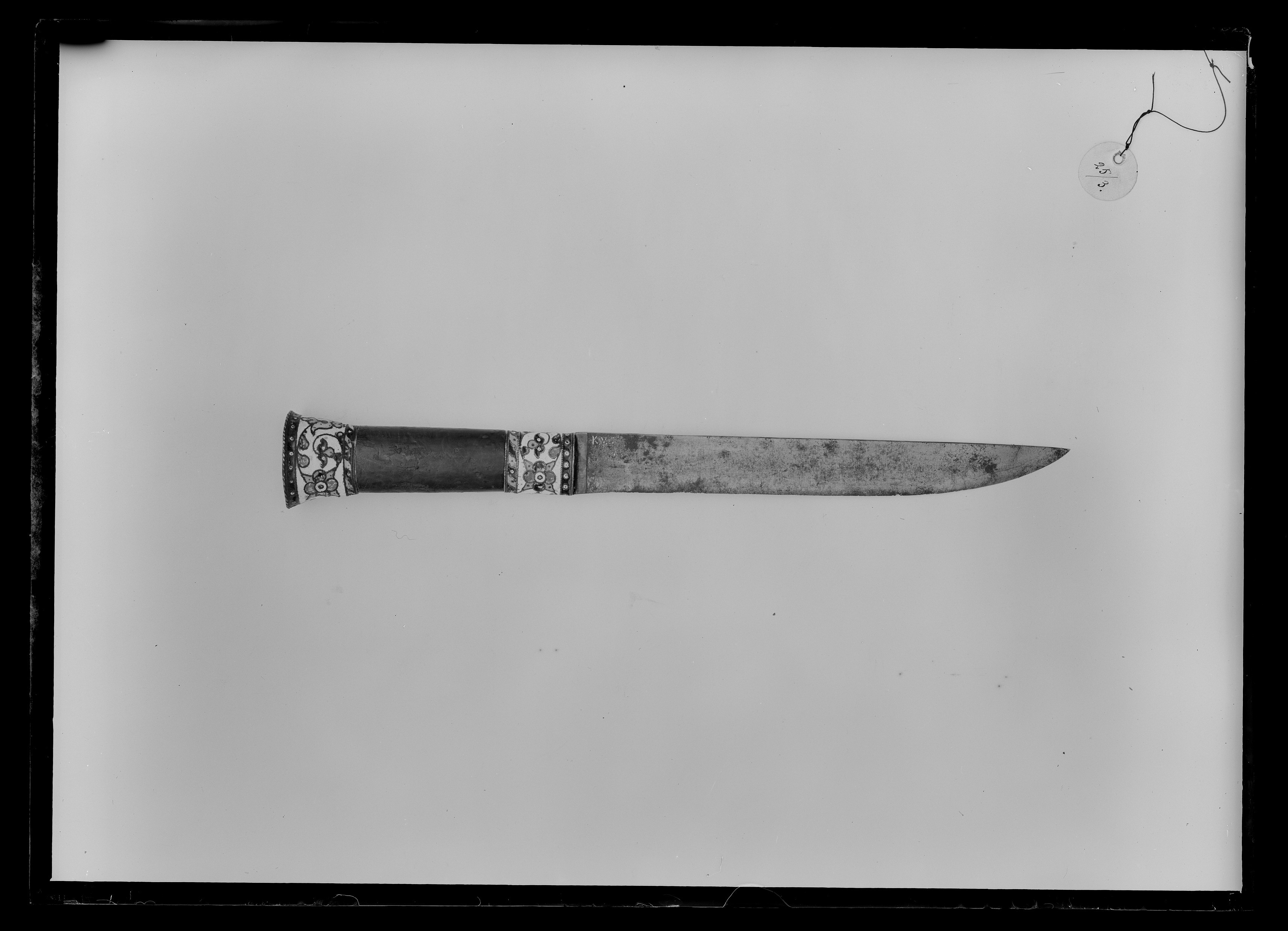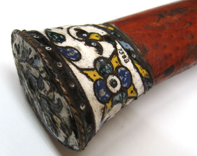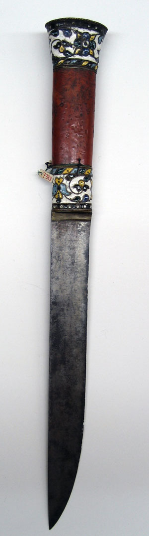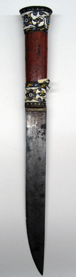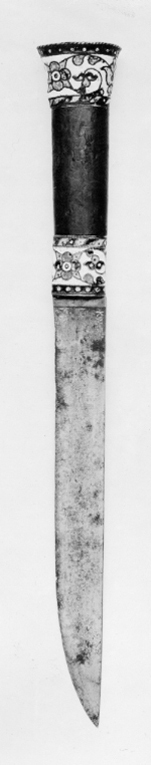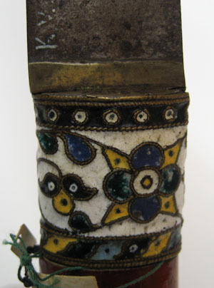 Fäste med ovalt träsnitt, vidare uppåt med platt ovansida. Upptill och nedtill mässingsbeslag med cloisonnéemalj med stiliserade blomrankor i blått, gult, blågrönt och ljusblått mot vit grund mellan tvinnade mässingstrådar. Kaveln av trä, målad med rödlack. Klinga av stål, 28 mm bred, rak, eneggad.