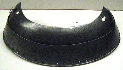 Av stålplåt, större delen av utsidan med etsade figurscener. Insidan ljusbrun med tydliga slagmärken. Sammanlagt två delar. Nedre skenan bestående av två sammanvällda delar. Två välvda skenor fästade omlott med tre sämskade läderband på insidan. Nedre skenan överlappande. Endast nedre kant omvikt inåt och rundsmidd. Längsmed denna kullriga järnnitar i rad. I översta skenan till höger nyckelhåls-hål, till vänster cirkulärt hål och hasp med tillfilad bas. Heltäckande etsning av landskap med träd, kyrka och hus.