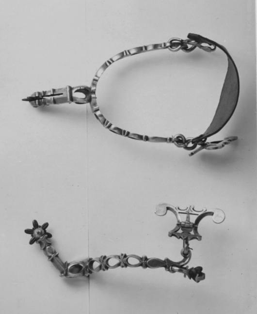 Rektangulärt läder med sneskurna hörn och knapphål för sporrens krok. Lädret är mörkbrunt.