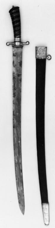 Fäste, korsformigt. Parerstänger av förgylld mässing, korta med ovalt tvärsnitt, ändarna ansvällda, den främre böjd nedåt, den bakre uppåt. På båda sidor av krysset ett graverat och punsat rokokoornament. Knapp av ebenholts, platt oval, nedåtlutande åt framsidan och tätt ornerad med radiellt ordnade räfflor. Nitknapp jämte underliggande krage av förgylld mässing. Kavel av spiralräfflat mörkbrunt horn med ovalt tvärsnitt något framåtböjd samt avsmalnande nedåt. I räfflorna (7 varv) ett tämligen brett kopparlan mellan två tvinnade koppartrådar. Klinga svagt böjd, eneggad utom vid det ca 220 mm långa tvåeggade spetspartiet. På båda sidor med början ca 90 mm från basen en bred grund hålkäl. Överlämnad enligt testamente av fröken Emilia Ädelgren, Malmö. Enligt uppgift av fröken Anna Ädelgren, tidigare i friherre Carl Axel Emanuel Reuterholms ägo (1803-1864).