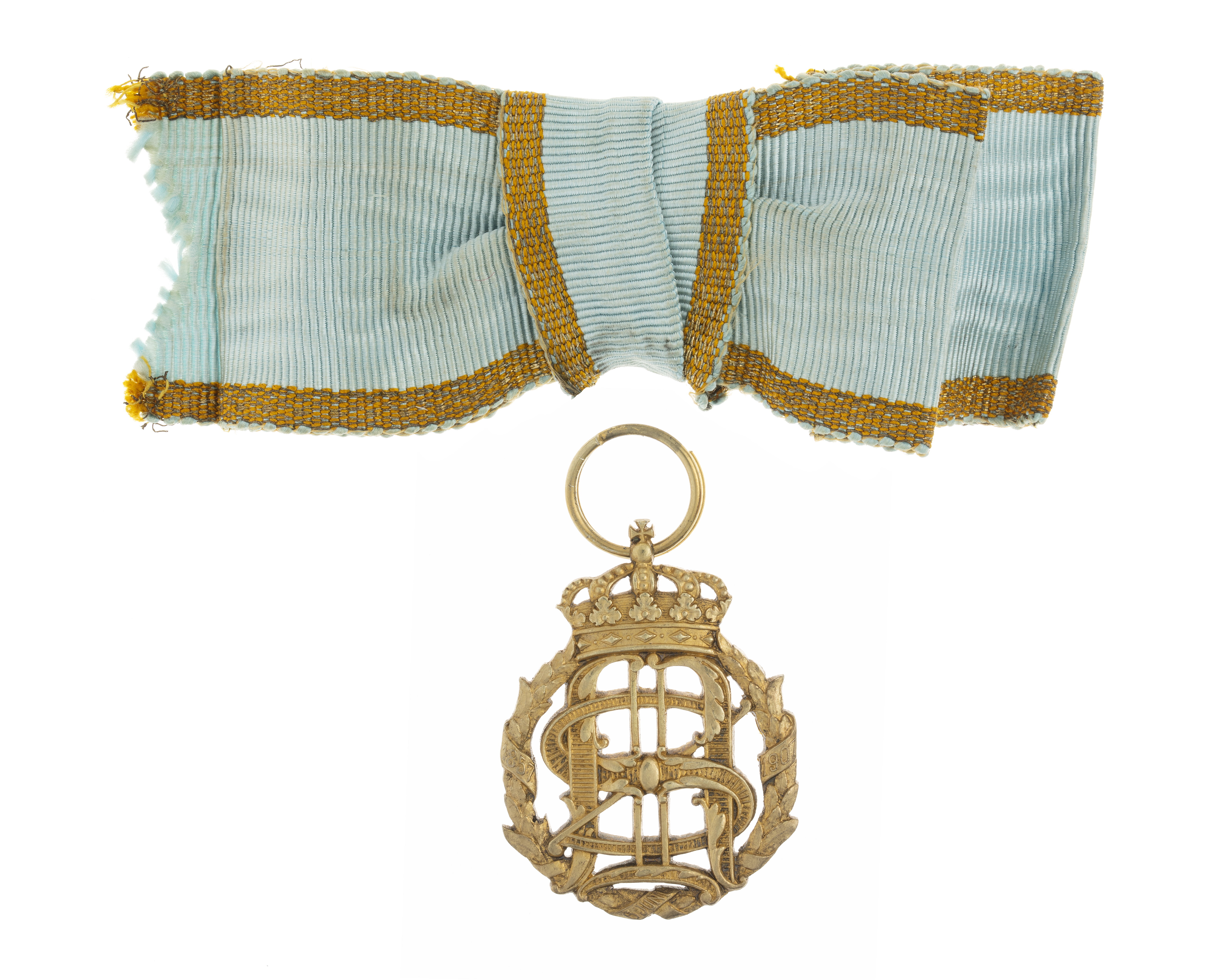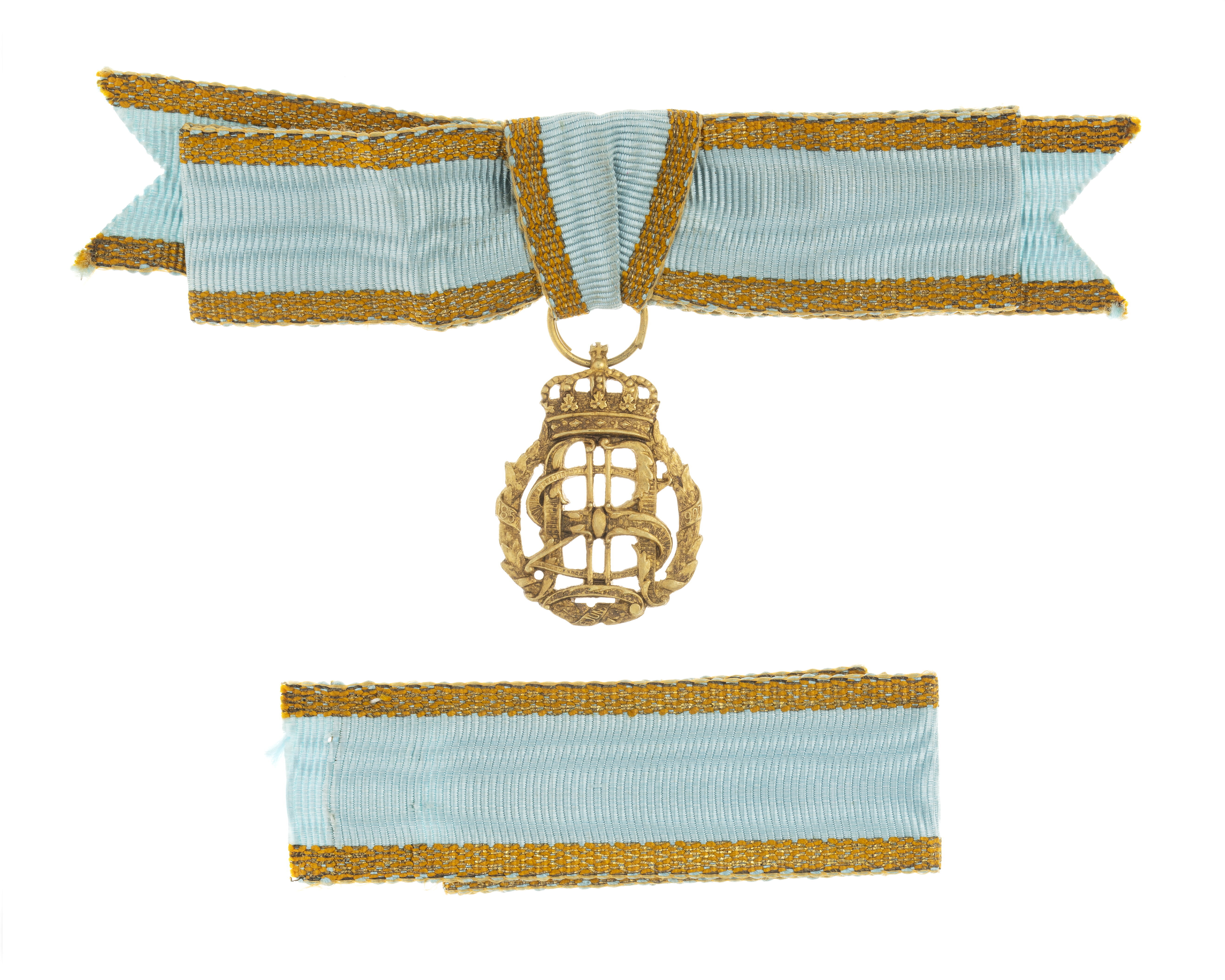 Namnchiffer krönt av kunglig krona, omgiven av lagerkrans och lindad med band med text: "1857 6 JUNI 1907". Av förgyllt silver (?). Igenom kronans äpple draget ring. Gåva av drottning Louises statsfru. Tecknet komponerat av prins Eugen och Ferdinand Boberg, ritat av Agi Lindegren och modellerat av Adolf Lindberg.