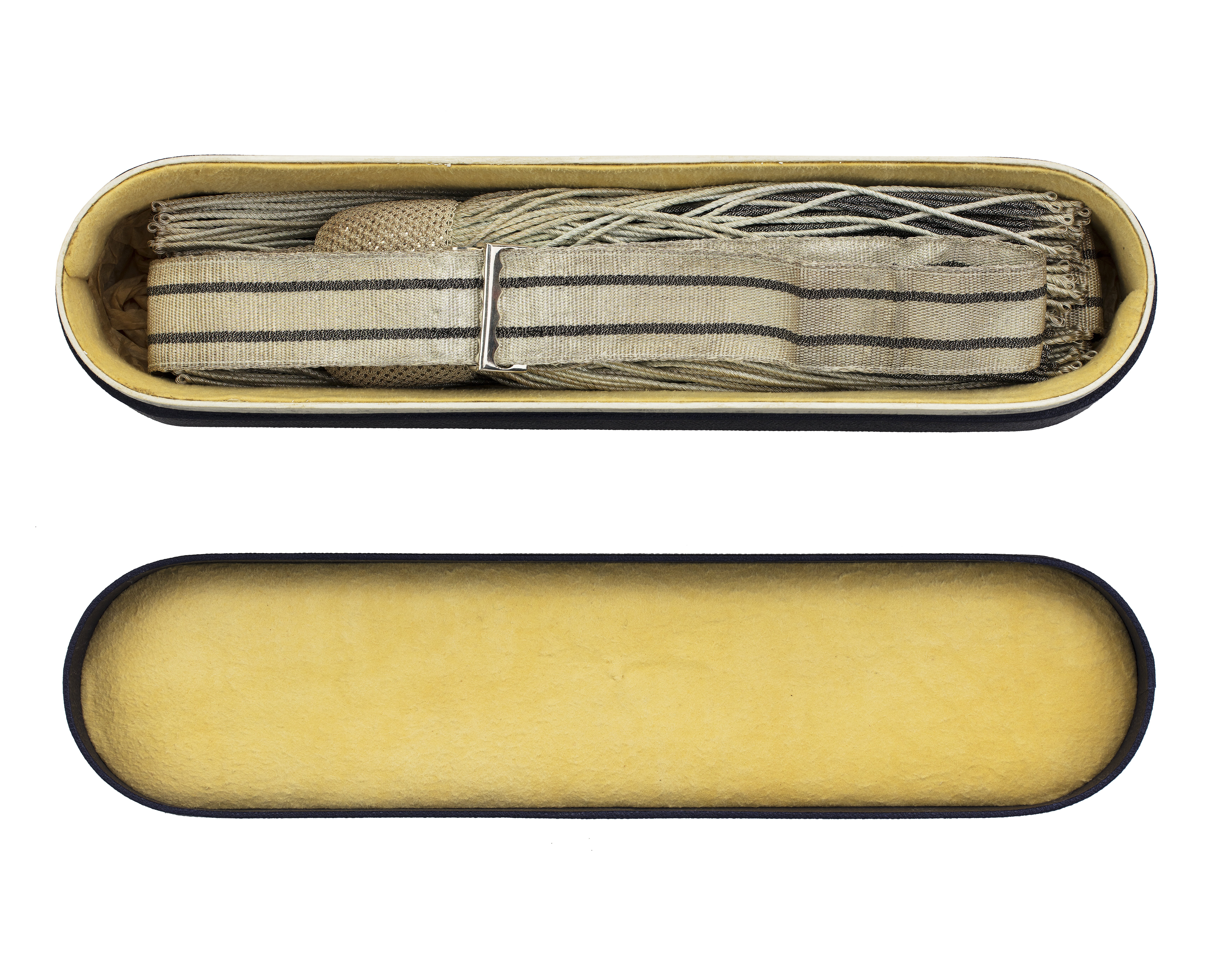 Skärp av virkad silvertråd med två smala svarta invävda ränder. Pompongen täckt med silverlan, häröver virkad silvertråd. Öppen tofs av tvinnad silvertråd. I mitten uppblandad med svart silke. Spännen av silver. Skärpet fodrat med vitt, vattrat siden.