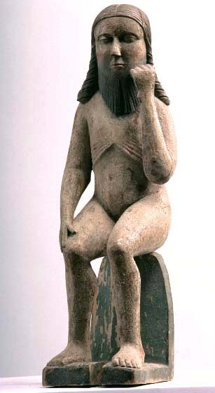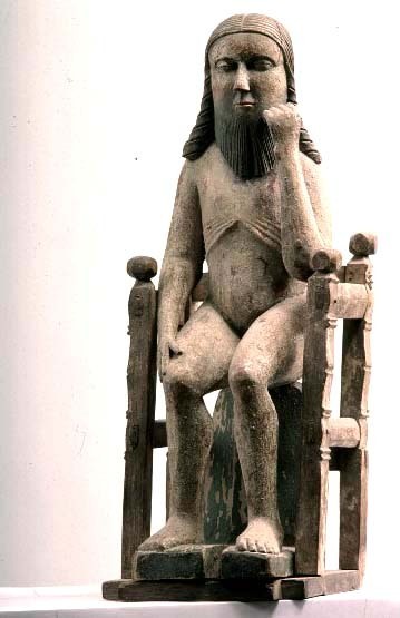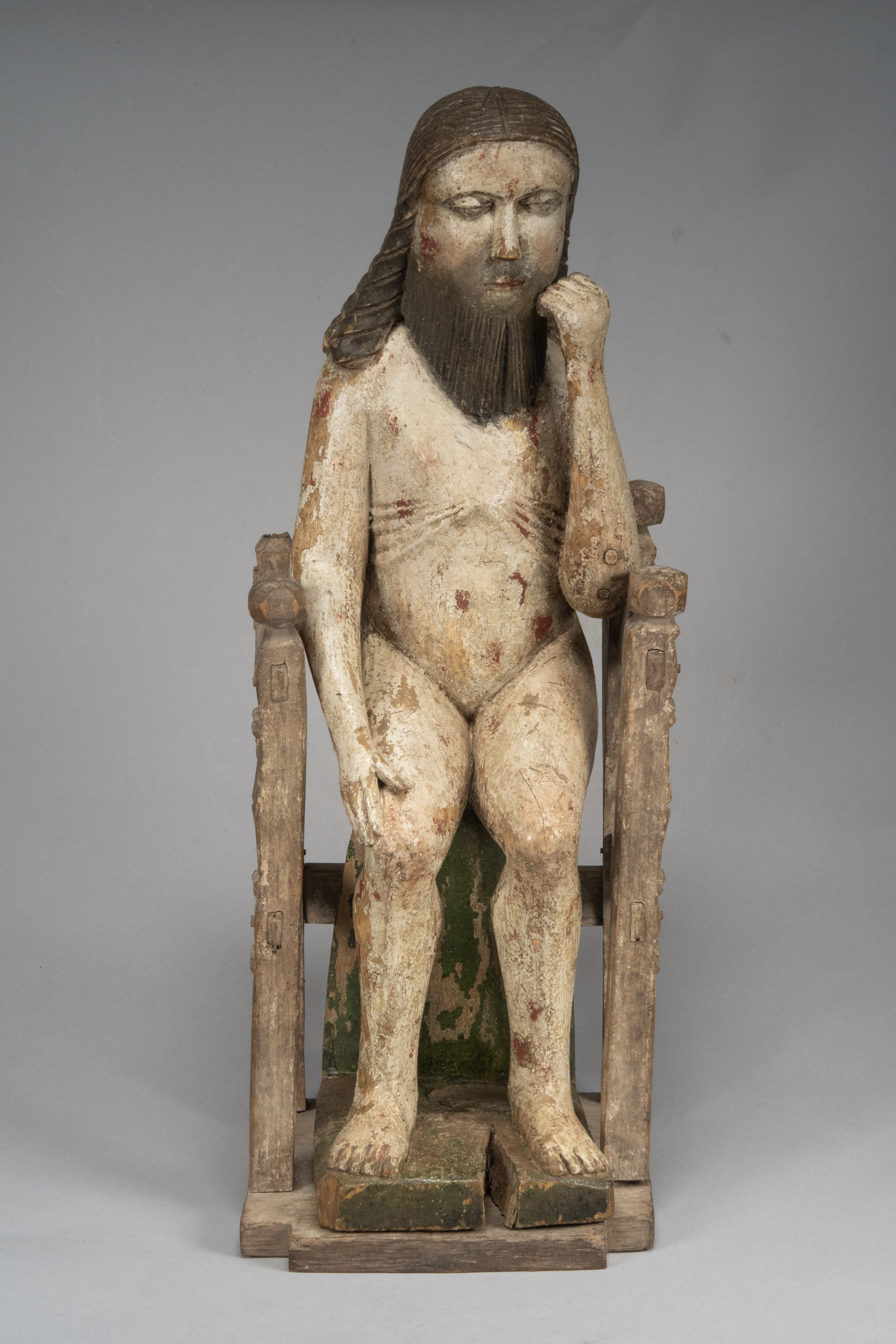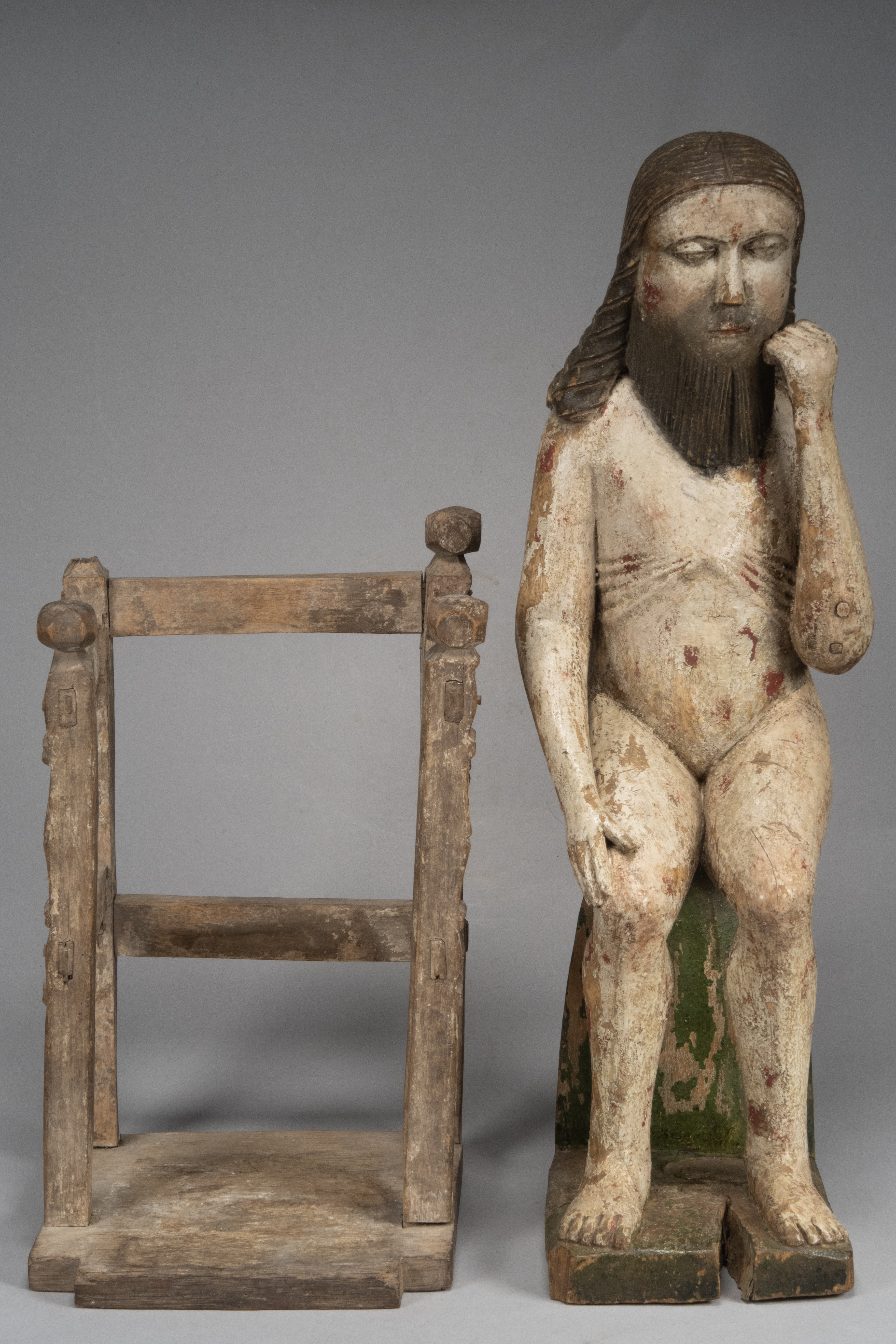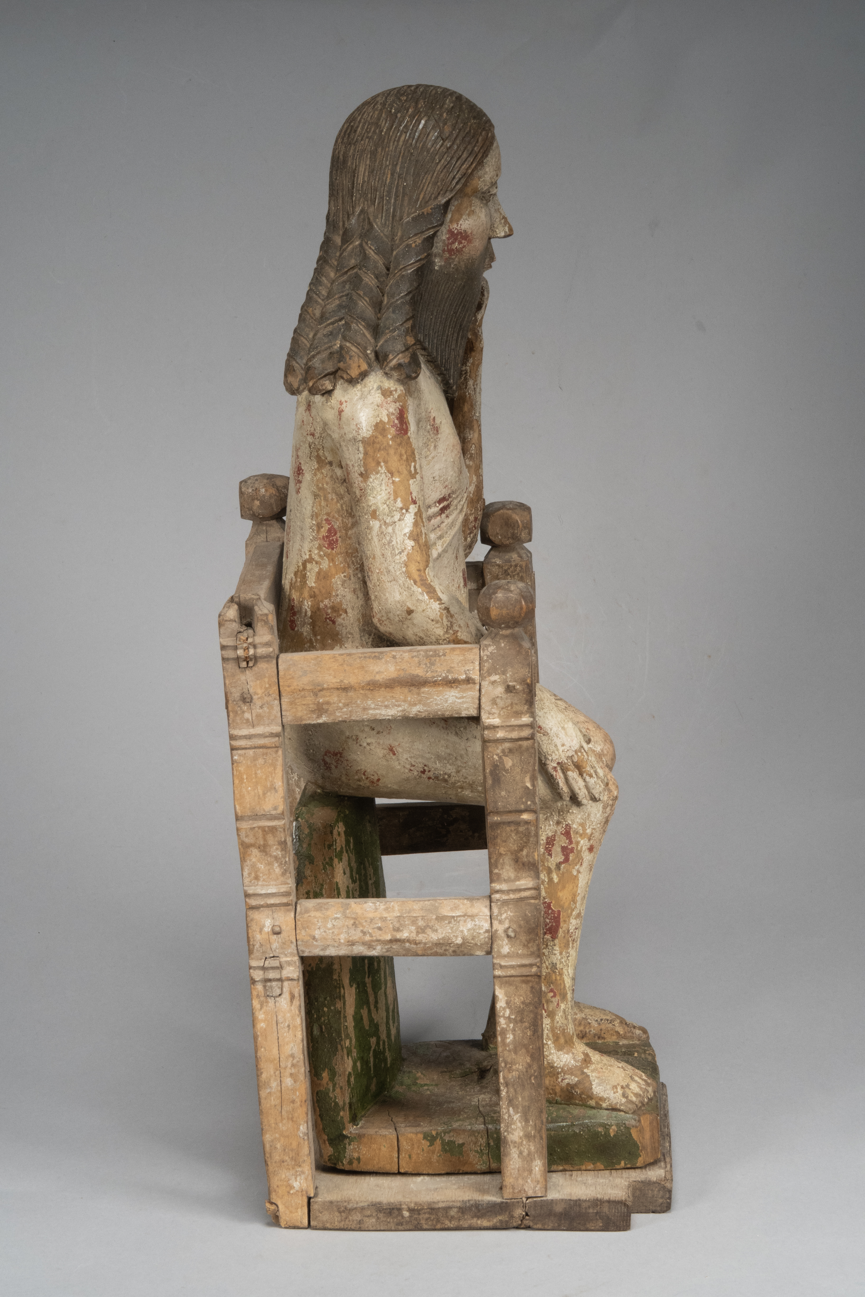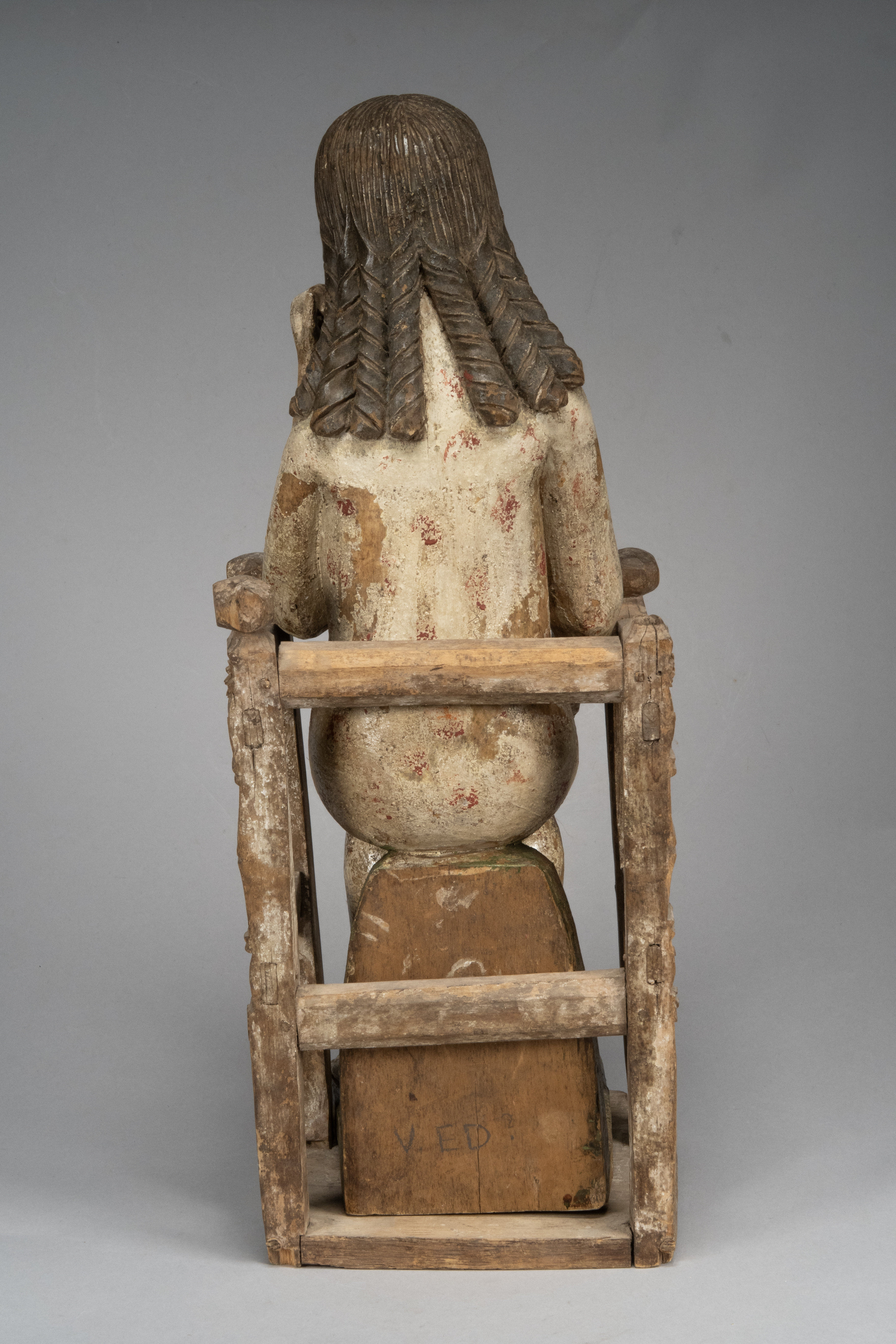 Kondition: sprickbildning i sockeln. Färg: i stor utsträckning bevarad men något nött.Skulpturen ev. av lönn, stolen kanske av asp.