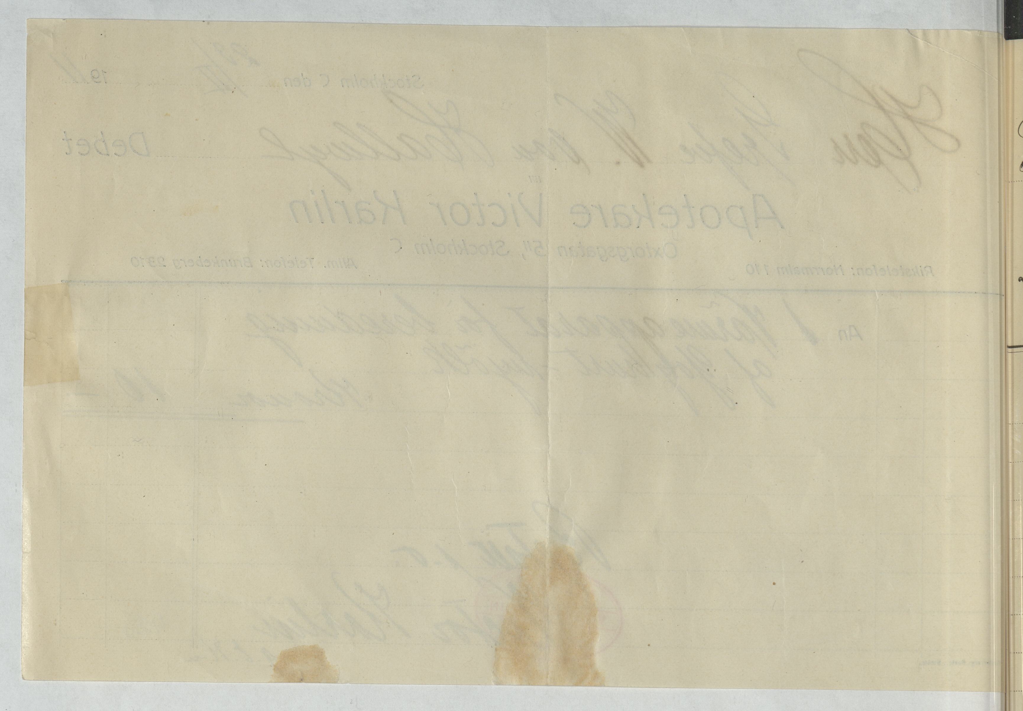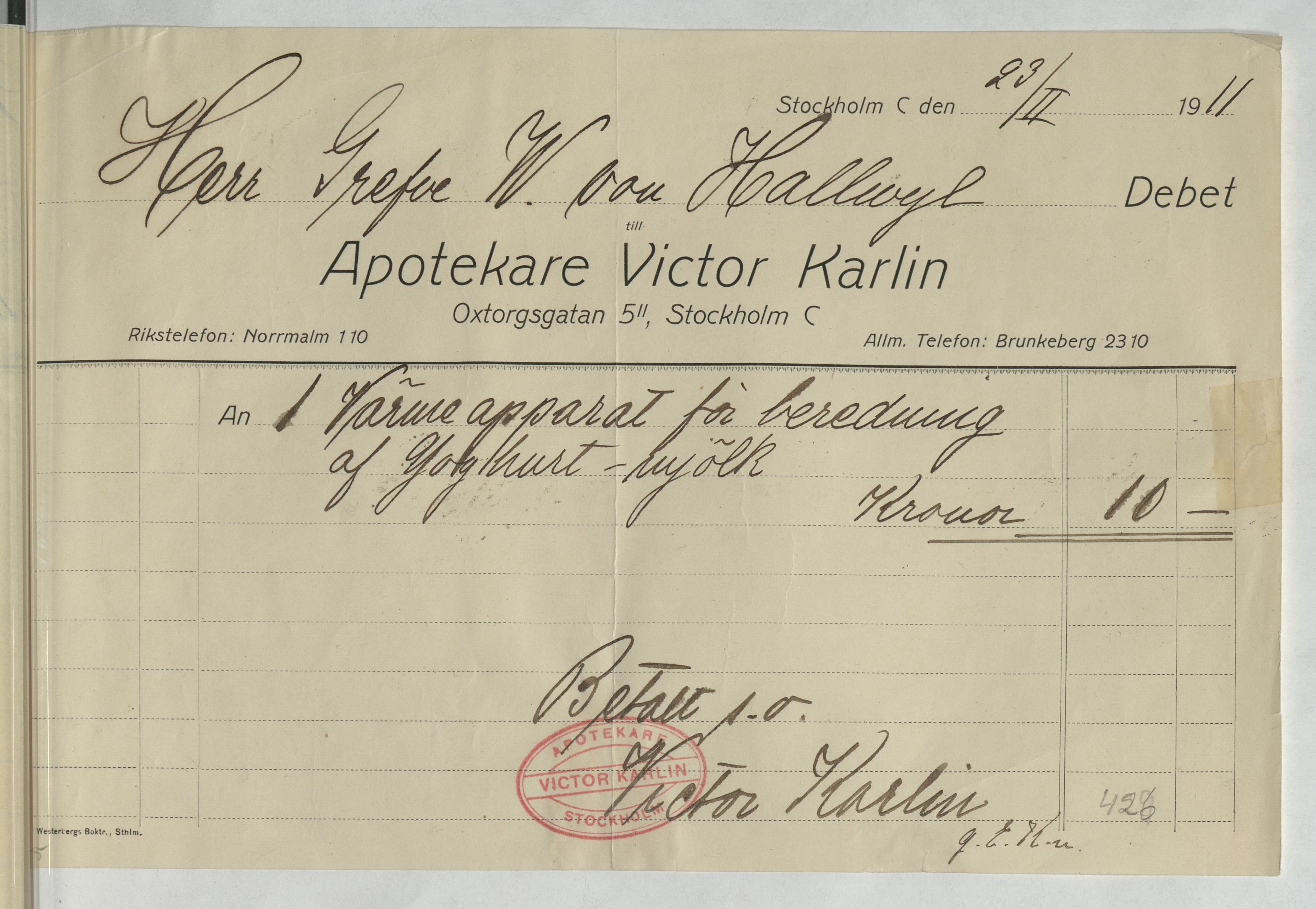 Kvitto från Apotekare Victor Karlin. Gällande inköp av en värmeapparat för beredning av yoghurt och mjölk. Stockholm, 1911.