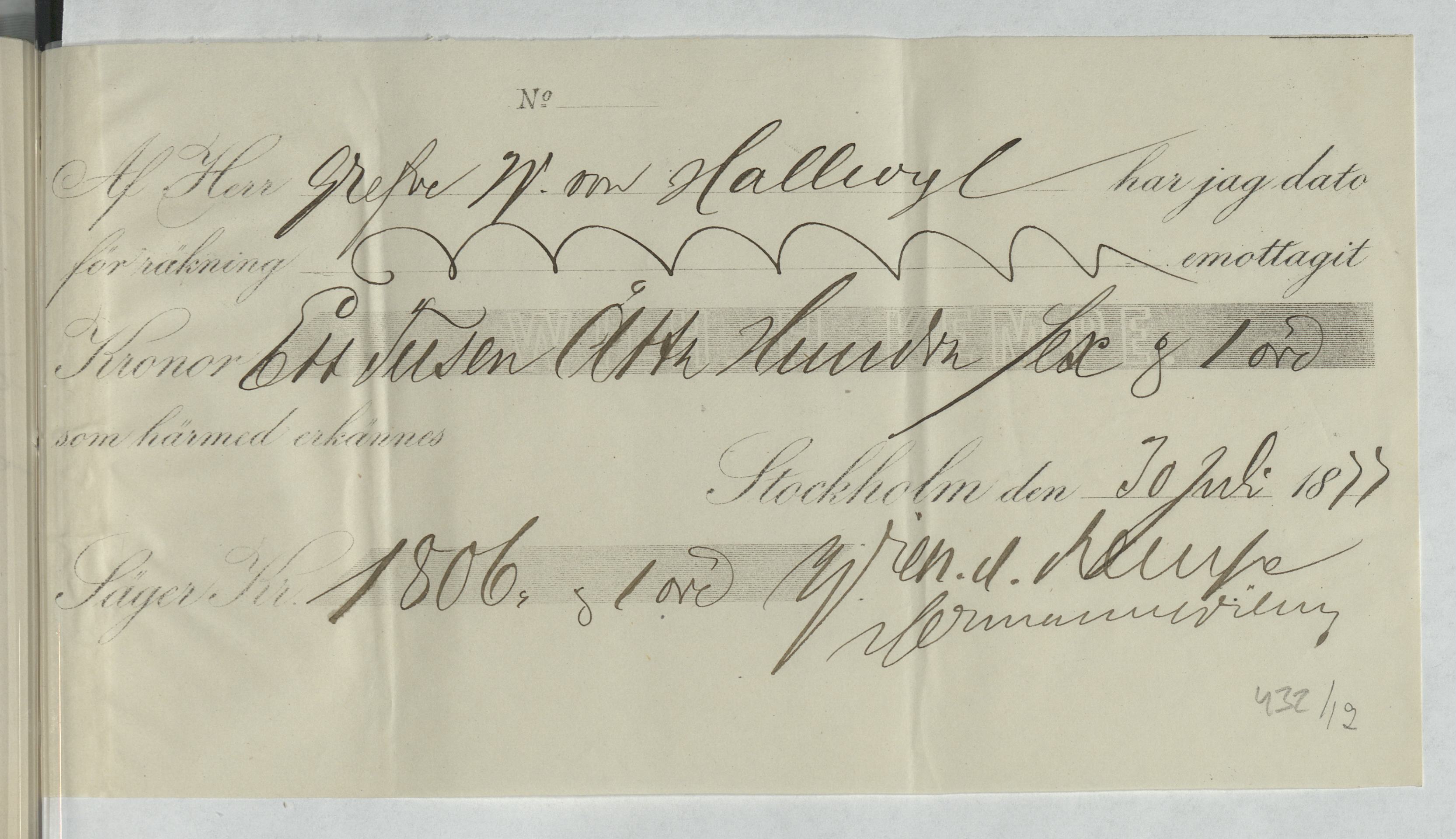 Kvitto från Firma Wilh. H. Kempe rörande emottagna kontanter från Walther von Hallwyl.