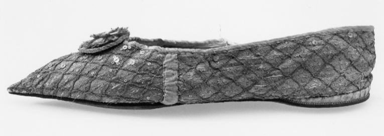 Pumps av rak modell med spetsig tå. Av silverlamé varöver i rutnät broderats med tambursöm, i varje ruta har 4 små guldpaljetter sytts fats runt en större i mitten. Framtill i ringningen en rund rosett av plisserat vitt siden, över sid- och baksömmen har ett 10 mm brett, vitt sidenband sytts. Detta utgör också kantskoning. En låg klack (kilklack) 7 mm hög, har kilats in mellan ytter- och innersulan. Sulan framtill vändsydd men randsydd vid klacken. I tåpartiet foder av vitt siden, inre sula och bakkappa av vitt skinn. Modellen är skuren i ovandel och två sidostycken, en spetsig tå och har en liten kilklack insydd mellan sko- och slitsula. Silvertyget är dekorerat med romber av guldtråd utförda i tambursöm. Varje romb är smyckad med en stor och fyra små guldpaljetter. Framtill är skon smyckad med en bandros av benvitt siden. Skon fodrad framtill med siden och i bakkappan med benvitt getskinn så även innnersulan.På slitsulan finns korsformiga pinnhålsstämplar.