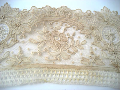 Jämnbred vit brysselspets av silkestråd. Ett mönster av blommor, rosetter och medaljonger inramat av romerska bågar. De romerska bågarna gör kanten vågig medan andra kanten är rakt avslutad med en 13mm bred kantbård av hålsöm.