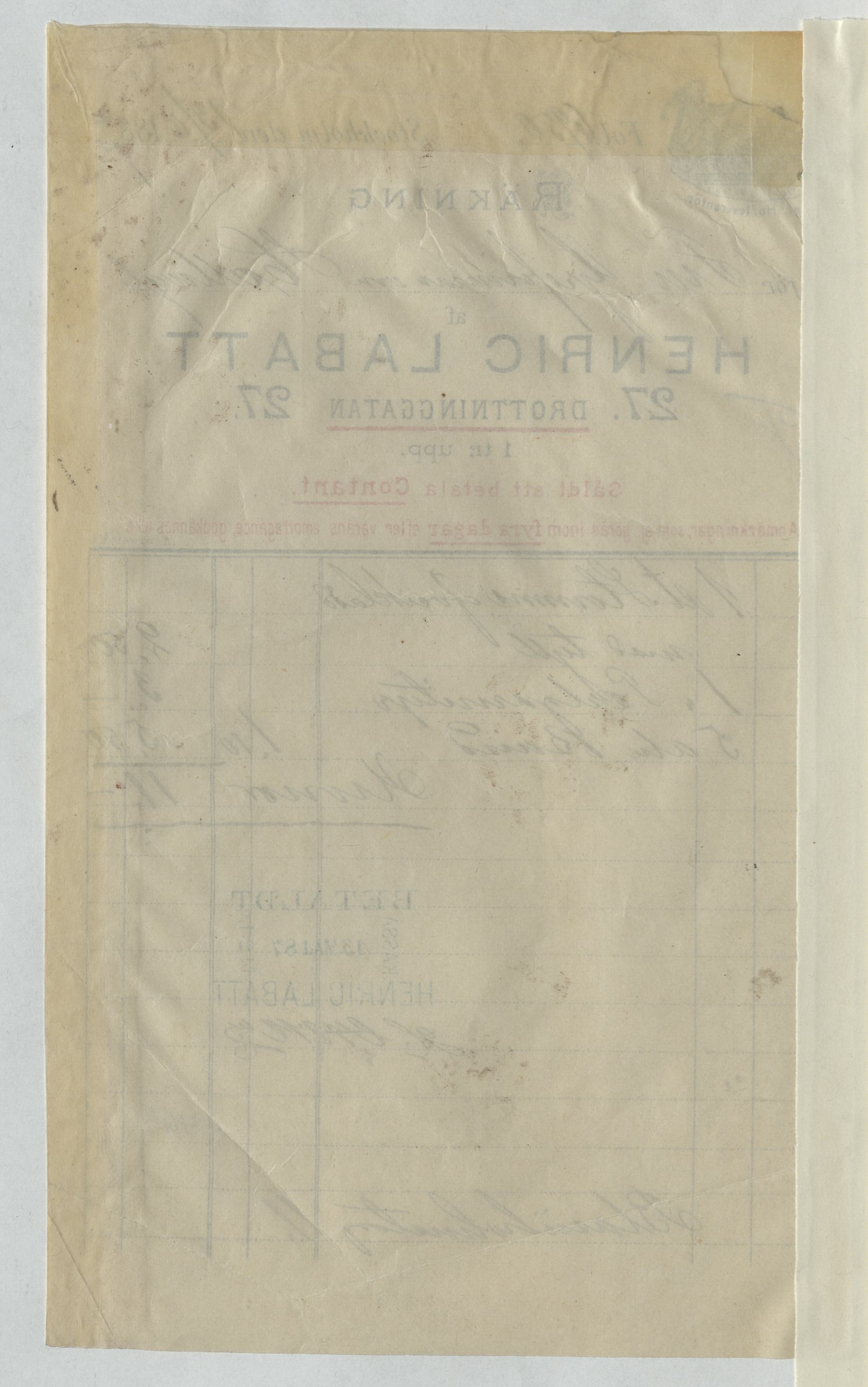 Kvitto från Henric Labatt. Gällande en stomme överklädd med tyll, ett pärlgarnityr och fem aln band. Stockholm, 1887.