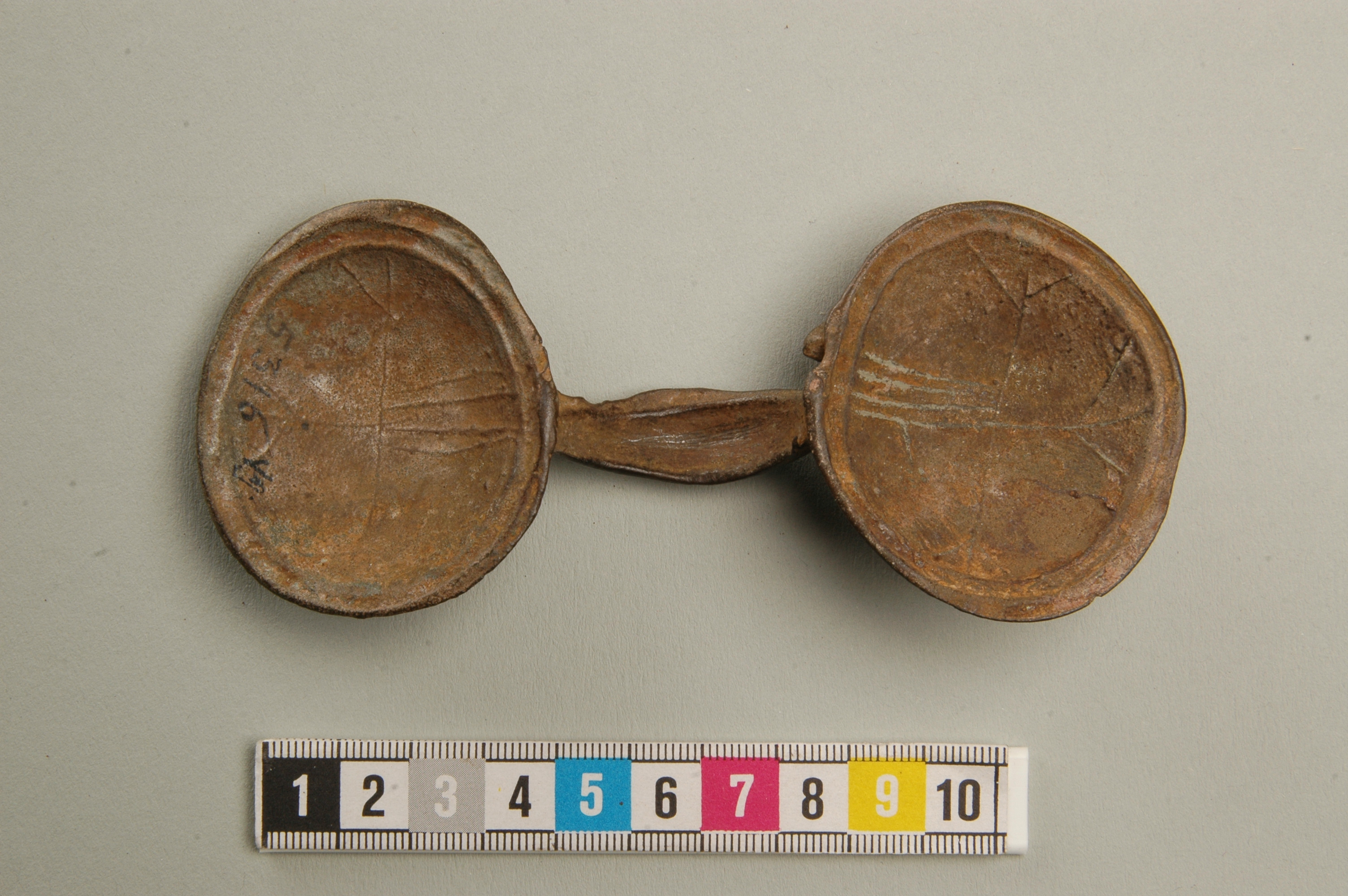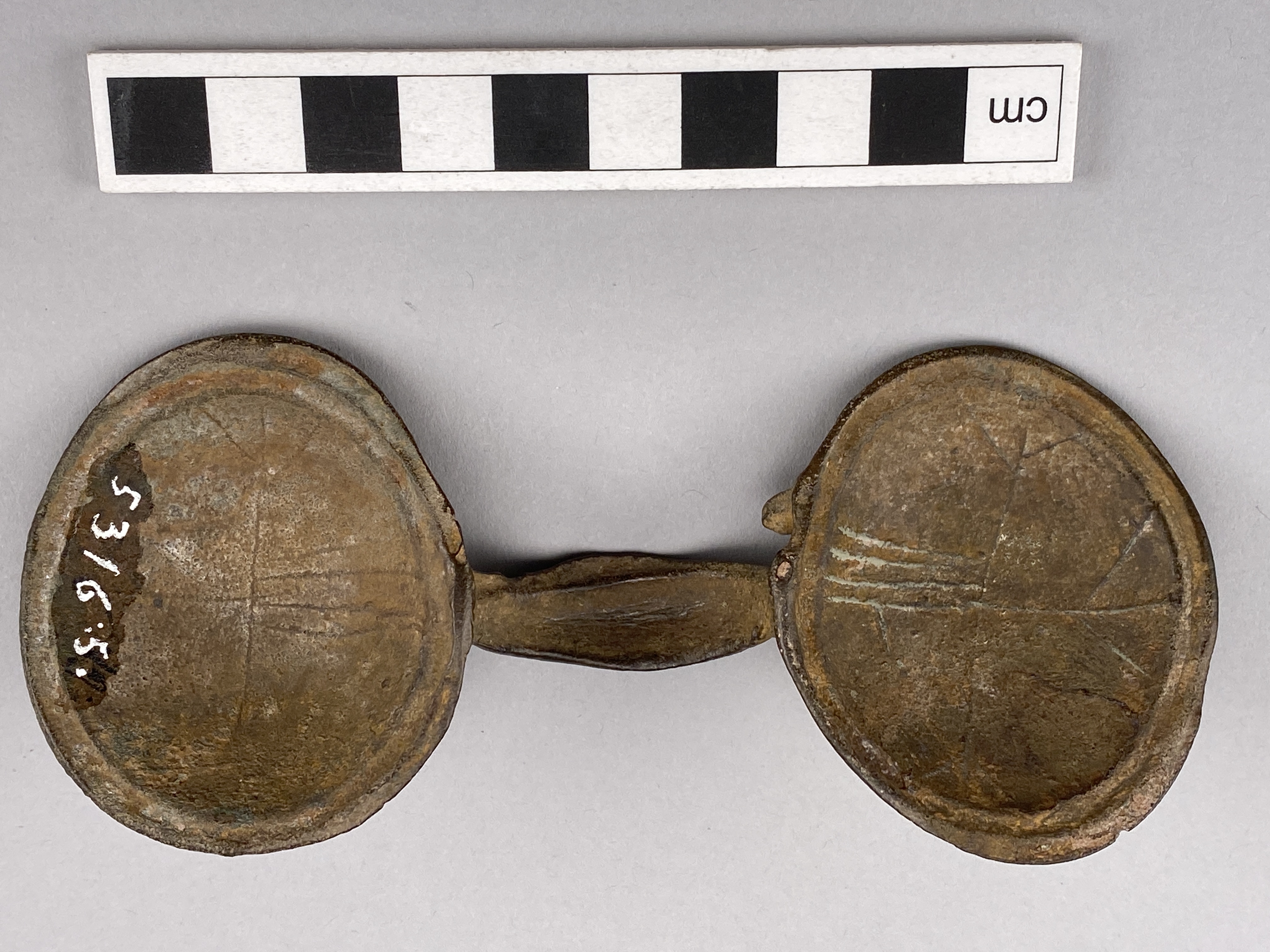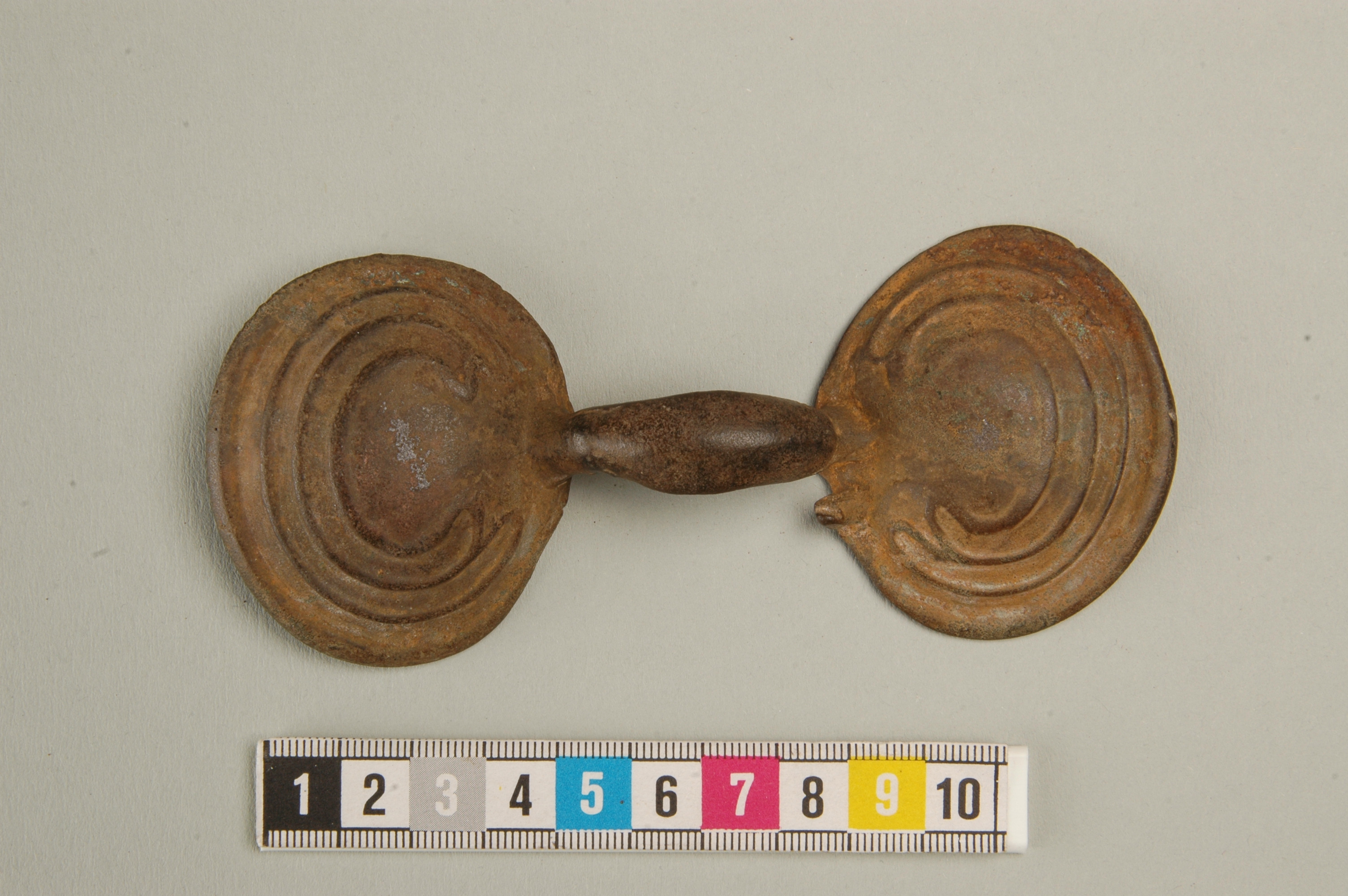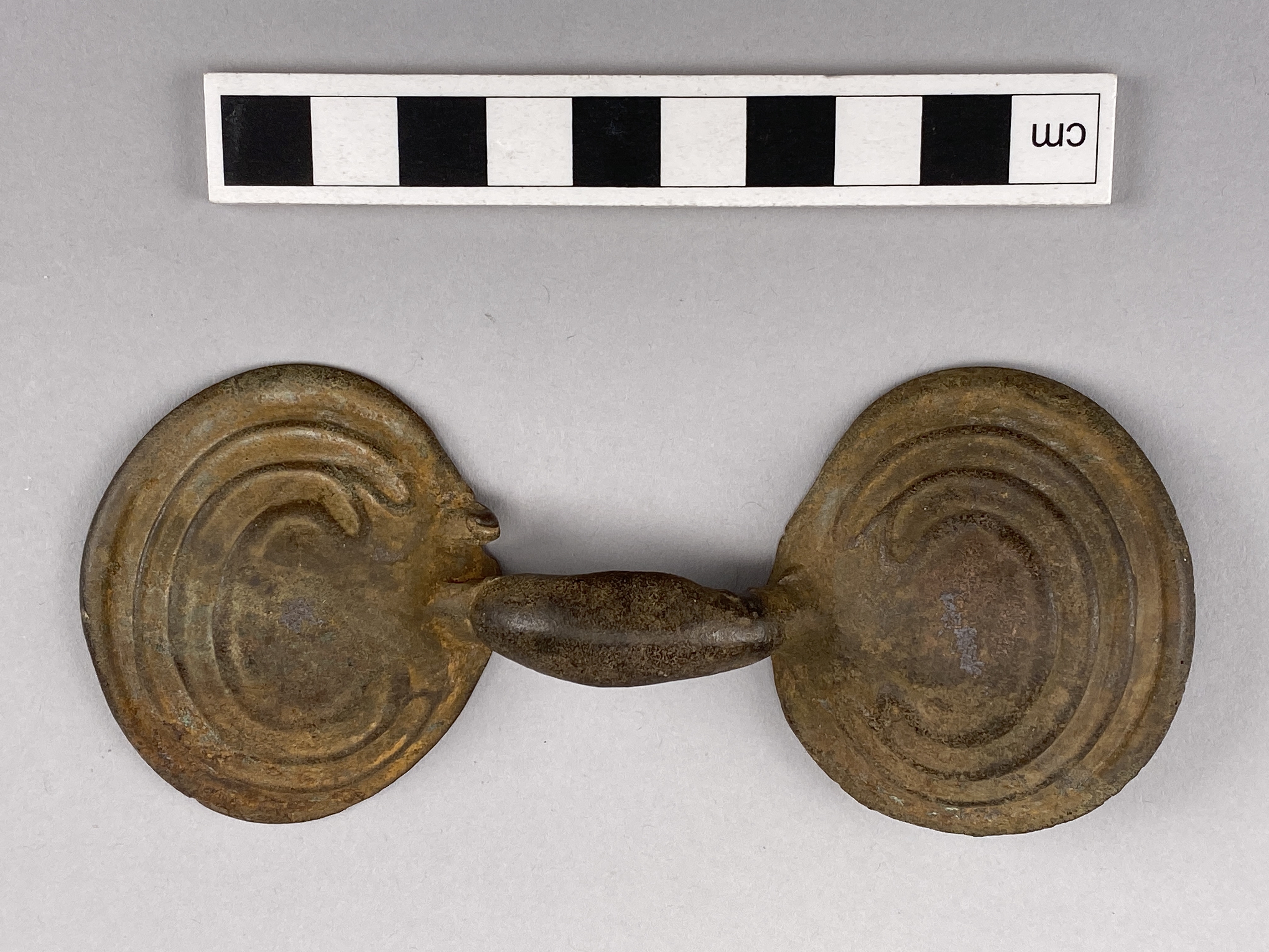 Glasögonspänne av brons ornerat med upphöjda parallella bandslingor.