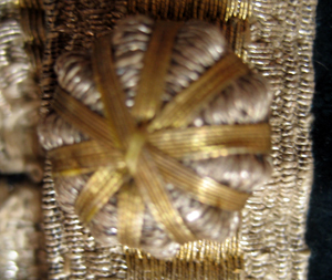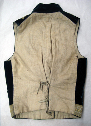 Väst av mörkblå sammet, garnerad med dubbla guld- och silvergaloner. Västen har en knäppning av 10 platta knappar överkläddamed ett snörmakeriarbete av guld- och silvertråd. På vardera framstycke är iskuret en horisontell ficka, l. 142 mm. Kragen är 60 mm hög. Bakstycket utgörs av naturfärgad linnelärft. I ryggsömmens nederkant förekommer ett kort sprund. I nederkanten sitter påsytt fyra smala linneband som knyts parvis. På insidan är fodrat med naturfärgad linnelärft.