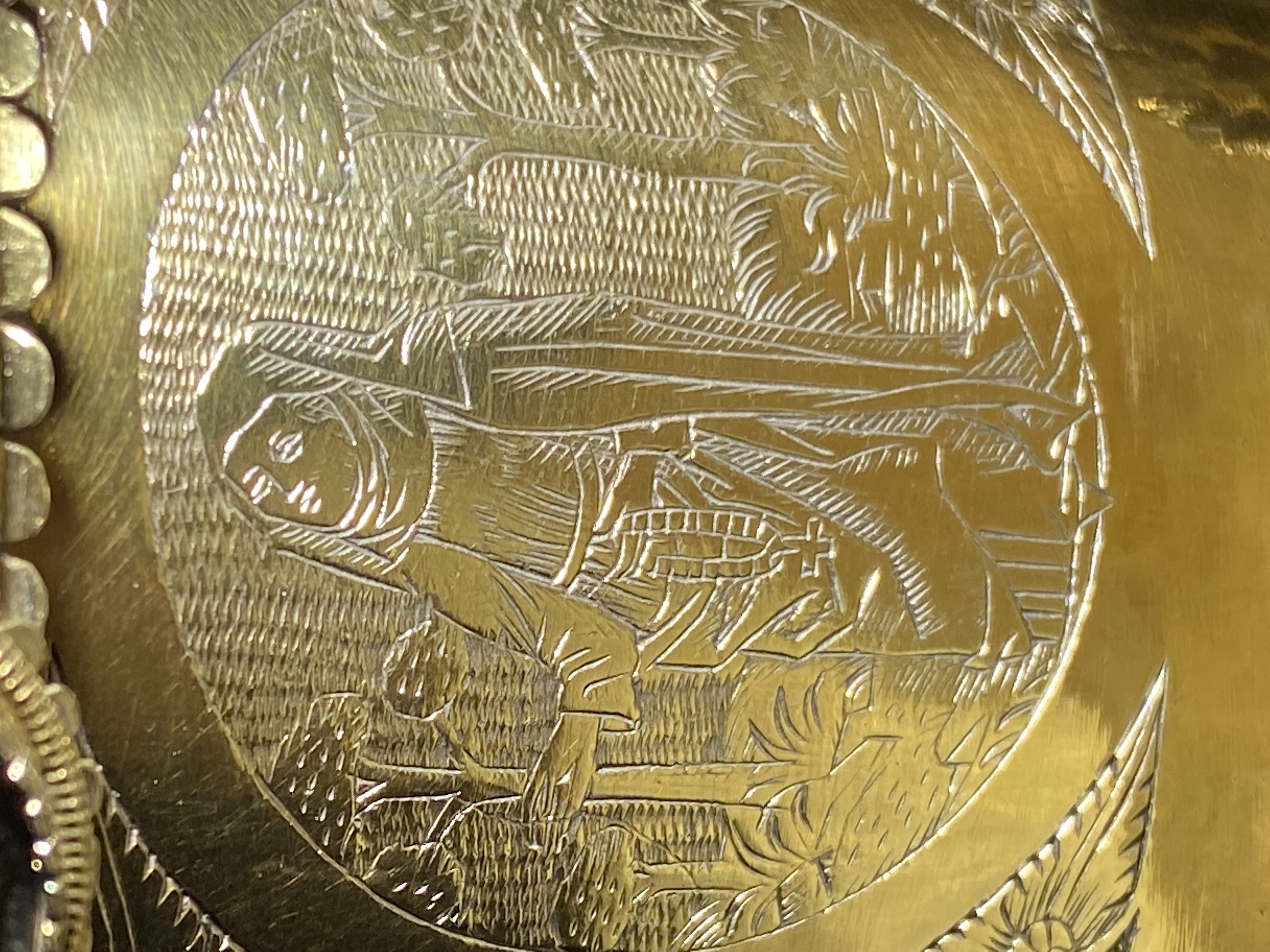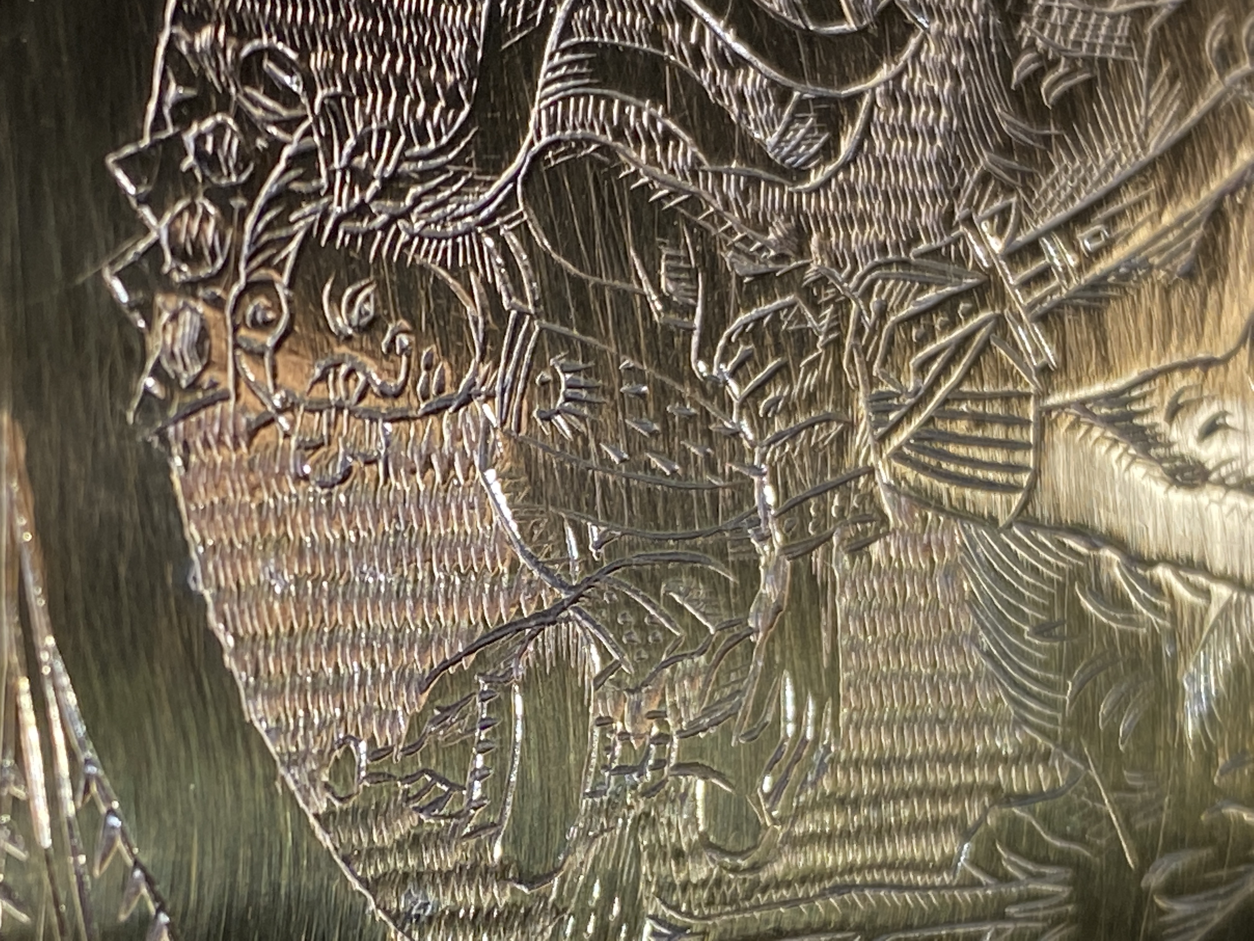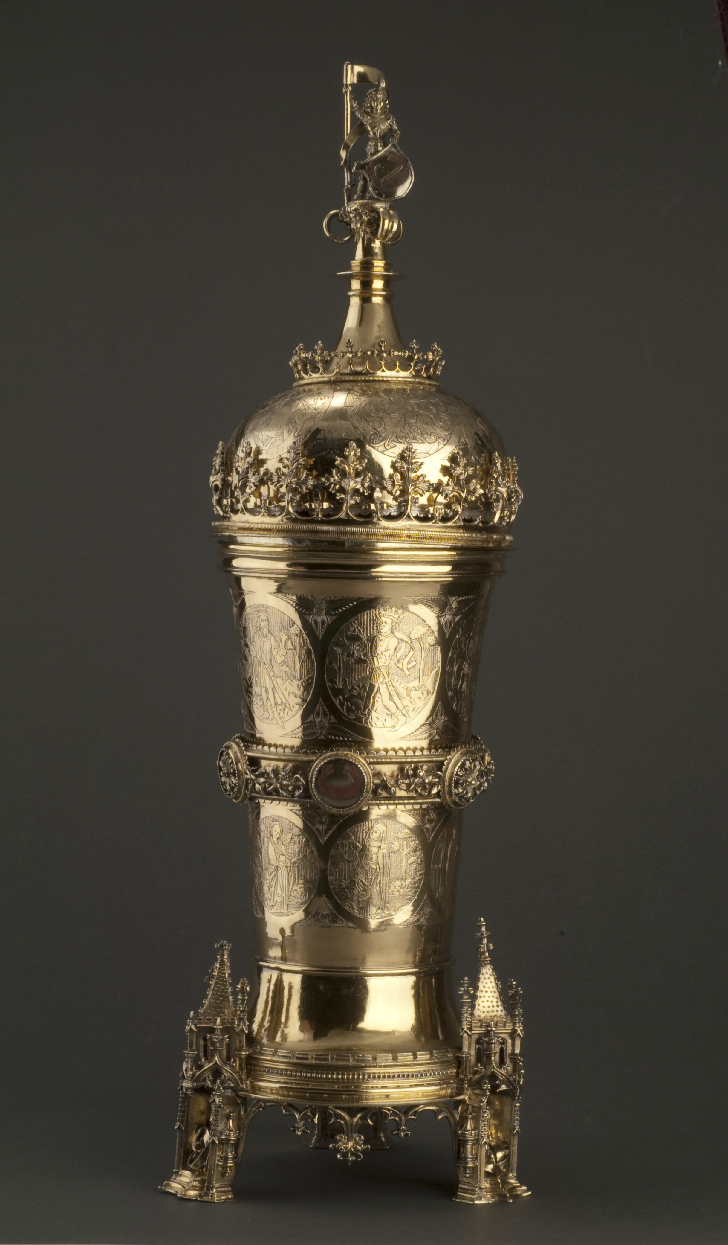 H. 43,5 cm, behållarens diam. över mynningsranden 11,5 cm. På behållaren graverade scener i 12 rundlar, 6 på vardera sidan om den vertikala gördeln. Under zonen: 1-2 Marias och Elisabets möte, 3-4 Marie bebådelse, 5-6 Kristi födelse. Övre zonen: 7-12 Konungarnas tillbedjan. Välvt lock krönt av stående riddare, som håller en vajande fana och en sköld med en båt som vapenbild. Under behållarens botten stämplad med Lübecks dubbelörn samt en tunna, stämpel för Franziskus Burmester, mästare i Lübeck från 1454 till ca. 1505. af Ugglas framför åren 1468-70 som sannolik tillkomsttid.