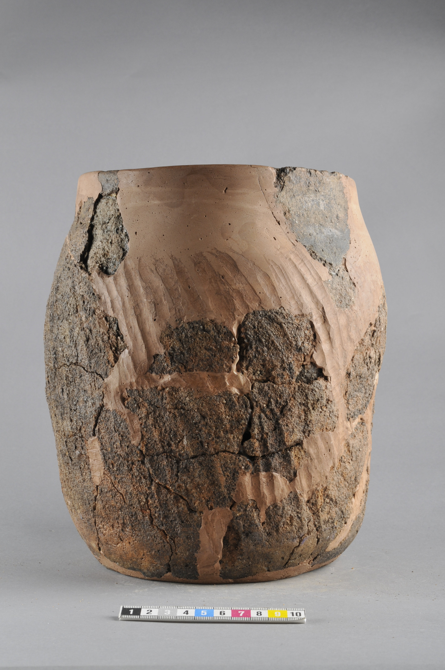 Rekonstruerat tunnformat kärl med indraget halsparti. Ytan är slät längs halspartiet och övergår sedan i fingerdragen rabbning.