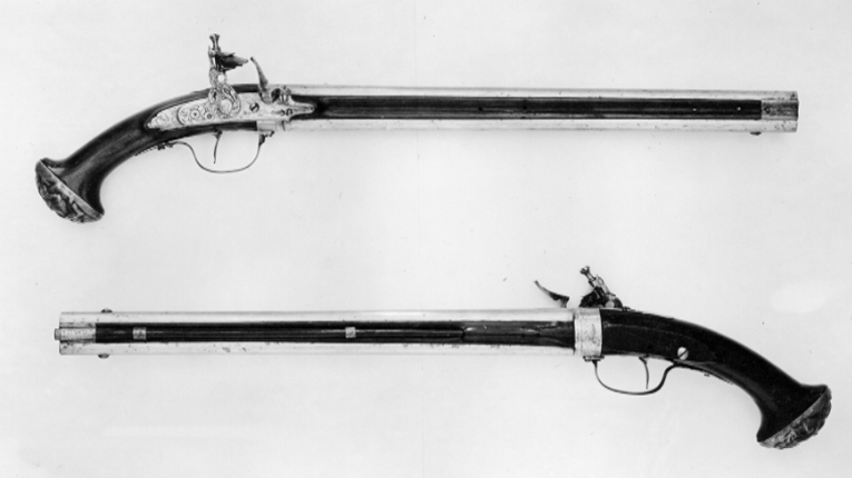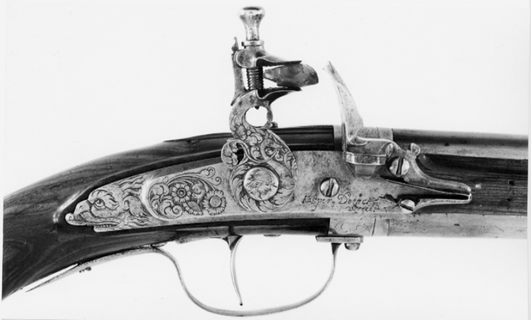 Runda, slätborrad pipor. Riktmedel: Spolformiga korn av mässing. Fästning och mekanik: På vardera pipan två häften. Piporna skruvade på platta med iskruvade svansskruvar med genomgående fänghål. På plattans framsida två styrtappar för framstocken. På baksidan en fyrsidig axel, l: 26 mm, baktill gängad. På tappen trätt en mässingsskiva, b: 12 mm, med två snett inborrade fängkanaler till skruvarna, på baksidan en svarvad, cirkelrund skåra med två stopphak i ytterkanten. Skivan roterar i stålcylinder, b: 15 mm, med "svansskruvblad" på ovansidan och avtryckarbleck på undersidan, ristad rankdekor på cylindern, hål för tändkanalerna på h. sida, utskott bakåt för låsets främre fästskruv. På undersidan rotationsspärr i form av varbygelns framstolpe, som går in igenom en på cylindern fastskruvad bricka, igenom cylindern och fästes i stopphaken på mässingsskivan. Piporna frigöres då varbygeln dras nedåt. Cylindern fäst på pipaxeln med bricka och mutter och i kolven med krysskruv underifrån samt skruv baktill på avtryckarblecket. Mellan piporna infört en framstock fäst med två pipstift av stål i vardera pipan. Flintlås med plant låsbleck, fasade kanter och försänkt bakspets, rundad kant. Bakspetsen graverad som odjurshuvud, på den plana delen graverade blomrankor, framför hanen graverad signatur: "Kasper Deinck // Vtrecht" (el dolt av fjäderlövet). S-formig, platt hane graverad med bladrankor samt djurhuvud, nötskruv med svagt välvt huvud utan skåra, graverat manshuvud med hjälm. Flik mellan hals och hanrygg samt mellan hals och underkäke. Rak, kantig hangren, rektangulära käkar, överkäken lös, omvängt koniskt käkskruvhuvud. Fängpanna med fasetterad undersida, batteri med kantigt fängpannelock och eldstål, fasetterad eldstålsrygg, vulstformig häl. Batterifjäder med fasade kanter, flikigt löv. Nöt utan studel. Låsbleckets främre hälft invändigt skålad. Fästning: En låsskruv från v sida, en kort skruv från h sida. Svagt böjd avtryckare. Helstock av jakaranda(?) i två delar, kolv och framstock. Kolv med ovalt tvärsnitt, oval kolvkula med kolvkappa av gjuten mässing, reliefdekor i form av enhörning i strid med lejon, två mässingsspikar. En (urspr. två) rörka av förgylld mässing, punsad dekor, näsband av mässing. Varbygel av stål, spetsig bakre arm fäst med skruv. Tillbehör: Laddstock av stockens trä, l: 330 mm, beslaget saknas.