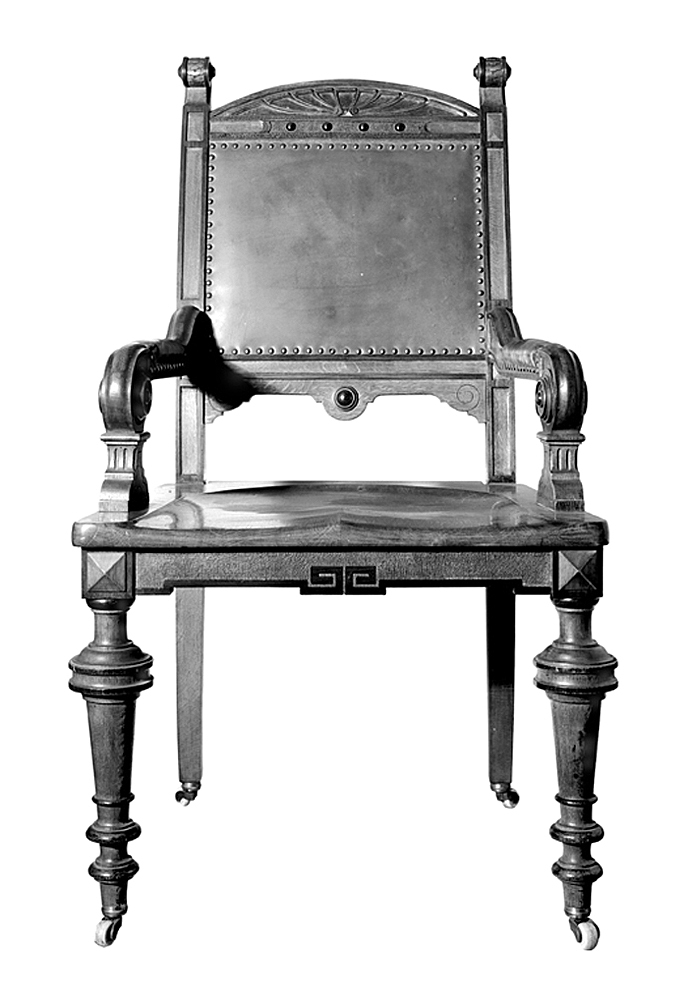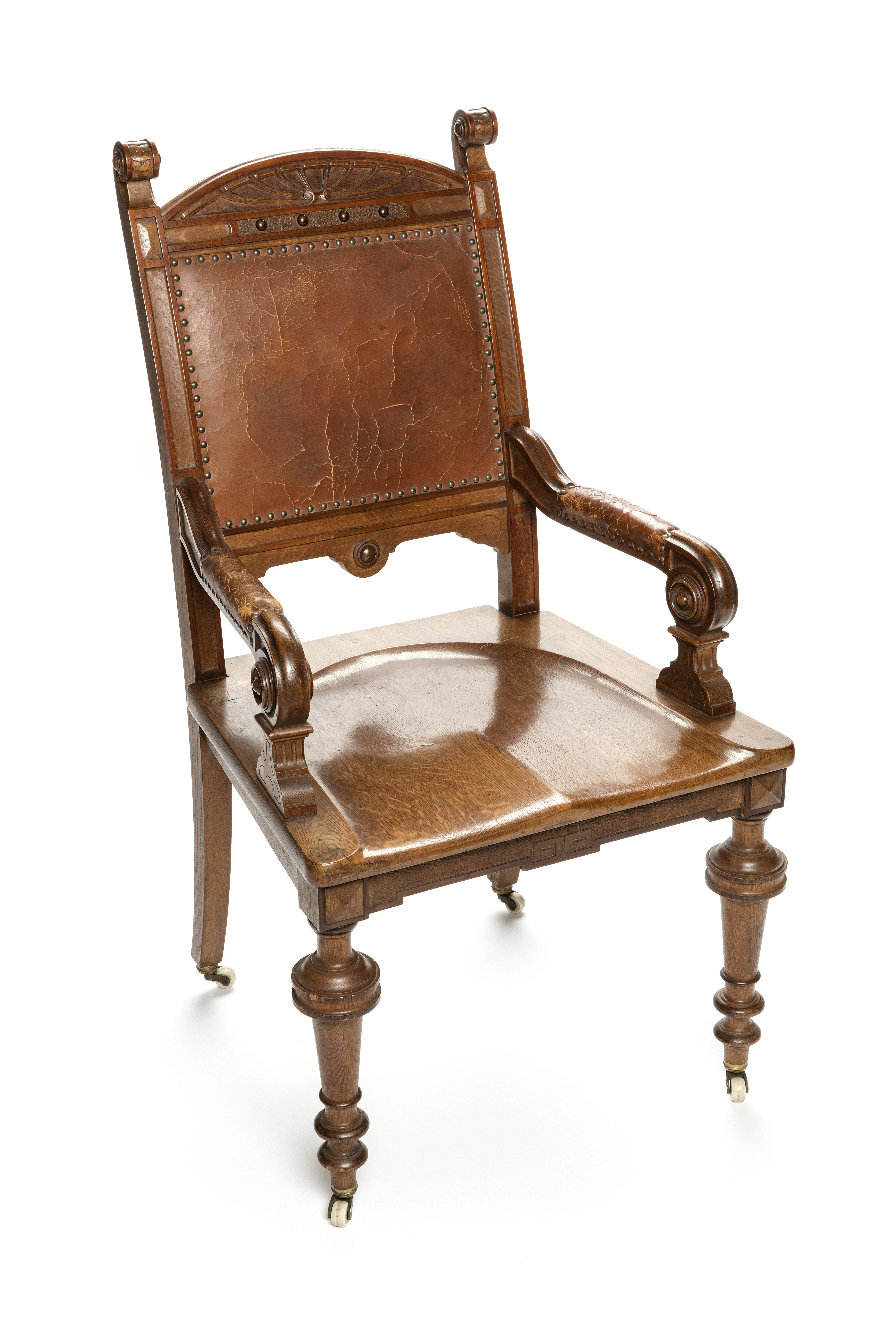 Med fyra ben, sarg, sits, rygg och armstöd. De främre benen svarvade, profilerade samt avsmalnande nedåt, de utstående stavarna och listerna brunbetsade. Överst en utsparad fyrsidig del för sargen, på dennas framsida en kvader; de bakre benen fyrsidiga, utsvängda bakåt och avsmalnande nedåt; under varje ben en porslinstrissa, rörlig i en svängbar mässingsgaffel. Sits bestående av en tjock skiva med kort utsprång och rundade kanter; översidan polerad. Rygg något tillbakalutad och svagt svängd, sidostyckena i samma stycke som bakbenen samt med övre ändan avslutad i en framåt inrullad volut ; på volutens utsida en insänkt botten med tvärgående tvärflikiga blad i fjällmönster, på vardera sidosidan en svarvad rosett; på vardera sidostyckets framsida en insänkt botten omgiven av en slät list, fanerad i valnötsträ samt polerad; botten över och under armstödet genom dylika lister avdelade i två fält, det övre på vardera stället kortare samt med bottnen kvaderliknande. Mellan sidostyckena upptill och nedtill ett tvärstycke; det övre med bågformig överkant, varpå en stav, kälformigt insvängd från sidorna; på framsidan upptill ett över hela bredden utbrett lågt åttastråligt palmettliknande ornament, nedanför detta en bård med insänkt botten mellan två släta lister; bottnen indelad i tre fält, det mellersta längre och prickerat, på detta fyra halvsfäriska knoppar av valnötsträ, fälten vid ändarna släta och skilda från det mellersta av en i båge tvärgående list. Nedre tvärstycket med de i tre utsprång konturerad underkant, det mellersta halvrunt och på framsidan med en svarvad rosett, de vid ändarna konsolliknande och på framsidan med en sirad snirkel.; ryggen inom tvär- och sidostyckena stoppad och klädd med ofärgad nöthud fäst med sittande möbelspikar . Armstöd: Den stående delen platt, med konturerade kanter, Den horisontala delen fyrsidig, med inre ändan insvängd mot ryggen, den yttre avrundad och avslutad i en från undersidan utgående rund utvidgning, på vars båda sidor en svarvad rosett; Längs mitten på över- och sidosidorna en läderstoppning, Tillhört inventarierna i Walther von Hallwyls privata kontorsrum, inrymt i Blasieholmstorg 11, Stockholm, 1884 - 30 September 1896, och Hamngatan 4, 1 Oktober 1896 - 1921.