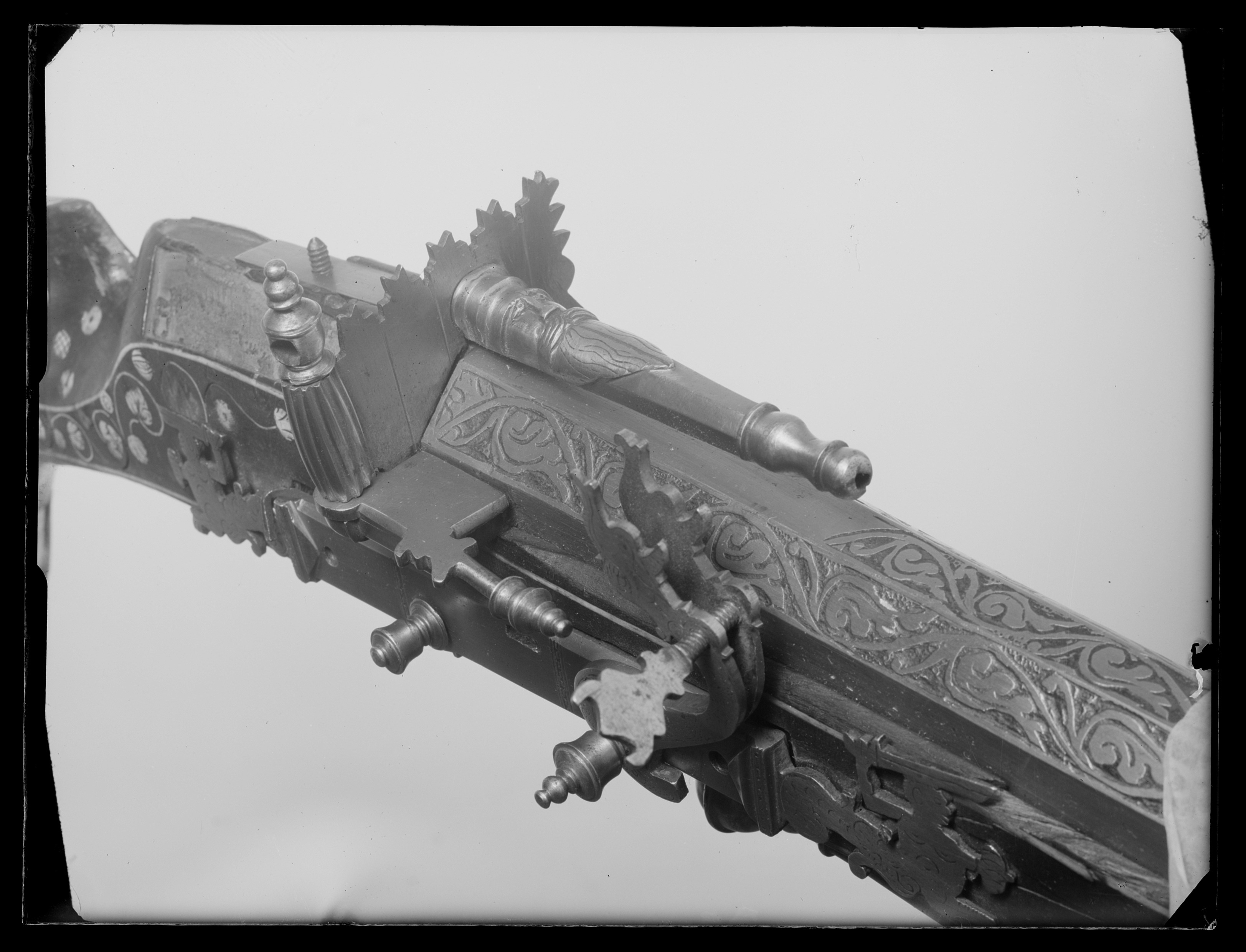 Åttsidig pipa av stål med grovfilade fasningar på undersidan, tvärt avskuret svansskruvblad. De tre övre sidorna graverade med bladrankor mot mörkpunsad bakgrund på pipans båda ändar samt på mitten. På kammarens undersida stämplat 3 gr: I L i sköld. Fyrsidig fängpanna med något fasade kanter, X i fängpannans botten, plant lock med i änden balusterformigt fingergrepp. Hög skärm med överkanten uppdragen i fem M-liknande spetsar, v.kanten med sågtandning, spolformig, kannelerad stolpe, fäst med skruv med urnformigt huvud med tvärgående hål. På skärmens båda sidor 4 graverade, vertikala streck. Riktmedel: Rörsikte, solsikte av stål med dekor i form av manshuvud med helskägg och yvig mustasch, siktet framför ansiktet åttsidigt, ändarna balusterformiga. Knoppkorn av stål. Fästning: Tre häften, de två bakre defekta. Pipan fäst med krysskruv underifrån samt ett pipstift av trä längst fram. Luntlås med rektangulärt, plant låsbleck med fasade kanter, i ändarna vertikala lister med graverad bård, på låsblecket däremellan ytterligare två vertikala dekorband. Låsbleckets ändar utformade som platta bladrankor, övergående i kentaurer med svärd och sköld, sparsam, punsad dekor av streck och båglinjer. S-formig, svagt välvd hane med dekor av rankor och punkter, luntklämma graverad som drakhuvud, klämskruvens huvud i form av romb med två horn. Hanskruv och stångaxelskruv med höga, urneformiga huvuden, på hanskruven dessutom en balusterformig spets. Låset invändigt grovfilat, stången samt stångfjädern är vid nöten graverade med tre resp. fyra vertikala linjer. Fästning: En, urspr. två låsskruvar, den bakre saknas. Låsblecket dessutom fäst meden stålhake på h. sida. Lång, s-formigt svängd hävstångsavtryckare med balusterformig, framåtriktad ände, avtryckaren på mitten förtjockad till en kula med mittring, d: 29 mm, flankerad av balusterformiga partier, delen framför kulan fyrsidig med fasade kanter, delen bakom kulan rund. Avtryckarbleck av ben med rundade ändar, s-formig rankdekor. Helstock av valnöt(?) med sluten laddstocksränna och muskötkolv med hög, smal rygg. Dekor på undersidan samt framstocken av benlister. På kolvens sidor samt på undersidan vid låsets framände glesa bladrankor med blad av vitt och ibland grönfärgat ben. På kolvens sidor stora konturerade benplattor med graverad dekor, på h.sida upptill en landsknekt i dräkt med kvarnhjulskrage, beväpnad med spjut med kvast samt värja. I nedre fältet en drake. På v.sida upptill en landsknekt i liknande dräkt med musköt över v.axel, muskötgaffel i h.hand, bantlär samt värja vid sidan. I nedre fältet en drake med huvudet riktat mot kolvänden. Längs kolvänden ursprungligen fem breda benplattor, en återstår på v.sida, graverad dekor iform av en springande hund. Vid svansskruvbladet urspr. tre benplattor(?), alla saknas. Vid bakre låsskruvens hål en stor benplatta med graverad dekor: Kain och Abel, framför låsskruvhålet de två altarna. På framstockens sidor djur: fyra hundar, hjort, vildsvin och hare, av vilka alla utom en hund springer framåt, mellan djuren runda benplattor med blomdekor (vita) eller bladdekor (grönfärgade). Över laddstocksrännans framände en benplatta med bladknippe. Näsbandet saknas.