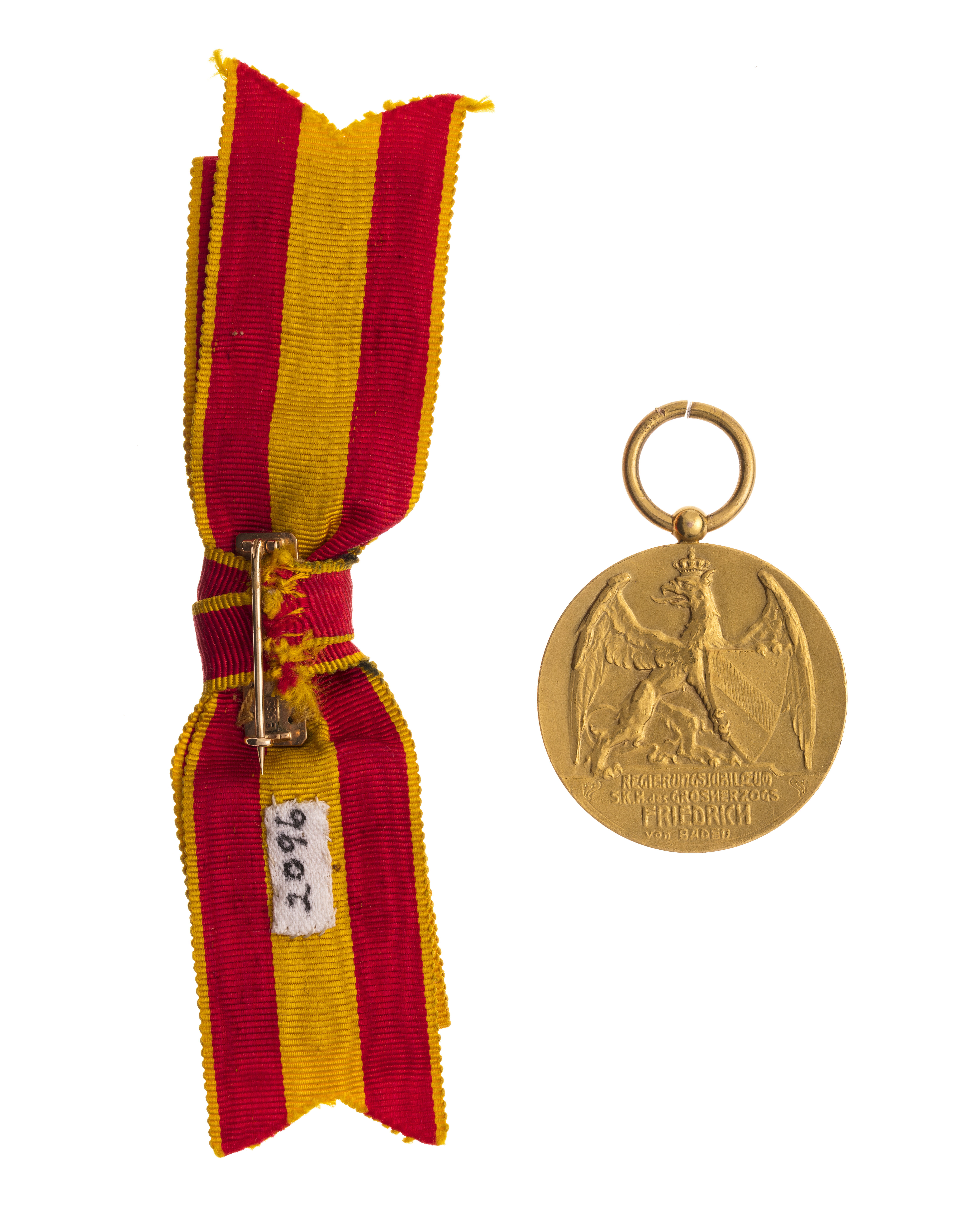 Åtsida: reliefporträtt av storhertig Friedrich av Baden, bröstbild, profil vänster, skägg och mustasch, uniform och kappa med stor krage, bakgrunden täckt med tätt lövverk av lagerkvistar, till höger årtalen: 1852 och 1902. Frånsida: vapensköld, Baden, sköldhållare krönt bakåtseende grip, stående på postament med text: "REGIERUNGSJUBILAEUM // S.K.H.des GROSHERZOGS // FRIEDRICH von BADEN". Upptill kulformig ring, däri fäst bandring av guld.