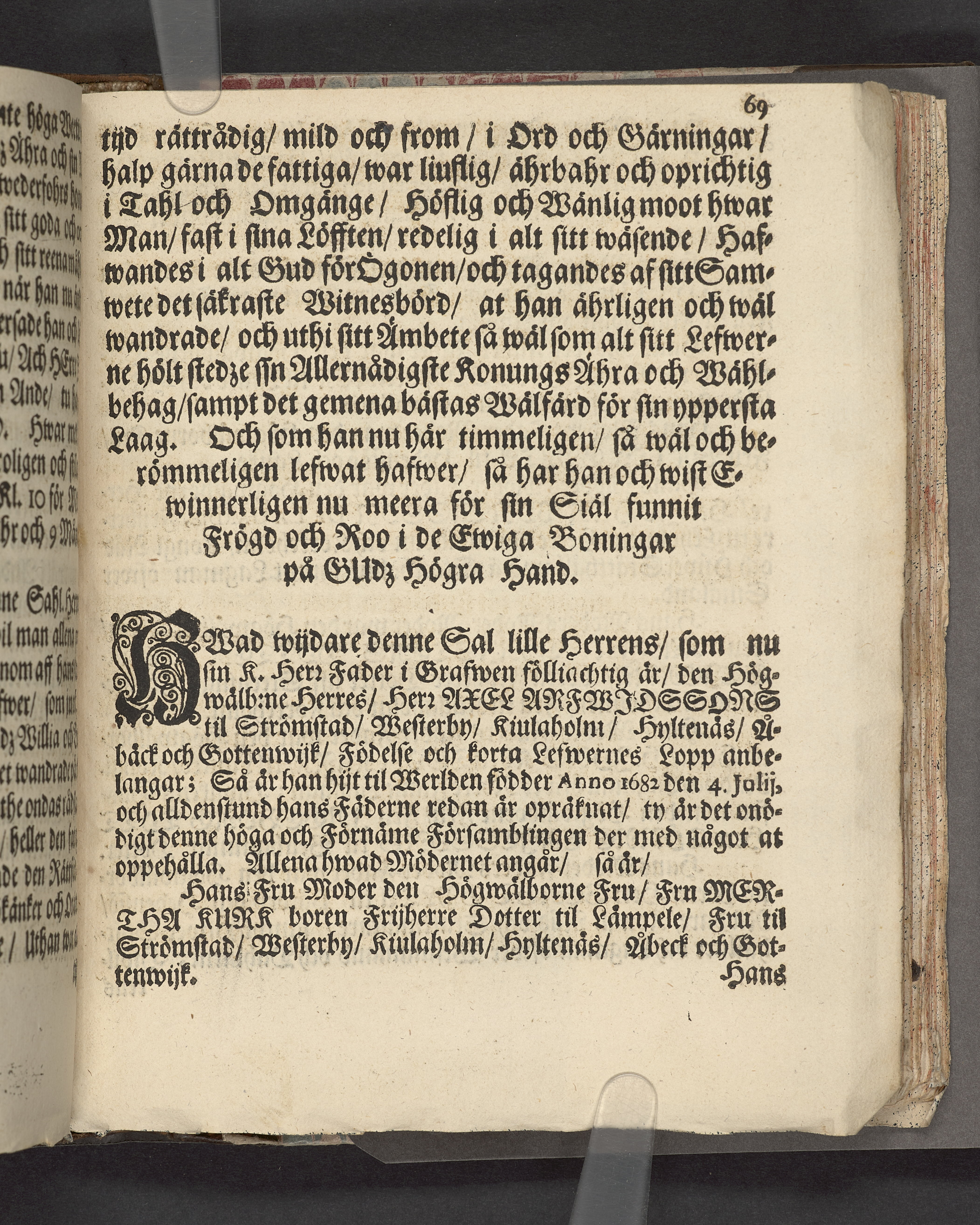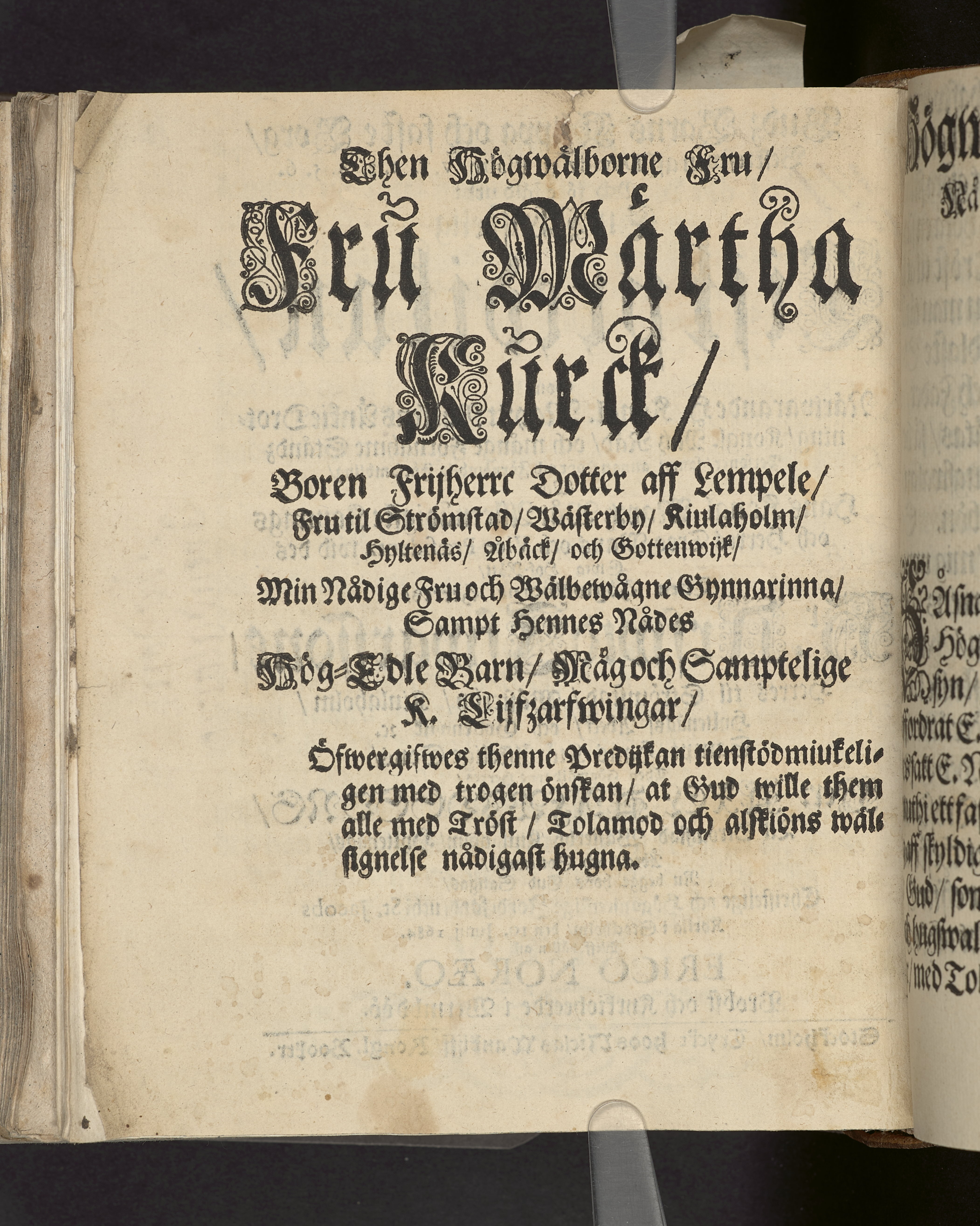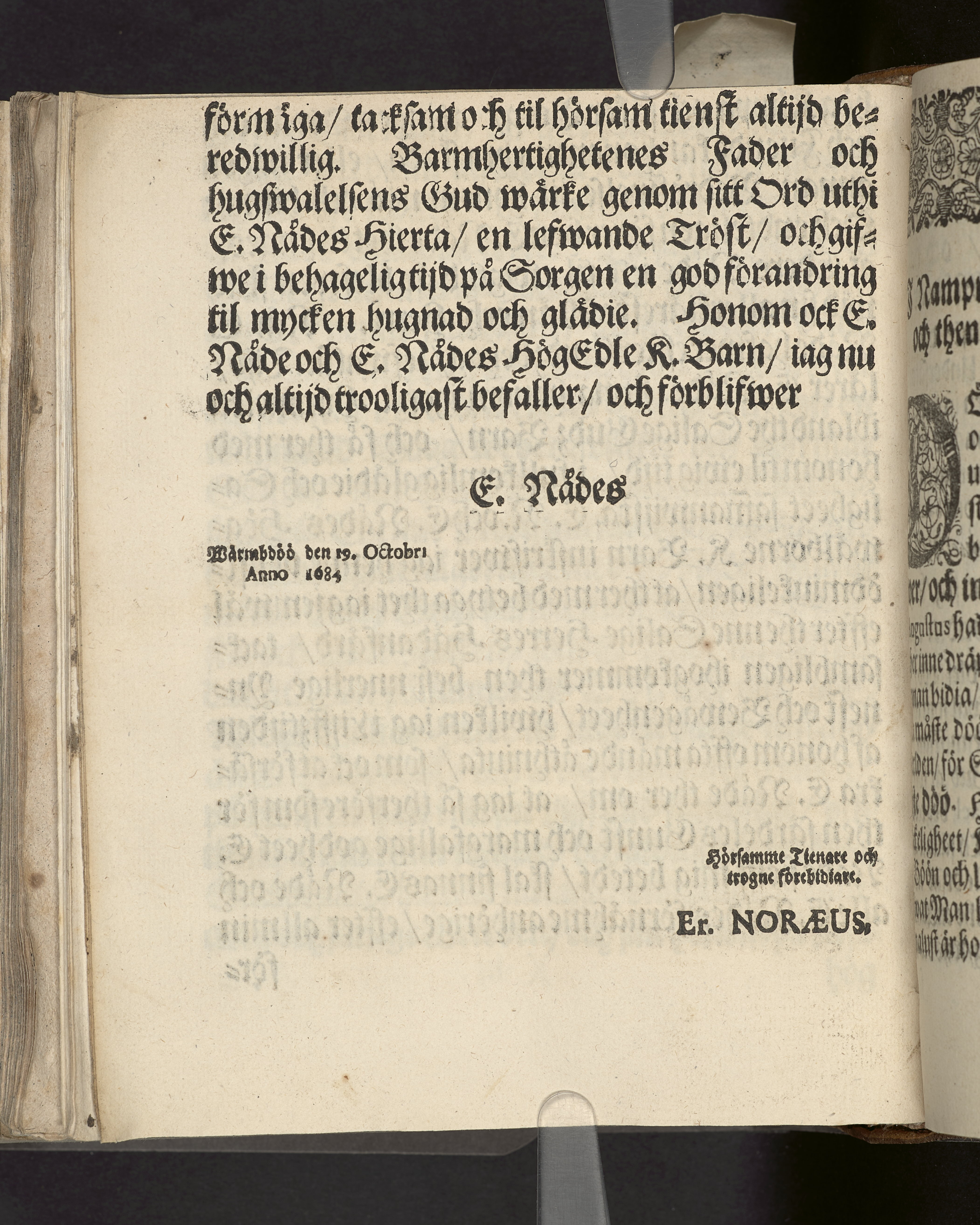 Gudz barns klippa och faste borg, beskrefwen aff Davidz 31. psalm. v. 1. 2. 3. 4. 5. 6. och förestäld uthi en christelig lijkpredikan, som närwarande h. kongl. may:tt rijksens änkie drotning ... sampt annan stoor och förnämblig försambling, med hans kongl. may:tz ... och herres troo-mans och vice præsidentz wid des Swea hof-rätt ... Arfwid Ifwarssons, herres til Strömstad ... sampt hans kiärälskelige sons ... Axel Arfwidssons ... nu begge hoos Gud saligas, christelige och höganseenlige jordefärd, uthi St. Jacobs kyrkia i Stockholm, den 10. Junij 1684. Bleff hållen aff Erico Noræo ...