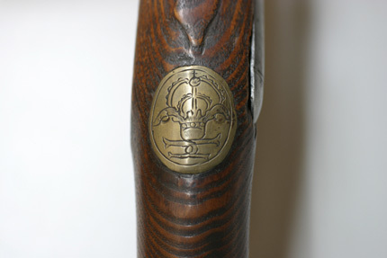 Rund, slätborrad pipa med åttsidig kammare, vid övergången fasade kanter, två tvärgående åsar. På pipans undersida en otydlig stämpel. Riktmedel: Spolformigt stolpkorn, sikskåra på pipbasen. Fästning: Två häften. Pipan fäst med krysskruv underifrån samt två pipstift av trä. Krysskruven har urtag för låsdelar. Hjullås av västeuropeisk typ. Plant låsbleck med fasade kanter, utanpåliggande hjul fäst med hjulbrygga och skruvar kl. 3 och 9. Hane med balusterformig kropp med fyrsidigt tvärsnitt, platt hals med svängd baksida, lös underkäke, käkskruv med fyrsidig flänsskalle. Rundad fängpanna med tämligen hög krutskärm. Fängpannelock med rörlig arm, s-formigt svängt fingergrepp. Balusterformig hanstudel. Låsblecket är stämplat på insidan med ett sju-ekrigt hjul. Fästning: Två låsskruvar (?). Svagt böjd avtryckare. Helstock av fransk typ av alm. Beslag av stål. Kolvkappa utan flikar, genombruten med runda hål och lambrekäng-liknande utskärningar. En rundad rörka samt näsband ca 5 mm från mynningen. Oval tumplåt av mässing med namnchiffer, spegelmonogram C krönt av kunglig krona. Rak varbygel. Tillbehör: Laddstock, l: 324 mm av trä med urnformig skoning av stål i stötänden.