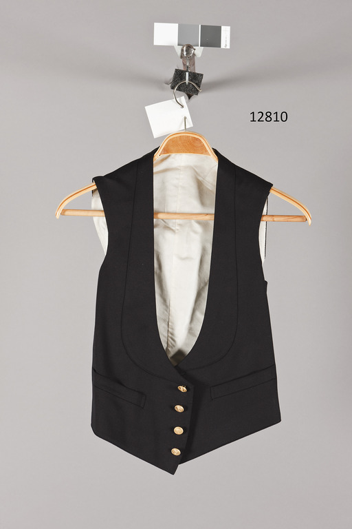 Väst av mörkblått kläde, med schalkrage och enkel rad om fyra knappar. Knapparna förgyllda, med krönt ankare, lagerkvist och repstavsbård, allt i kraftig relief, d: 17 mm, på undersidan inpräglat: "JENNENS & Co // LONDON". Två något snedställda stolpfickor fram. Ryggstycke av mörkblått diagonalkypert med spänntampar och nedtill sprund. Foder av vit diagonalvävd bomullssatäng. Fickornas foder av mörkbrunt diagonalvävt bomullssatäng.