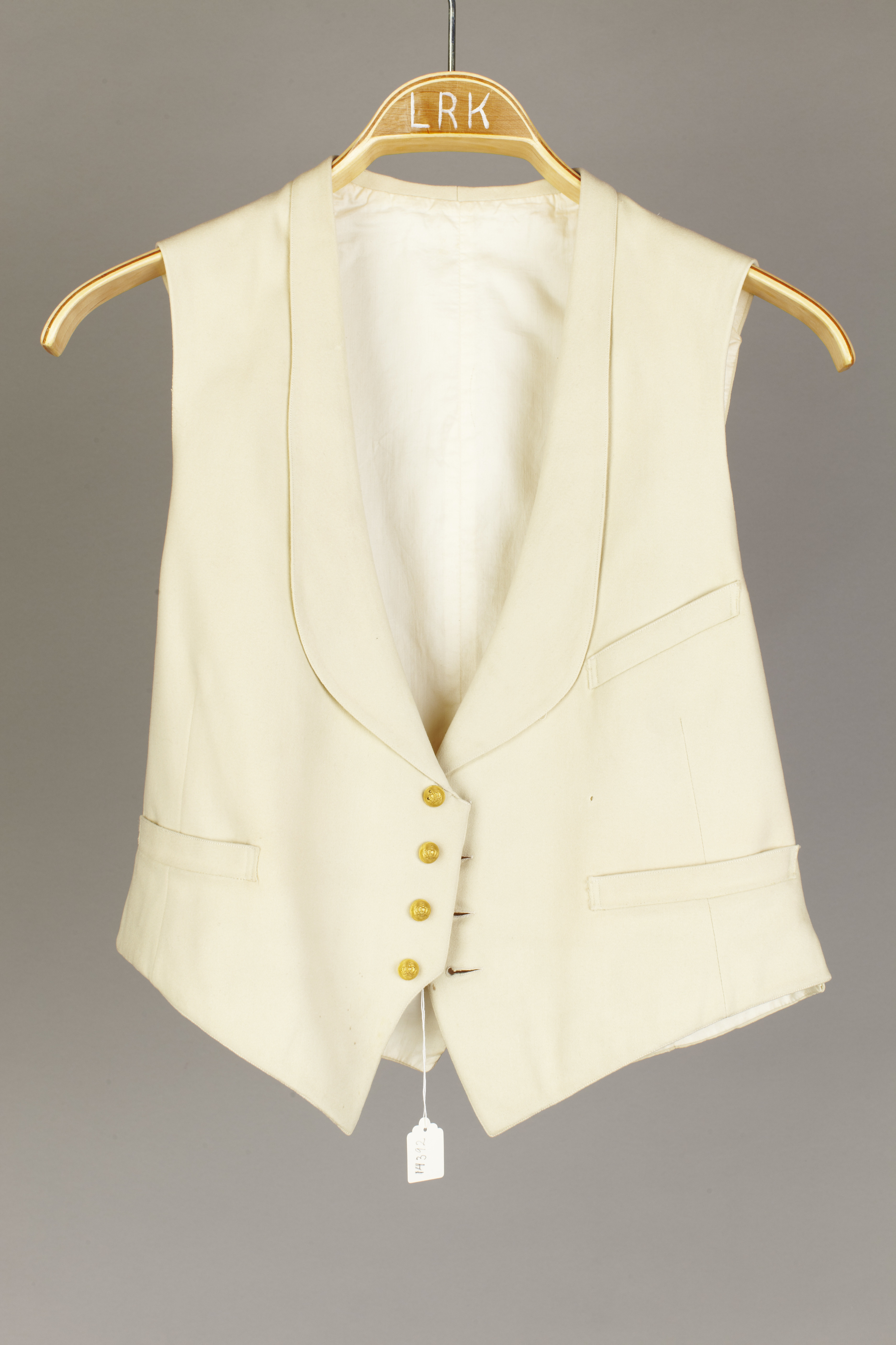 Väst av vitt kläde med sjalkrage. Enkel, öppen knäppning med fyra förgyllda mässingsknappar, kullriga, räfflade, och med krona, d: 12mm. Knapparna fästa med påträdda mässingsringar som döljs med en klaff av vitt kläde. Tre stolpfickor fram. Bakstycke av vit yllekypert med spänntampar med mässingssölja märkt: "F.W. & S". Foder av vitt ylletyg. Ryggl: 520mm, ryggb: 350mm, fram l: 200mm, midja: 640mm.