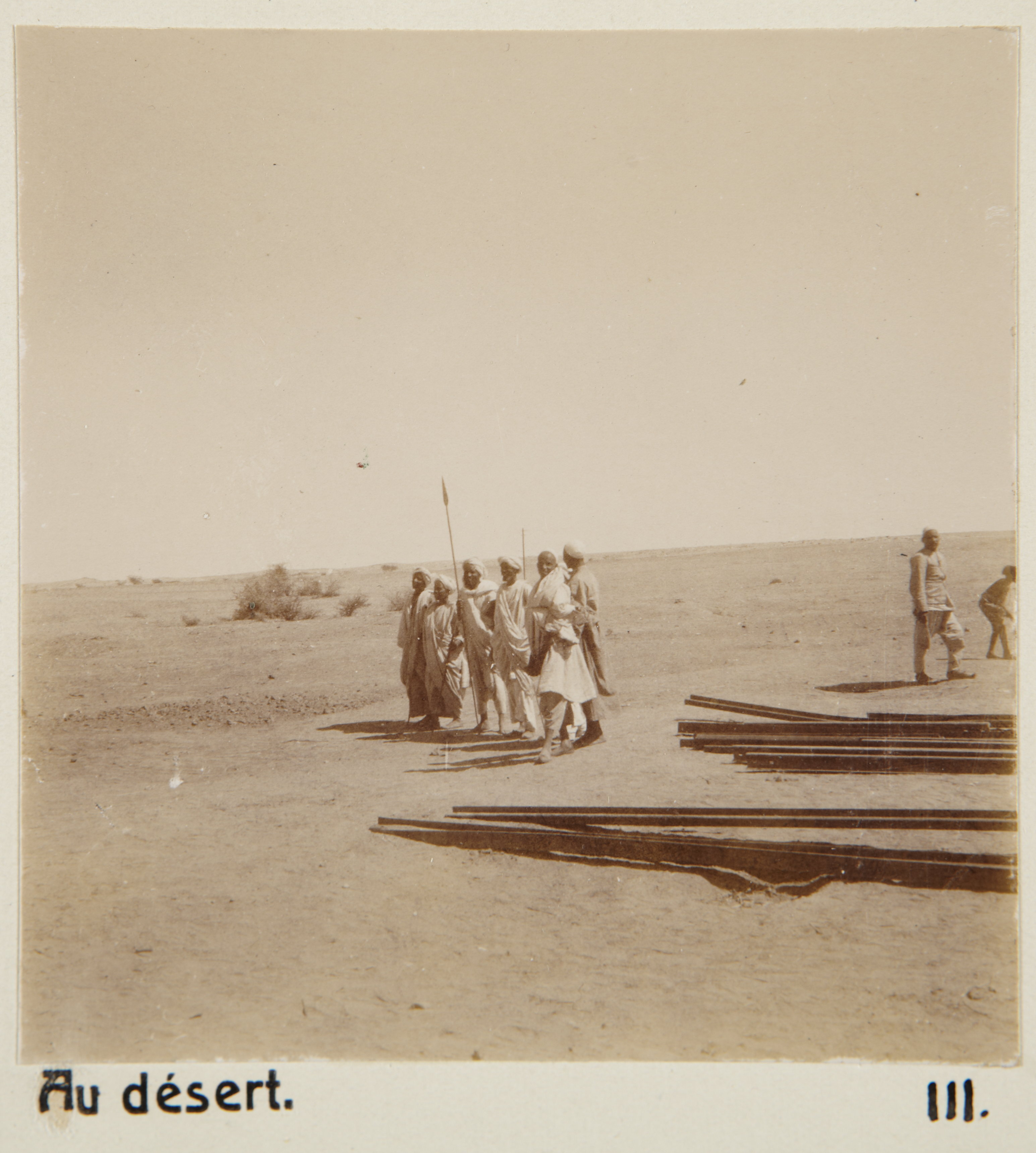 I öknen. Sudan. Text på fotografiet: Au désert Fotografierna LXVI:M.01.- 201. kommer från resan till Egypten och Sudan som Wilhelmina och Walther von Hallwyl gjorde vintern 1900-1901. De lämnade Sverige den 5 november 1900 och fortsatte från Egypten till Palestina den 28 mars 1901. Med på resan var döttrarna Ellen med maken Henric de Maré och Irma med maken Wilhelm von Geijer. Wilhelminas sällskapsdam, fröken Ida Uhse reste också med. Under en del av resan anslöt sig ledamoten av Internationella domstolen i Kairo, assessorn Otto Conrad Waldemar Cedercrantz med makan Anna Elisabeth. Vid resan uppför Nilen hade Walther von Hallwyl hyrt ångfartyget Columbia med besättning. Båtresan startade i Kairo 27 december 1900, gick ända till Wadi Halfa varifrån man reste vidare med tåg till Khartum och tillbaka till Wadi Halfa. Båten vände åter i riktning mot Kairo, men det verkar som att sällskapet tog tåg sista biten, från Luxor. Henric och Ellen de Maré samt fru Cedercrantz lämnade båten redan då de passerade Luxor första gången. Resten av sällskapet återvände till Kairo den 1 mars. Fotografierna LXVI:M.01.-120. togs av resenärerna själva, de största av Ellen de Maré, de mellersta av Wilhelmina von Hallwyl och de minsta av Wilhelm von Geijer. Resten köptes av professionella fotografer i Kairo, de flesta från Studio Photogr. Artistique G. Lekegian & Cie. Alla uppgifter kommer från Ida Uhses reseanteckningar.