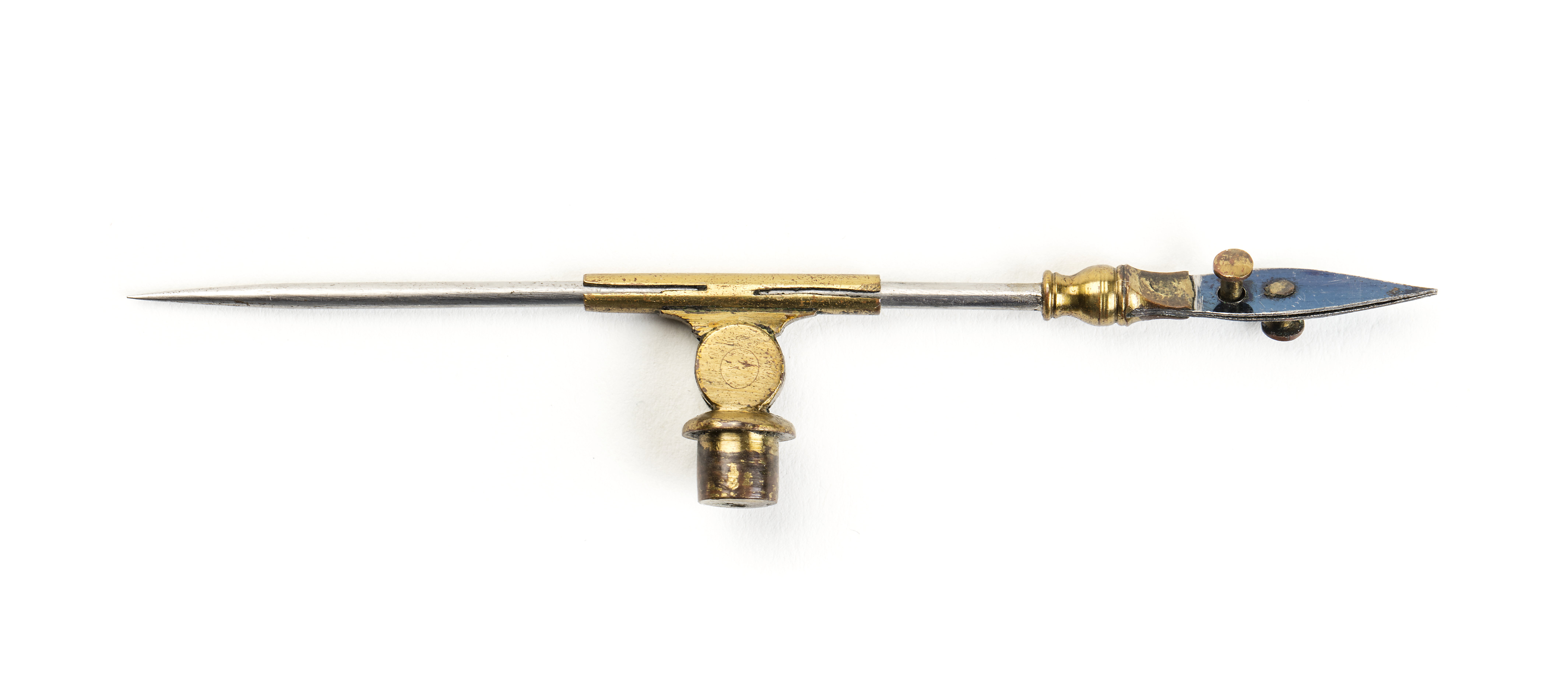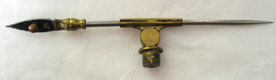Bestående av ledad hållare i mässing med cylindrisk fot passande i spår i mikroskopet. Genom hållaren löper en ca 70 mm lång stålten med spetsig ände. I andra änden liten mässingshylsa med två spetsiga blad av fjäderstål. I var blad ett stift, som vid tryck pressar bladen isär.