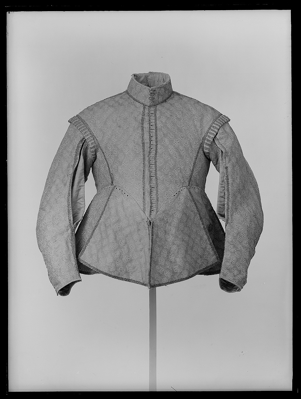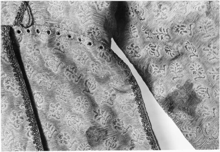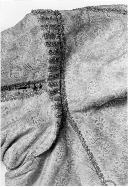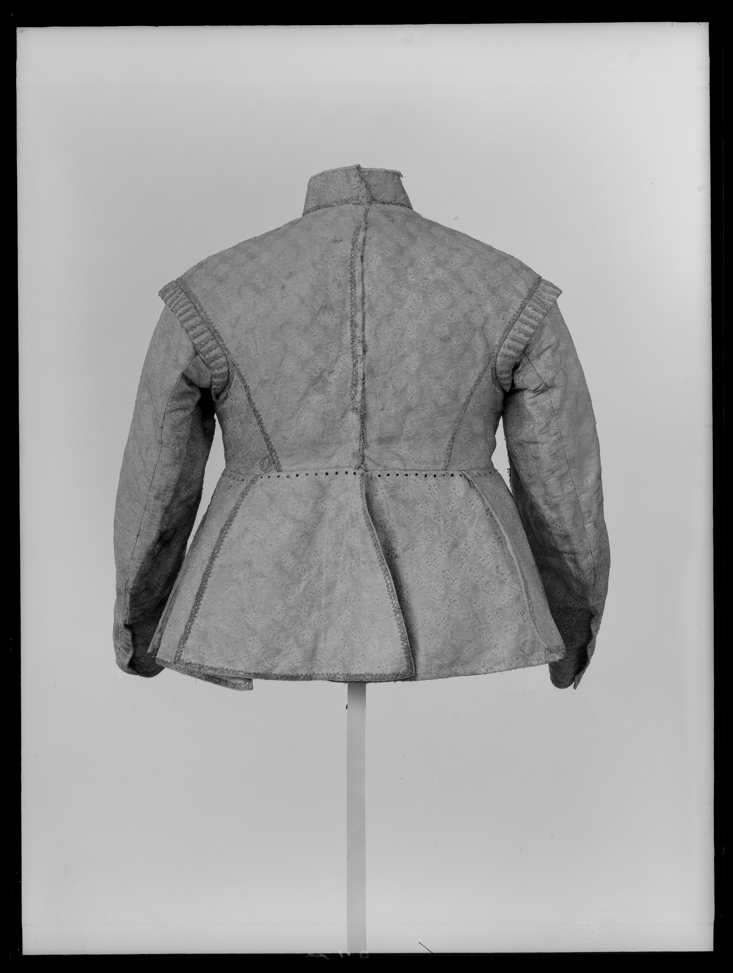 Tröja av guldbrokad på silverbotten med ett tätt mönster av gyllene blommor som avtecknar sig mot en silverbotten, mönsterrapport 7,6 x 7,6 cm. Tröjan har framtill en knappslå. På vänster framstycke finns en obruten rad om 29 knappar och på höger framstycke finns 2 cm långa knapphål ca 1,5 cm långa och sydda med ljust silke mellan 2 parallellt påsydda silverspetsar. På höger ärm finns de 7 nedersta ärmknapparna kvar, på vänster ärm de 6 nedersta. Tröjan har 8 stora skört med snörhål, vid midjan finns smala silvertränsar intill spetsarna som betonar vertikallinjen framtill. Kragen har 4 tränsar på vänster sida. Axelkarmarna är 49,5 cm långa, de lämnar 10 cm av ärmringningen bar och 3 cm breda max. Ärmarna har sprund i inre sömmen, cirka 28 cm långa, de börjar så gott som omedelbart uppifrån axeln. Runt sprundets kant löper en 9 mm bred knypplad silverspets med uddar i ena kanten och med 2 inlagda 1 mm breda silverlan. Längs de långa ärmsprunden har små knappar suttit i tät rad på ömse sidor - 2 knappar (diameter 8 mm) framtill av guld- och silvertråd är allt vad som återstår på höger ärm. Ärmarna har nedtill 12 knapphål till små metalltrådsknappar. Ärmarnas nederkanter, kragen och framstyckena är skodda med ripsband. Invändigt har framstyckena försetts med en triangulär planschett på vilken en lös tamp, klädd med de gula fodersidenet, sytts. Den har utåt vidgad runddad form och har ett hål. I midjan sitter 8 stycken, ca 4 cm långa och 2 cm breda tampar, klädda med gul atlas och försedda med vardera 1 hål. Tröjan har blivit uppklippt i ryggen bak, i kragen och i det övre ryggpartiet (5 cm + 5,5 cm, och är "slarvigt" hopsydd. Längs vänster sidas ryggstycke, mitt bak, löper den silverspets som brukar dekorera plagget. Det förefaller som om knappar också sytts här (av spåren att döma). Tröjan har sannolikt ursprungligen haft ett 24 cm långt sprund, 8 cm från nederkanten och uppåt. Det fjärde skörtet framifrån på höger sida, det som sträcker sig längst bakåt, saknar silverspets, den har sprättats bort, det finns spår av silvertrådarna. Tröjan har en träns för gehäng, ca 22 cm, intill vänster sidosöm, ca 1 cm in på det förlängda framstycket, 22 mm från nederkanten. Spår av blod eller kroppsvätska finns på vänster sida i ryggen och vänster ärm. Foder av citrongult atlassiden med mellanfoder av vit lärft. Skörten har mellanfoder av svart ylle. Kragens höjd fram 5,7 cm, bak 4,5 cm. Axelsöm, längd 19 cm. Tröjan ingick i den svepdräkt som kläddes på den döde Gustav II Adolf efter balsameringen i Weissenfels den 7 november 1632. Den har skurits upp i ryggen och har spår av blod under vänstra skulderbladet samt inuti vänstra ärmen, strax ovanför armbågen. I svepdräkten ingick byxor (inv.nr 19325), sveptröja (inv.nr 31142) samt krage (inv.nr 31139) och manschetter (inv.nr 31140-41).
