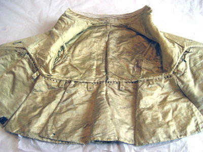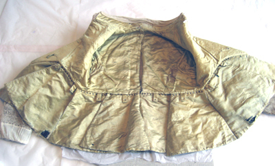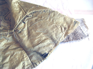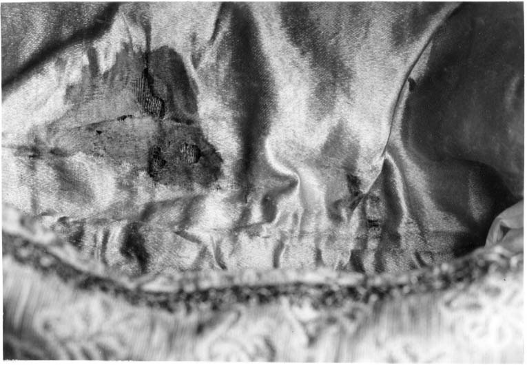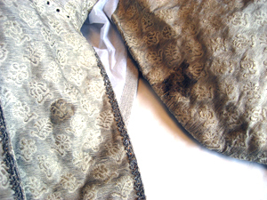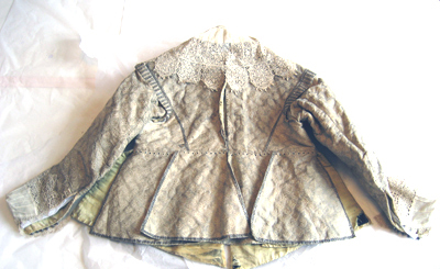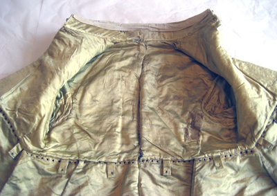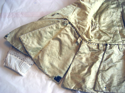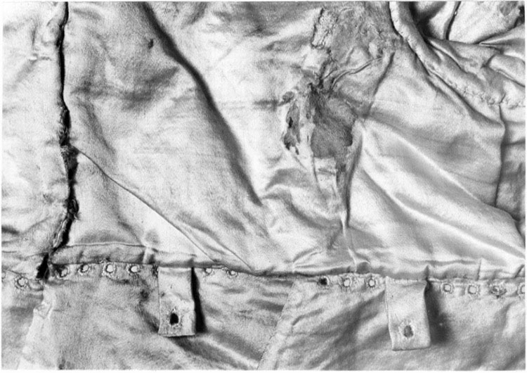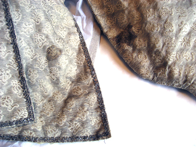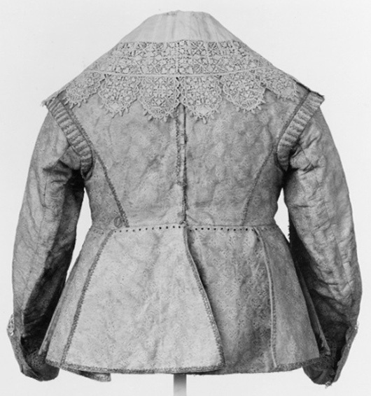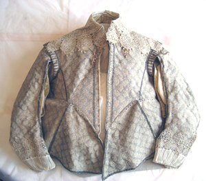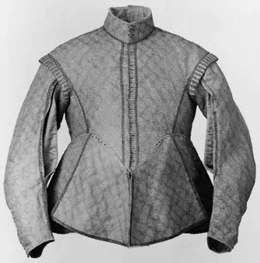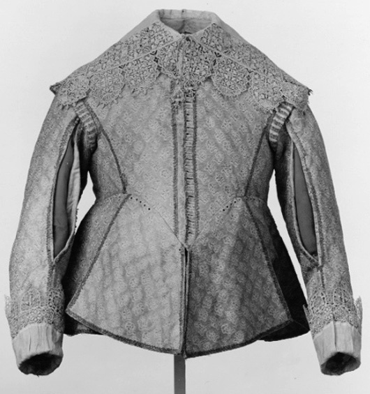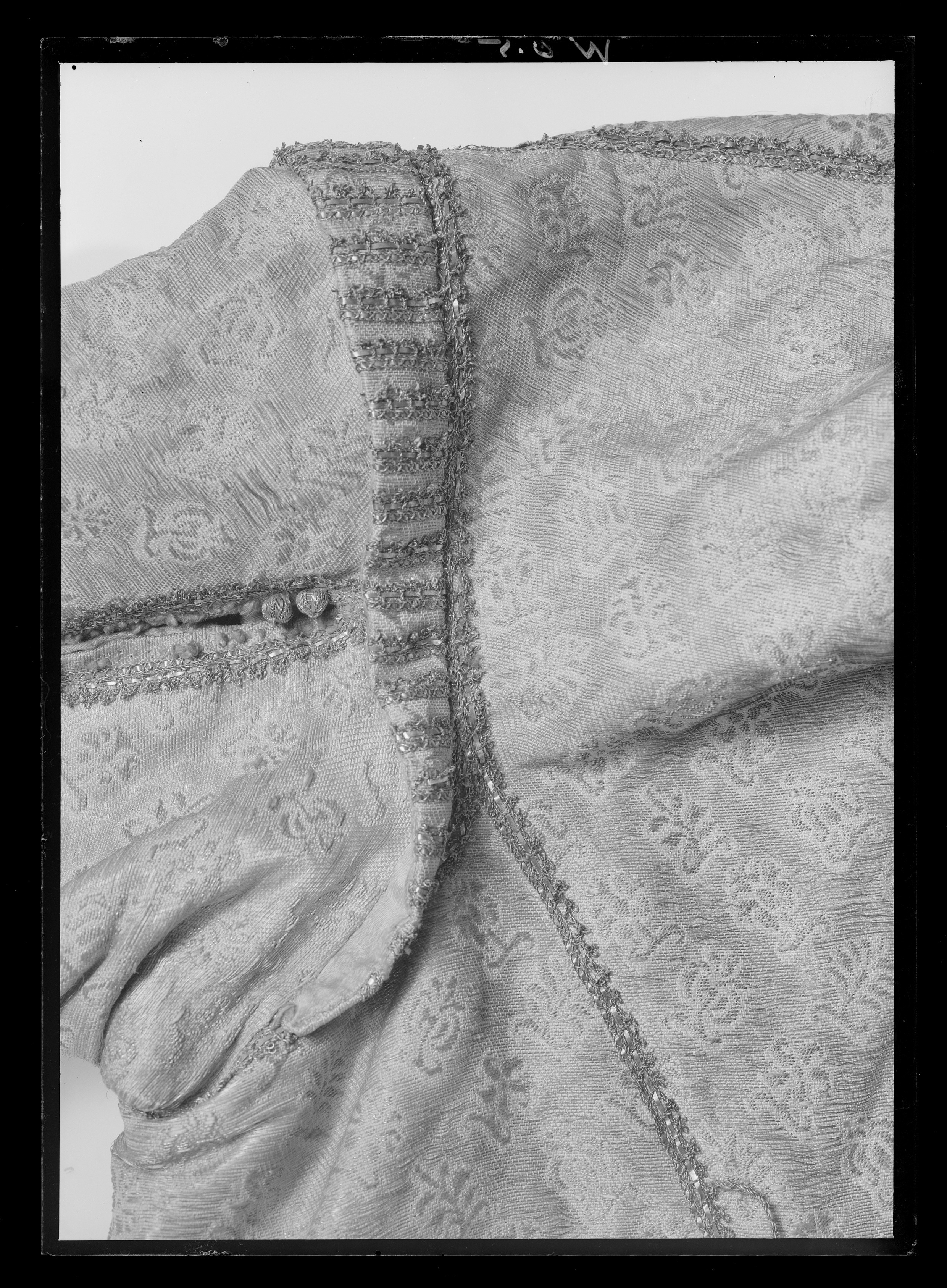 Tröja av guldbrokad på silverbotten med ett tätt mönster av gyllene blommor som avtecknar sig mot en silverbotten, mönsterrapport 7,6 x 7,6 cm. Tröjan har framtill en knappslå. På vänster framstycke finns en obruten rad om 29 knappar och på höger framstycke finns 2 cm långa knapphål ca 1,5 cm långa och sydda med ljust silke mellan 2 parallellt påsydda silverspetsar. På höger ärm finns de 7 nedersta ärmknapparna kvar, på vänster ärm de 6 nedersta. Tröjan har 8 stora skört med snörhål, vid midjan finns smala silvertränsar intill spetsarna som betonar vertikallinjen framtill. Kragen har 4 tränsar på vänster sida. Axelkarmarna är 49,5 cm långa, de lämnar 10 cm av ärmringningen bar och 3 cm breda max. Ärmarna har sprund i inre sömmen, cirka 28 cm långa, de börjar så gott som omedelbart uppifrån axeln. Runt sprundets kant löper en 9 mm bred knypplad silverspets med uddar i ena kanten och med 2 inlagda 1 mm breda silverlan. Längs de långa ärmsprunden har små knappar suttit i tät rad på ömse sidor - 2 knappar (diameter 8 mm) framtill av guld- och silvertråd är allt vad som återstår på höger ärm. Ärmarna har nedtill 12 knapphål till små metalltrådsknappar. Ärmarnas nederkanter, kragen och framstyckena är skodda med ripsband. Invändigt har framstyckena försetts med en triangulär planschett på vilken en lös tamp, klädd med de gula fodersidenet, sytts. Den har utåt vidgad runddad form och har ett hål. I midjan sitter 8 stycken, ca 4 cm långa och 2 cm breda tampar, klädda med gul atlas och försedda med vardera 1 hål. Tröjan har blivit uppklippt i ryggen bak, i kragen och i det övre ryggpartiet (5 cm + 5,5 cm, och är "slarvigt" hopsydd. Längs vänster sidas ryggstycke, mitt bak, löper den silverspets som brukar dekorera plagget. Det förefaller som om knappar också sytts här (av spåren att döma). Tröjan har sannolikt ursprungligen haft ett 24 cm långt sprund, 8 cm från nederkanten och uppåt. Det fjärde skörtet framifrån på höger sida, det som sträcker sig längst bakåt, saknar silverspets, den har sprättats bort, det finns spår av silvertrådarna. Tröjan har en träns för gehäng, ca 22 cm, intill vänster sidosöm, ca 1 cm in på det förlängda framstycket, 22 mm från nederkanten. Spår av blod eller kroppsvätska finns på vänster sida i ryggen och vänster ärm. Foder av citrongult atlassiden med mellanfoder av vit lärft. Skörten har mellanfoder av svart ylle. Kragens höjd fram 5,7 cm, bak 4,5 cm. Axelsöm, längd 19 cm. Tröjan ingick i den svepdräkt som kläddes på den döde Gustav II Adolf efter balsameringen i Weissenfels den 7 november 1632. Den har skurits upp i ryggen och har spår av blod under vänstra skulderbladet samt inuti vänstra ärmen, strax ovanför armbågen. I svepdräkten ingick byxor (inv.nr 19325), sveptröja (inv.nr 31142) samt krage (inv.nr 31139) och manschetter (inv.nr 31140-41).