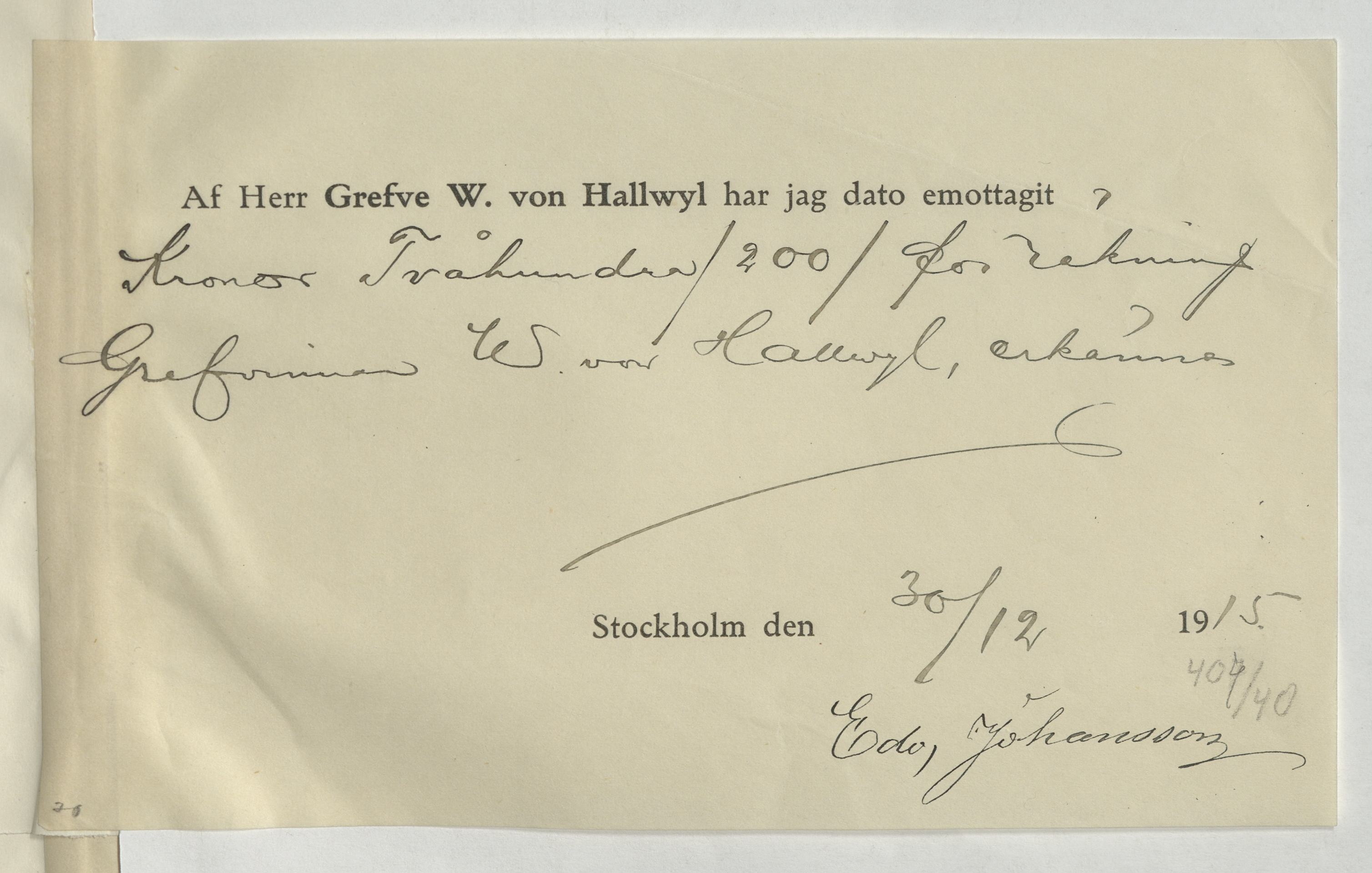 Kvitto från Edv. Johanson, Snickare. Gällande betalning för utfört arbete.
