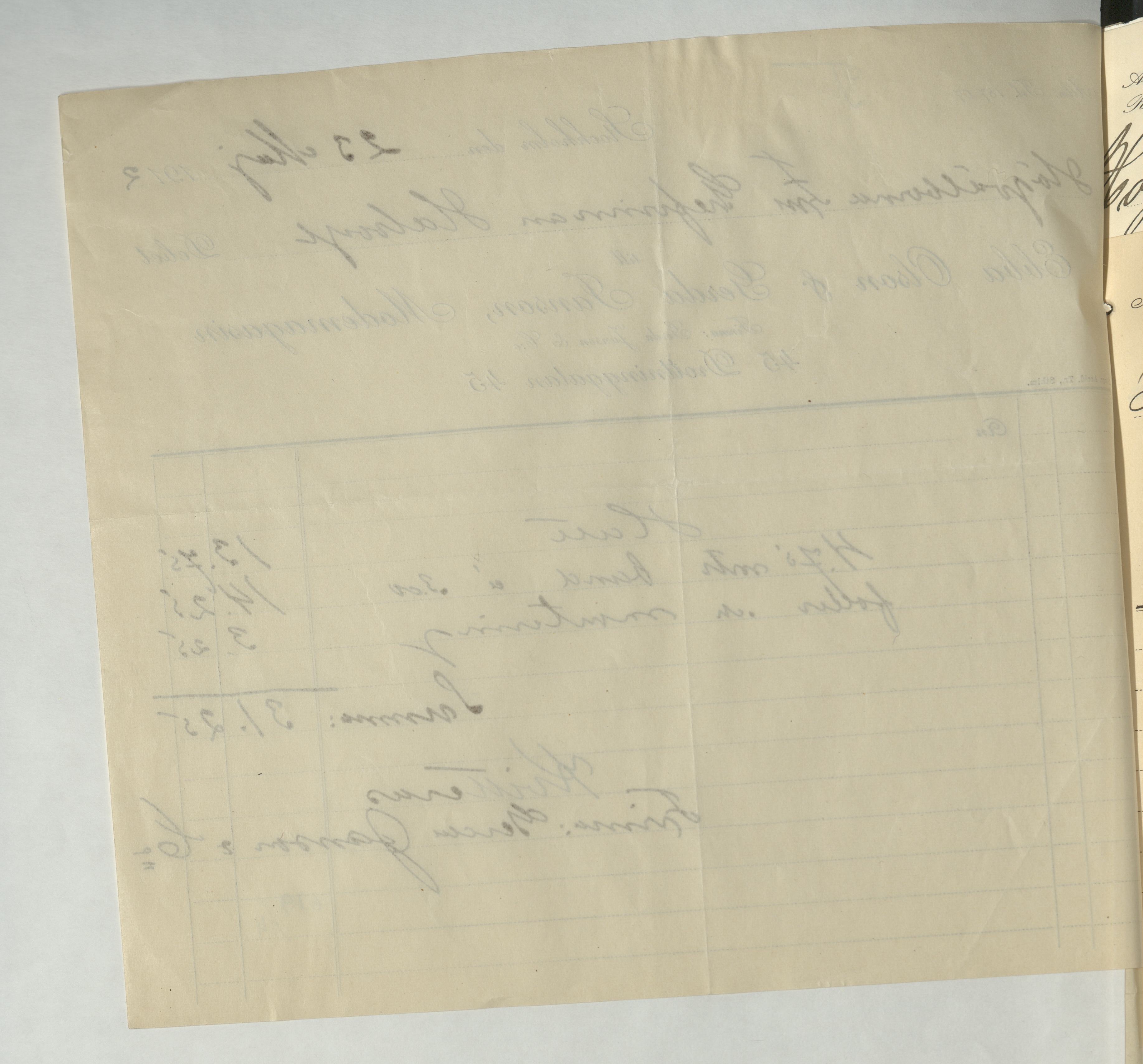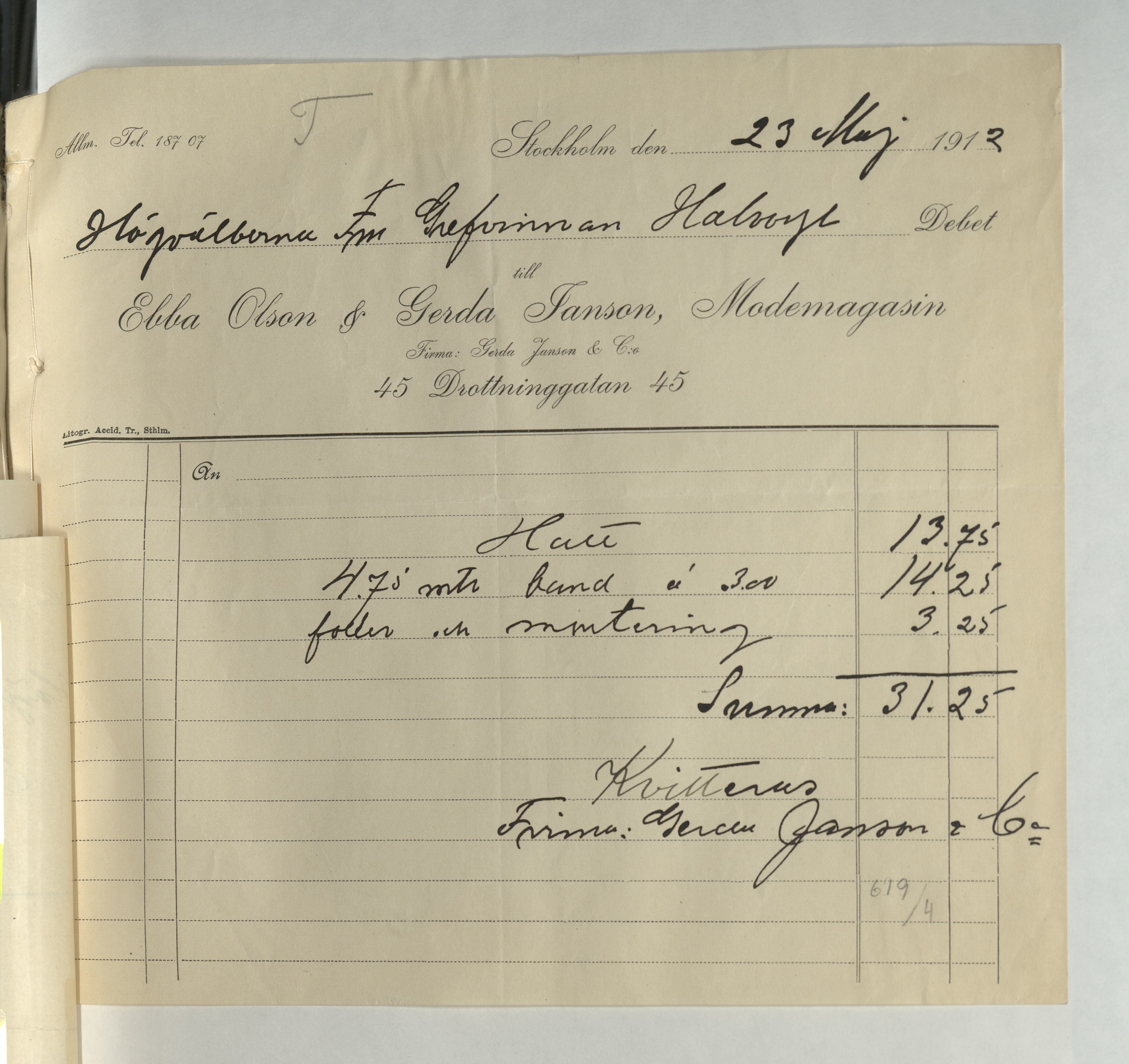 Kvitto från Ebba Olson & Gerda Janson, Modemagasin. Inköpt hatt med medföljande foder och montering, samt 4,75m band för en totalsumma av 31:25Kr. Betalt Stockholm 23 maj 1912.