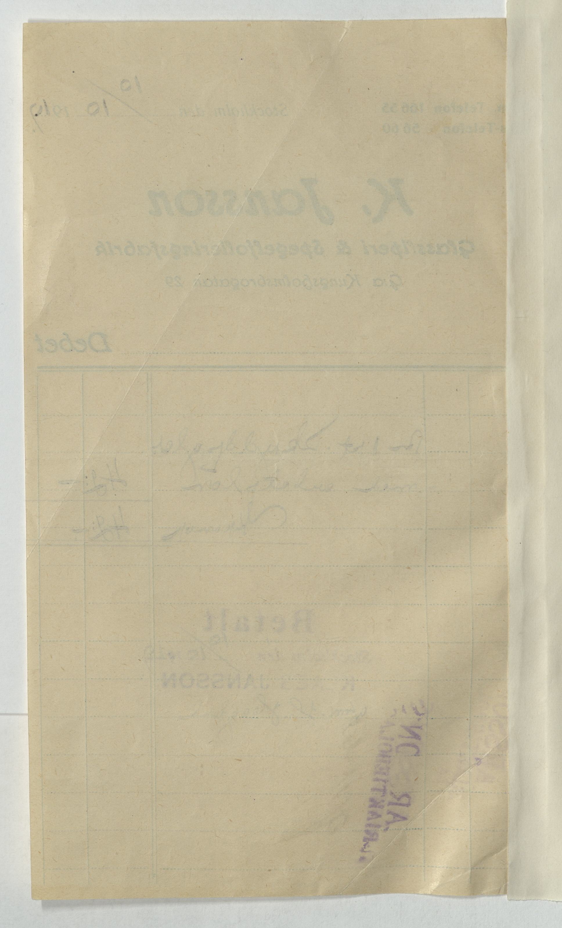 Kvitto från K. Jansson, Glassliperi & Spegelfolieringsfabrik
