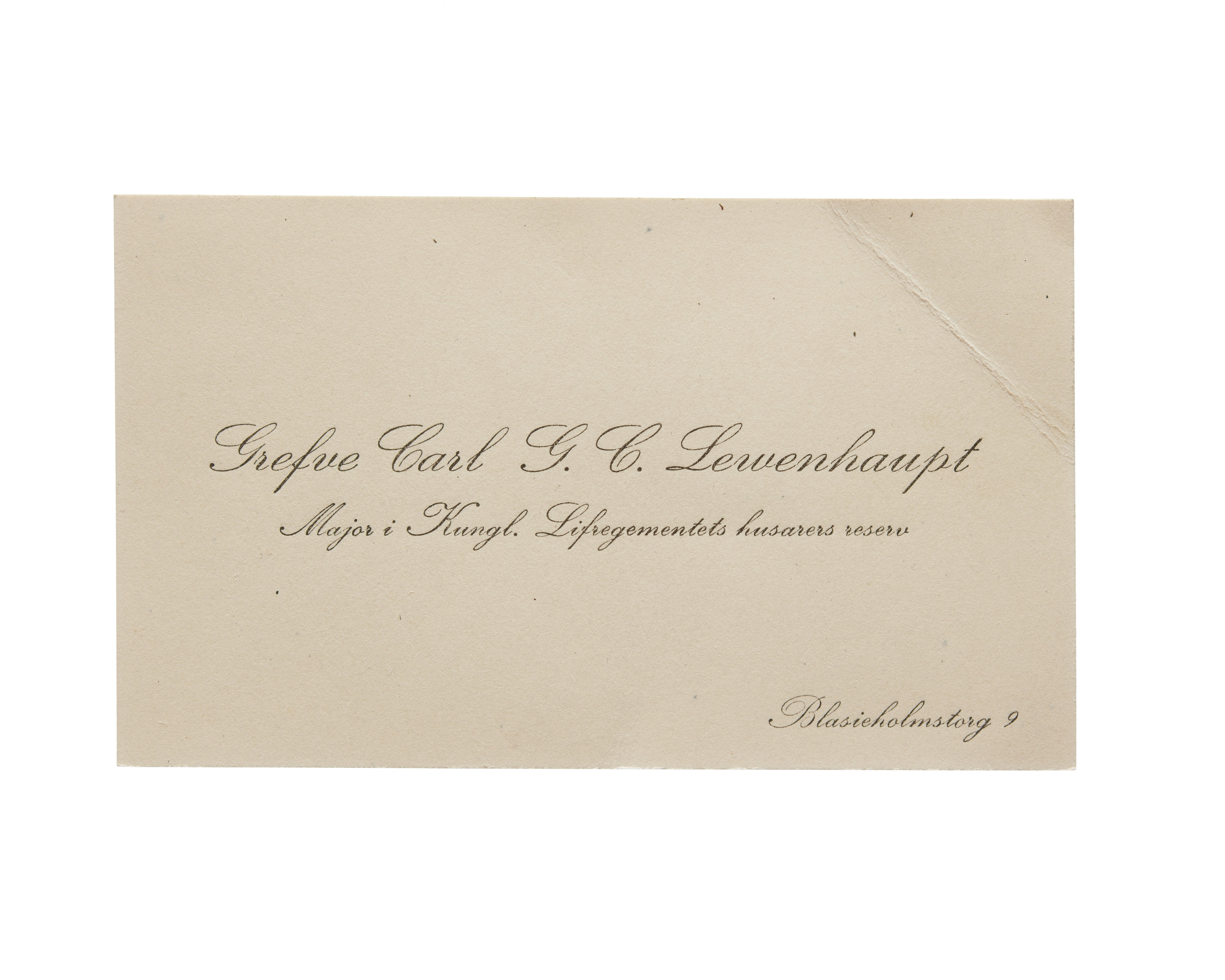 Visitkort från greve Carl G. C. Lewenhaupt, Major i Kungl. Livregementets husarers reserv.