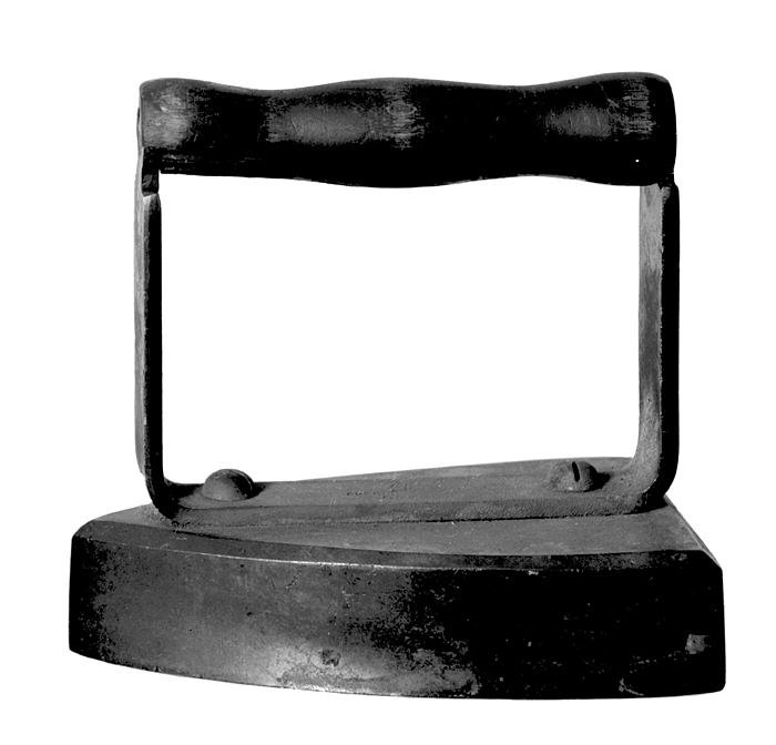 STRYKJÄRN. Av järn, gjutet. Massivt, platt, hjärtformigt samt med handtag; kring övre kanten en smal fas; handtaget bestående av en på järnets översida liggande platt skena med i rät vinkel uppböjda ändar, mellan dessa en svarvad kavel av björk, med rester av svart polering samt med spolformig mitt och utsvällda ändar; kaveln fäst i vardera änden medelst en skruv med insänkt platt huvud; skenan fäst vid järnet medelst två skruvar med kullriga huvuden. Höjd: 14,3 cm. Järn, längd: 15,3 cm.;bredd: 9,6 cm.; tjocklek: 3,4 cm