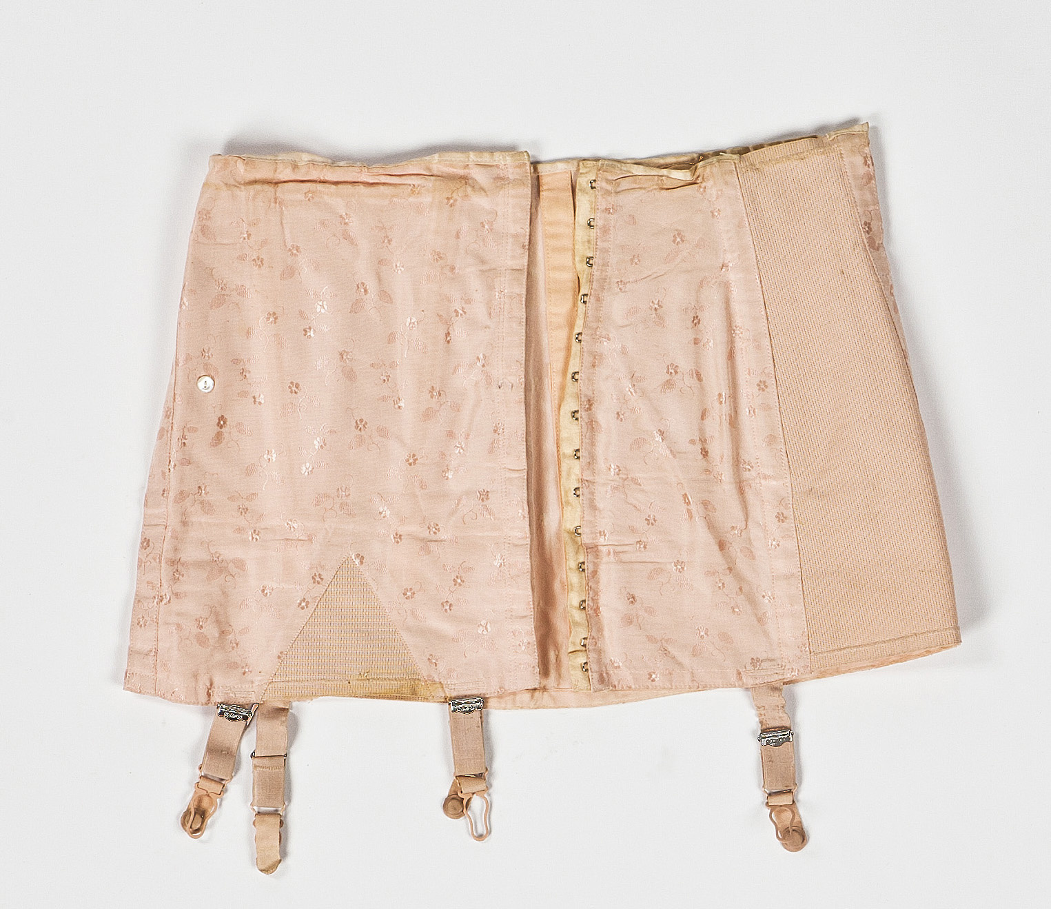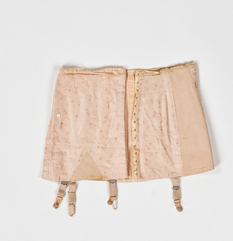 Av märket GERMA. Sydd i tre stycken framtill och fyra baktill samt resorstycken i saidan baktill. Framtill en bredare våd med en trekantig infälld kil nedtill i resår. Knäppning framtill på vänster sida, med 14 hyskor och hakar. Innanför knäppningen skyddas huden med en remsa bomullsflanell. Mitt fram finns en knapp och spår efter ännu en knapp. Kanske knäpptes BH:ns resårband mot dessa knappar? Mitt fram på låret och i sidan sitter strumpeband av resår med spännen. Söm mitt bak och totalt sex bakvåder inklusive resårvåderna. Höfthållaren är förstärkt med bomullsband på avigsidan vid alla sömmar. På insidan framtill finns en märkning " 363 84 841 0550,155" svårt att avgöra om det är åttor, treor eller nollor.