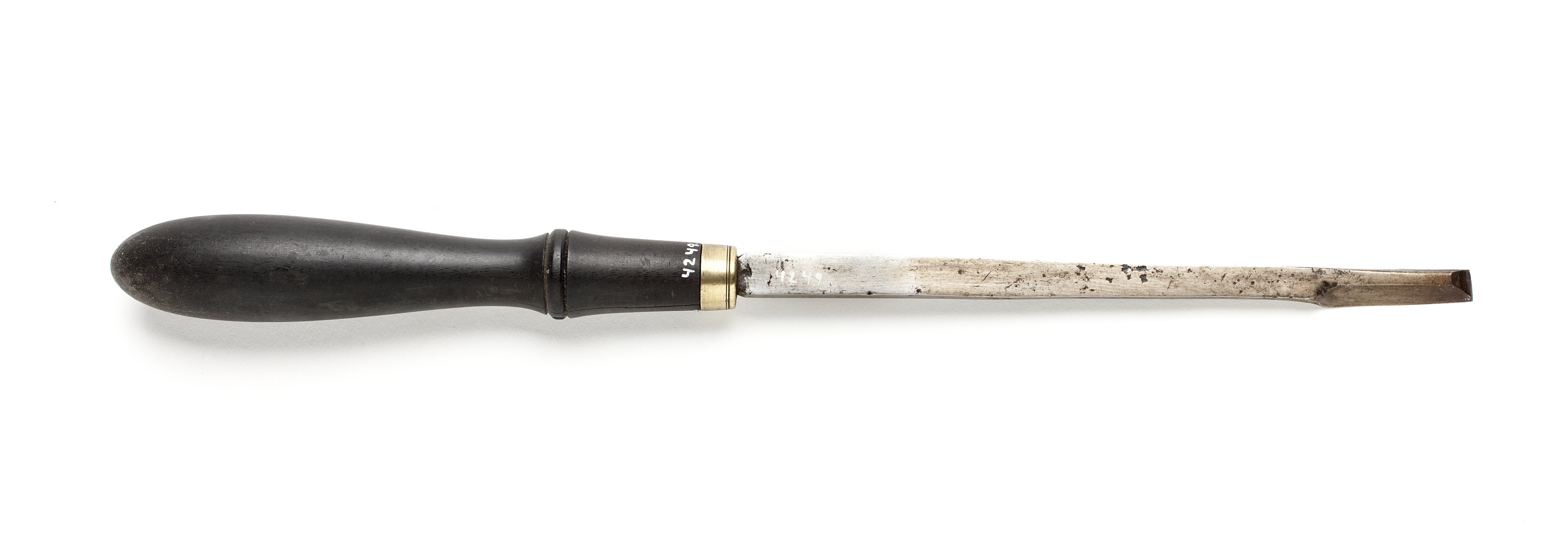 Klinga med rektangulär, i änden med trapetsformig, genomskärning. Lång egg efter ena sidan samt främre egg. Svarvat skaft av ebenholts med en vulst. Mässingsring. Stämplat på klingan: kugghjul med åtta kuggar.
