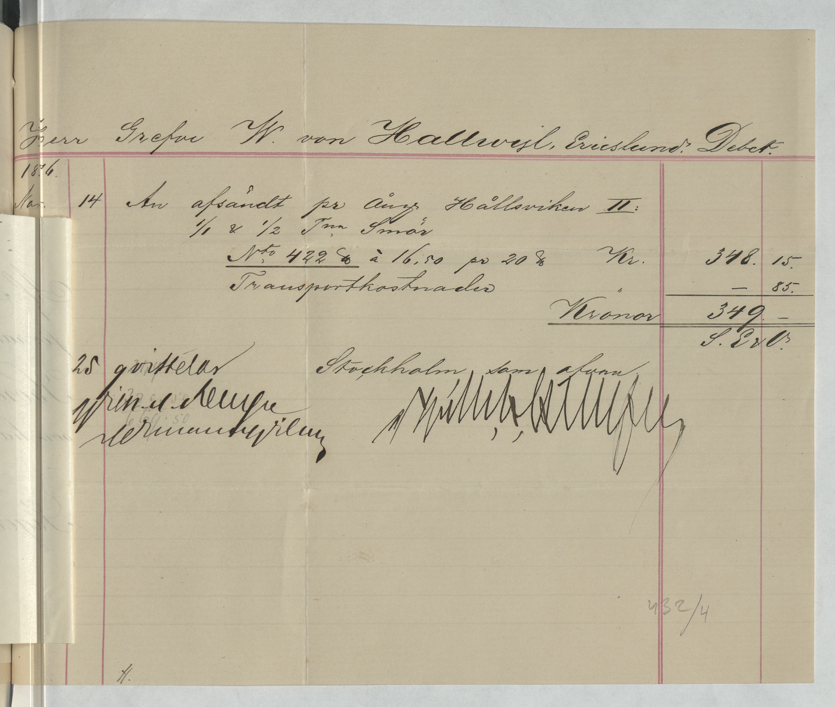 Kvitto från Firman Wilh. H. Kempe. Gällande inköp och transport av smör till Walther von Hallwyl på Ericslund 1875.