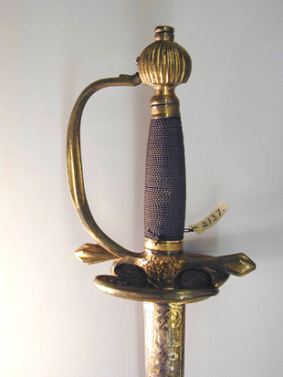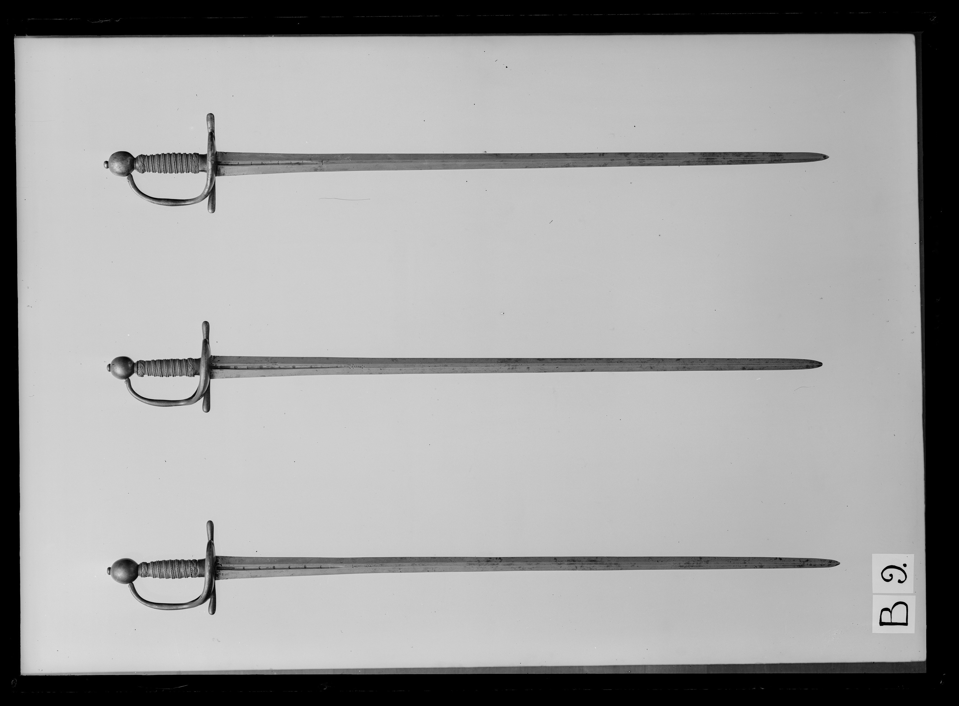 Fäste av förgylld mässing, typen återgående på den karolinska kommendervärjan. Knappen på markerat konvext insvängd hals, utsidan med vertikala räfflor, insidan slät, nitknappen cylinderformig i två avsatser. Kavellindning av tvinnad, förgylld, tunn koppartråd. Klinga rak, tvåeggad, baspartiet flackslipat, i övrigt sexsidigt slipad och med två längsgående hålkälar, en utmed vardera eggsidan. Ornering etsad och förgylld. Baspartiet och hålkälarna helt förgyllda, de senare fram till udden. Baspartiet med ornering av bandornament, upptill en halvrund palmett, i mitten på insidan med skrivstil: "ne me tire pas sans Raeson", på utsidan: "Ne me Remette point sans honneur", på insidan närmast baspartiet signering: "Fabrique Royale a Herzberg". Påmotsvarande plats på utsidan två bågformiga ornament, liknande ett monogram av dubbelt C. Härovanför mellan de förgyllda hålkälarna ett rankornament.