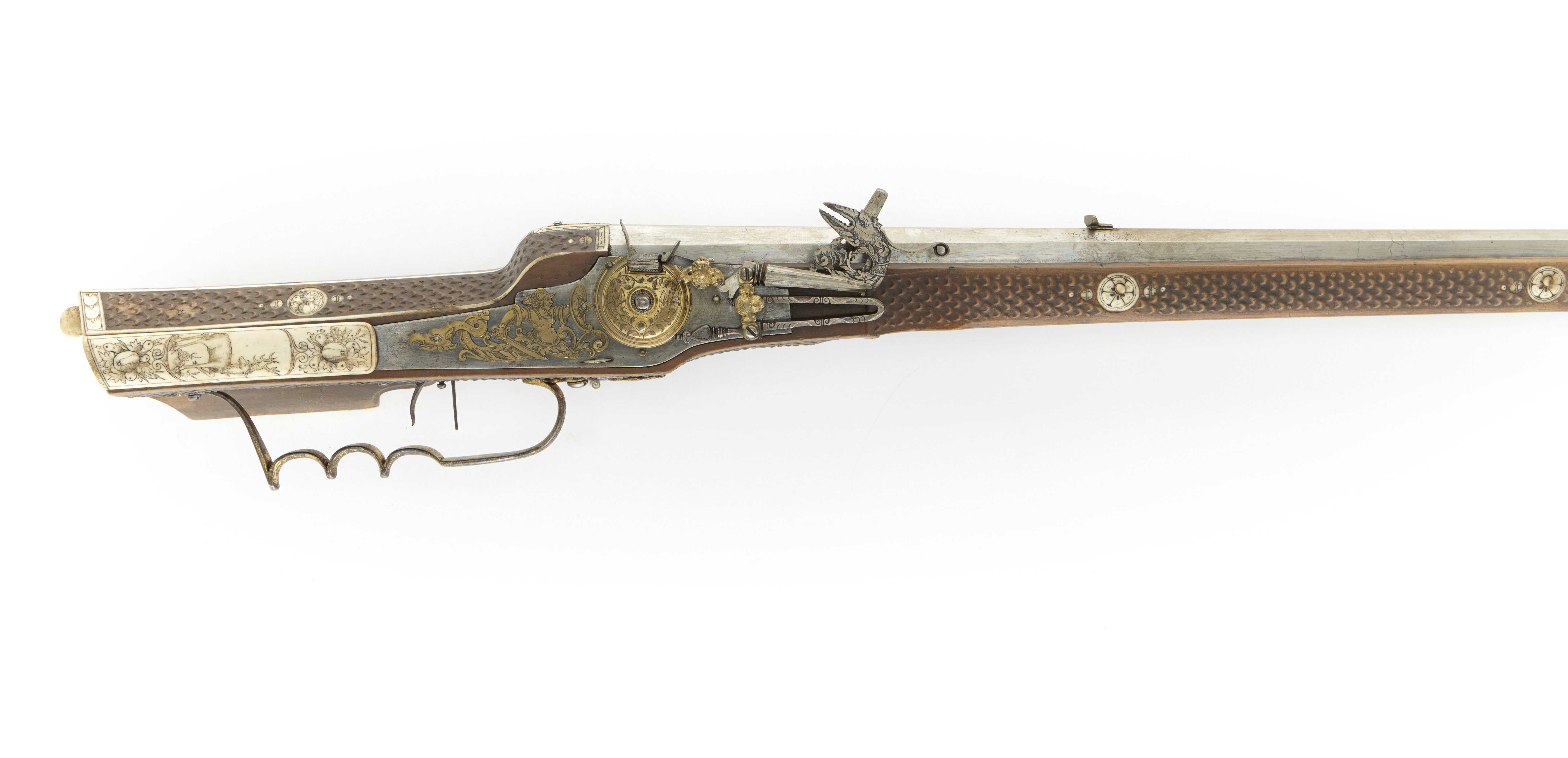 Åttkantig pipa av stål, 8 räfflor. Ståndsikte av stål, stolpkorn av mässing. Runt siktet punsad dekor. På pipans vänstra sida smedsstämpel i form av rosett (Stöckel nr 6456 - 6457, Sachsen, ca 1610-1620). Ursprungligen tre piphäften. Hjullås. Blånerat låsbleck av tysk typ - bakåt avsmalnande genom två fall. Kullrig hjulkapsel av mässing med graverade bladrankor. Tryckknapp och hanstudel av förgylld mässing i form av änglahuvuden. Bakom hjulet utskuret mässingsbläck i form av drakslingor omgivande antikiserande krigare. Vertikal krutskärm. Hane med lös överkäke. Käkarna utformade likt odjurshuvud, hankroppen med genombrutna ornament. Hel stock av trä (möjligen bok). Tysk kolvtyp. Bakplåt och stödkula av ben. Hela stocken med snidad fjälldekor. Inlagd med lister och plattor av ben. Kolvlådelocket helt av ben med graverad hjort omgiven av fruktknippen. Stocken dignerad "FF" på rund benplatta bakom svansskruvbladet. På anslaget vildsvin, utskuret ur ben. Två låsskruvar med runda benbrickor. Tre pipstift av ben med runda benbrickor. Näsband och rörka av ben. Varbygel av förgyllt stål, punsad dekor, 3 fingerlägen. Avtryckare med snälltryck. Tillbehör: Laddstock med doppsko av ben. Krats. Märkt: 651 ovanför låsblecket, stanstyp 5376. 6 med blyerts på anslaget.No 8 på papperslapp på kolvens undersida. Enligt 1710 års inventarium p. 15, rum II: "72-651-1 Studzare utskuren stock, med muslor, förgylt puckla öfwer Hiulet förgylt Garnering på låset och förgylt rijtat bygell...-8-".