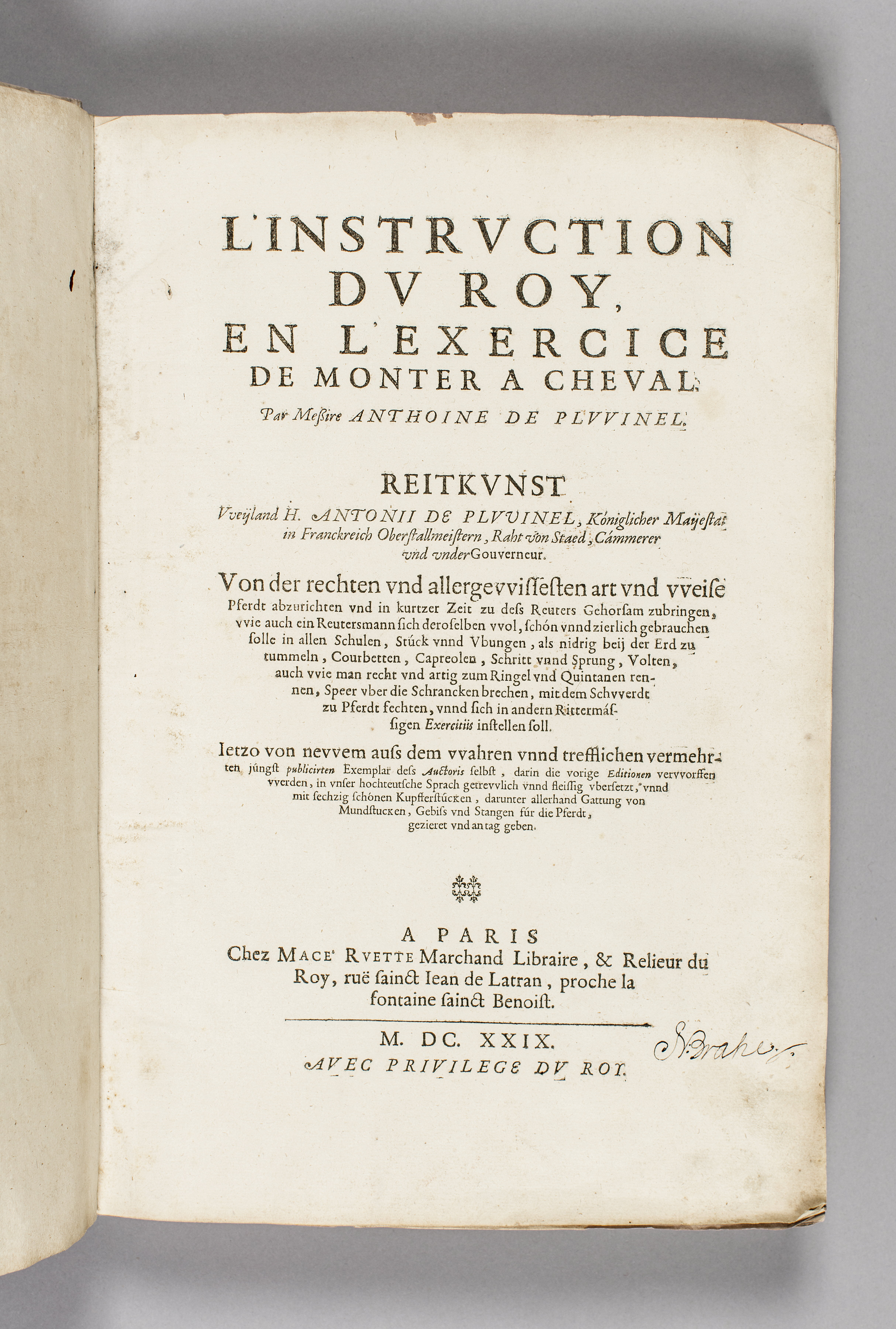 L´instruction du Roy, en exercice de monter a cheval...Reitkunst...von der rechten....weise Pferdt abzurichten...Jetzo von newem auss dem...Exemplar dess auctoris selbst...ubersetzt, unnd mit sechzig...Kupfferstucken...an Tag geben.
