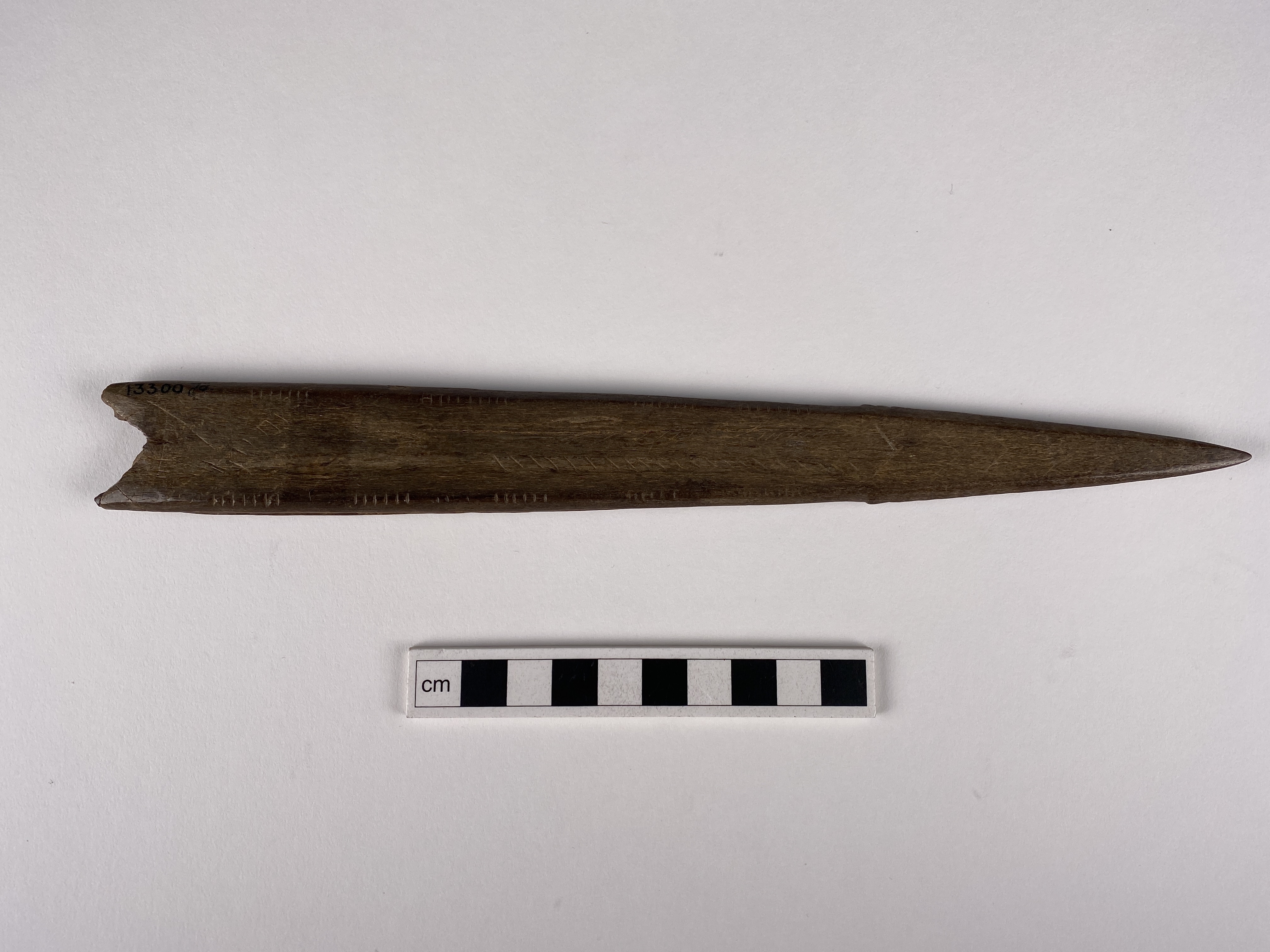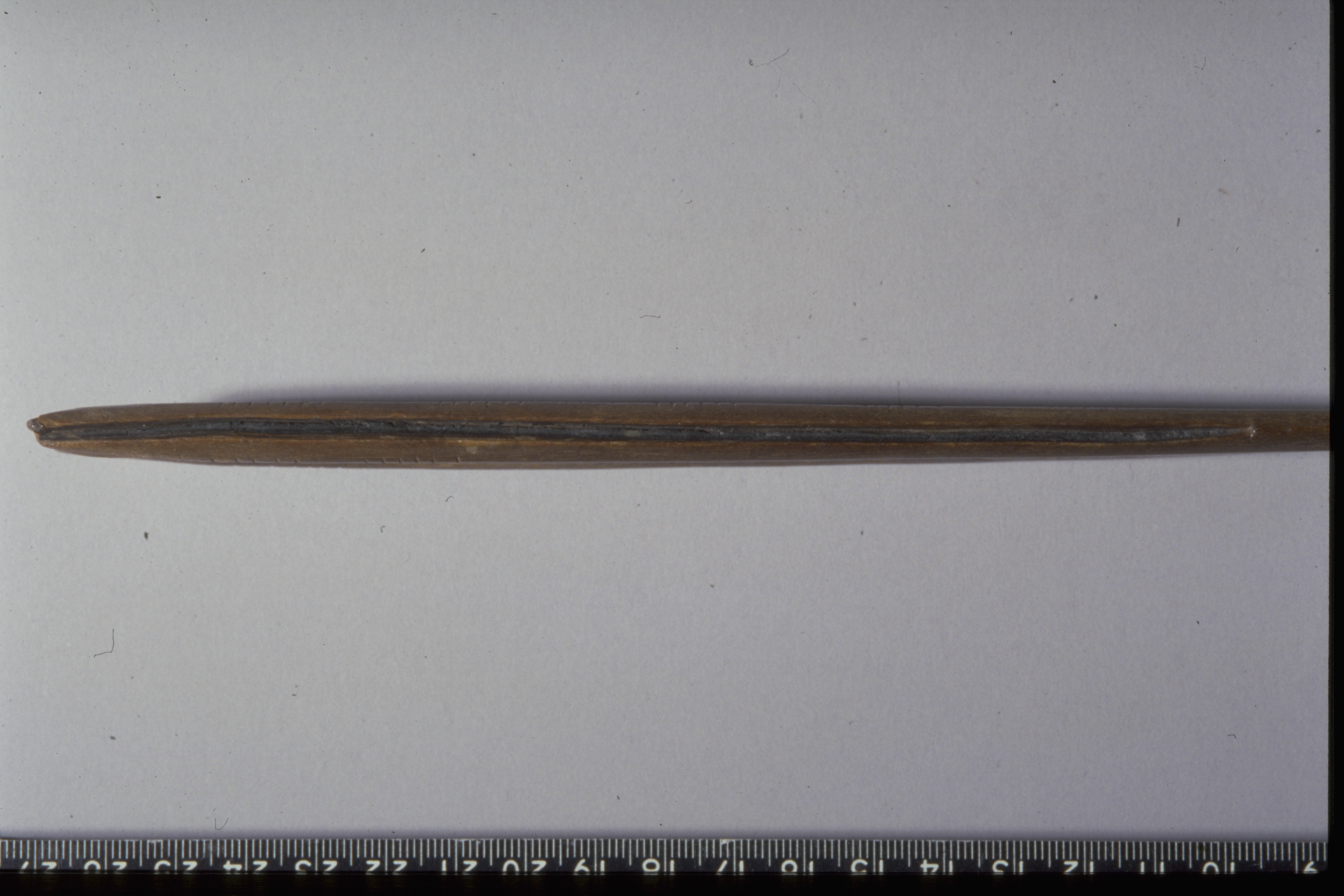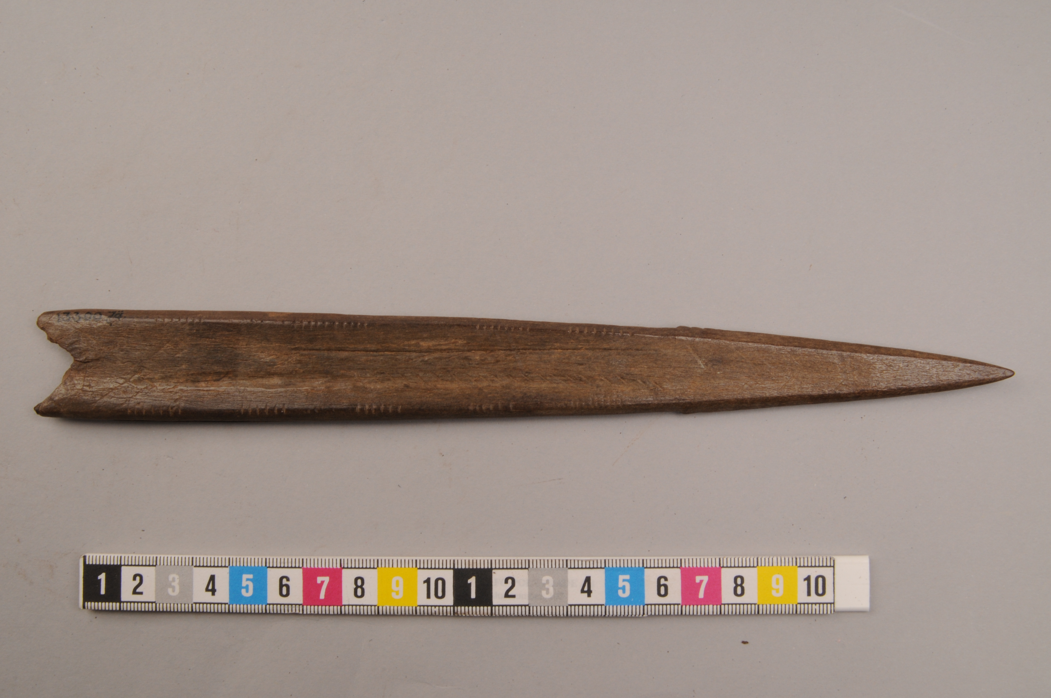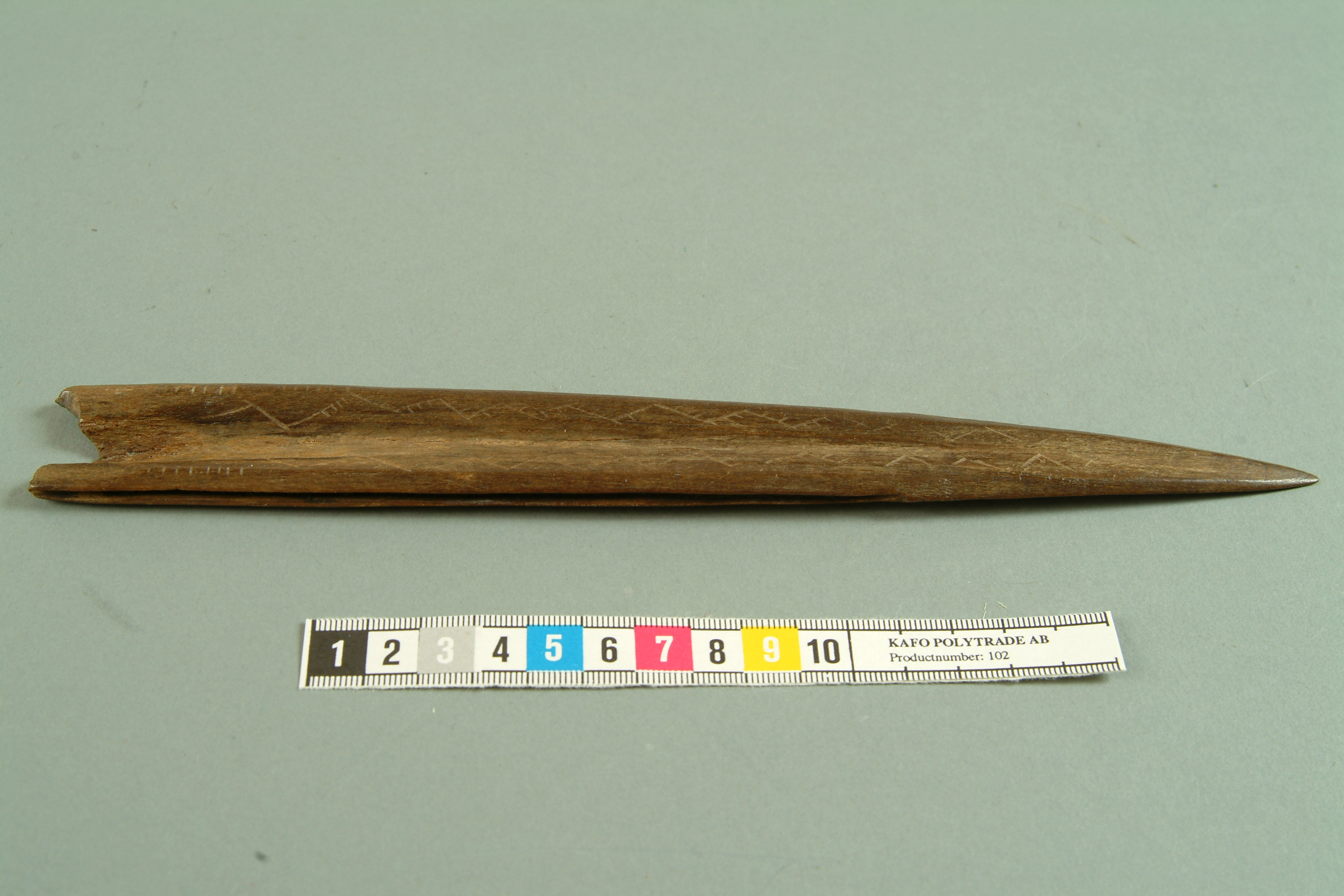 Spets av ben med kantfåror för flinteggar, ovanligt stor och bred. Utmärkt vacker med rik linjeornering, olika på båda sidorna.